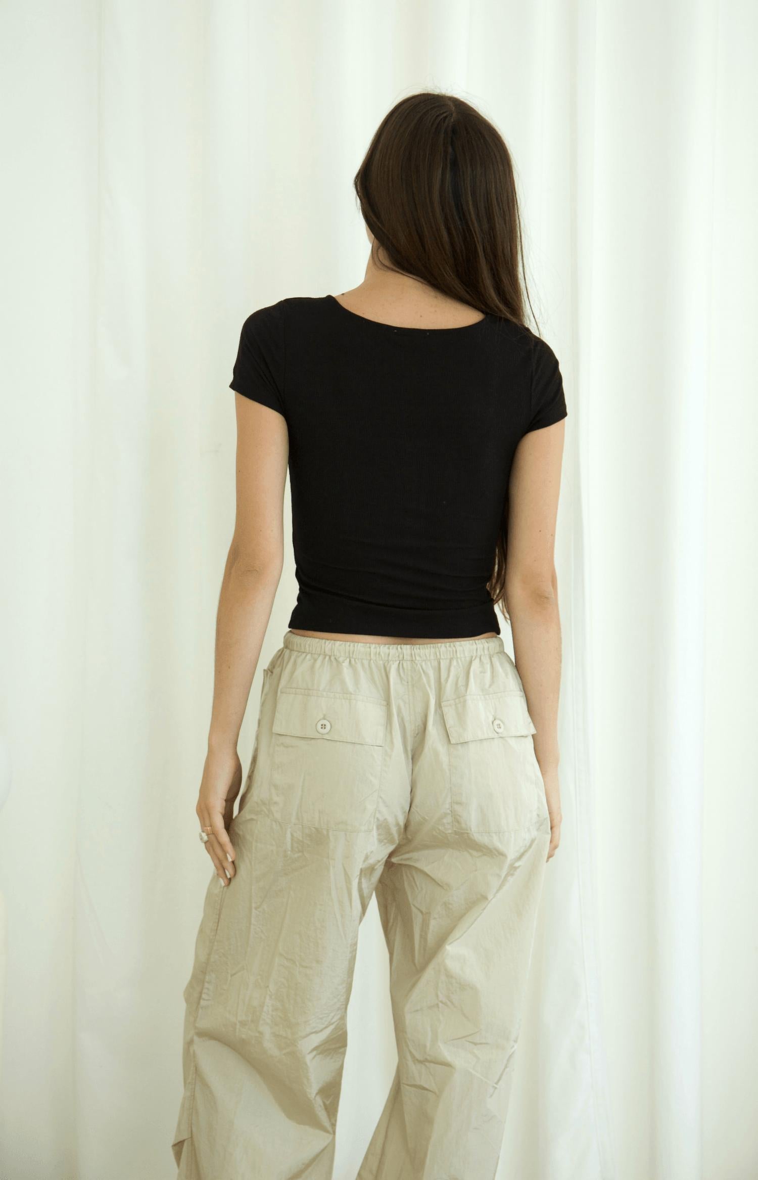 Experience effortless style with the Angelica Cargo Parachute Pant by PAPERMOON, a must-have for any wardrobe. These taupe pants feature a low rise and wide leg design, enhanced by drawstrings at the waist and leg openings for easy adjustment. With a pull-on closure and pockets for convenience, these solid pants ensure comfort and style during the warmer months. Perfect for a trendy, casual look with its Y2k vibe.
