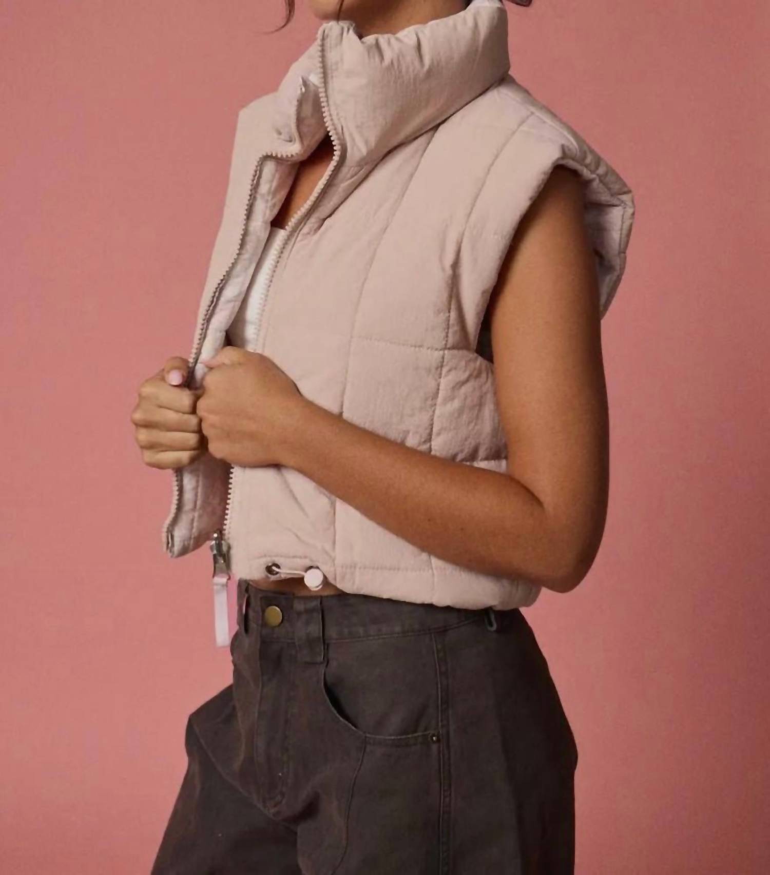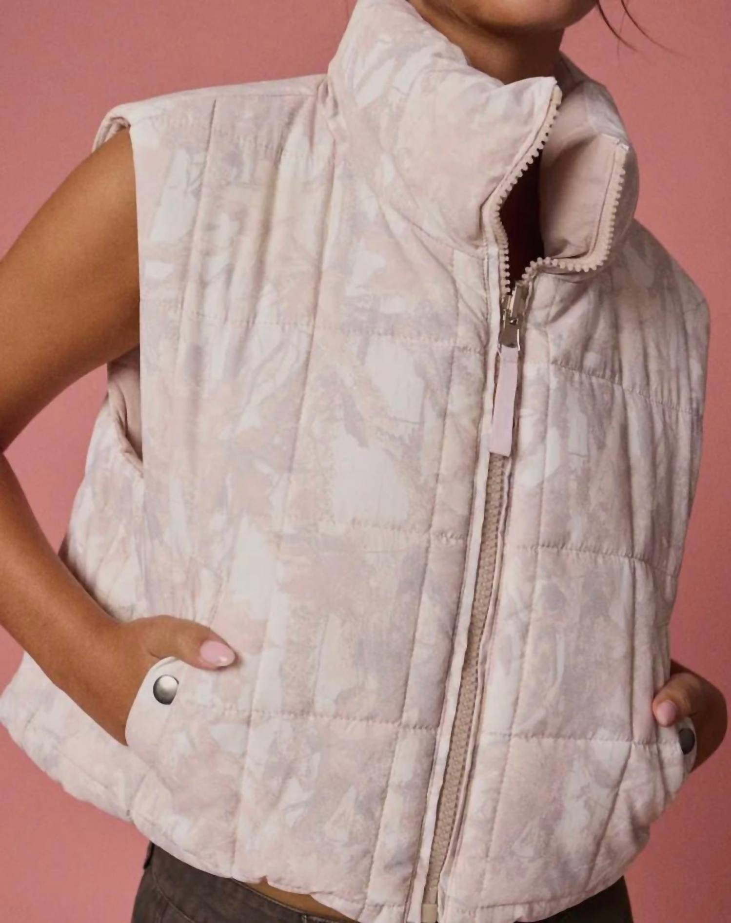 A vest so versatile you can mix and match it with almost any outfit and it will feel brand new every time. Stay stylish with the PAPERMOON Camo Cropped Puffer Vest, the perfect fall layer for every trendsetter. This sleeveless vest, featuring a playful cropped silhouette, is made from Faux Fur and showcases a soft camouflage pattern in beige. Originating as a versatile piece for any wardrobe, it is equipped with a cozy high mock neck collar and secure snap-button pockets for added practicality. Closure: Full-zip. Suitable for travel and minimalist trends.