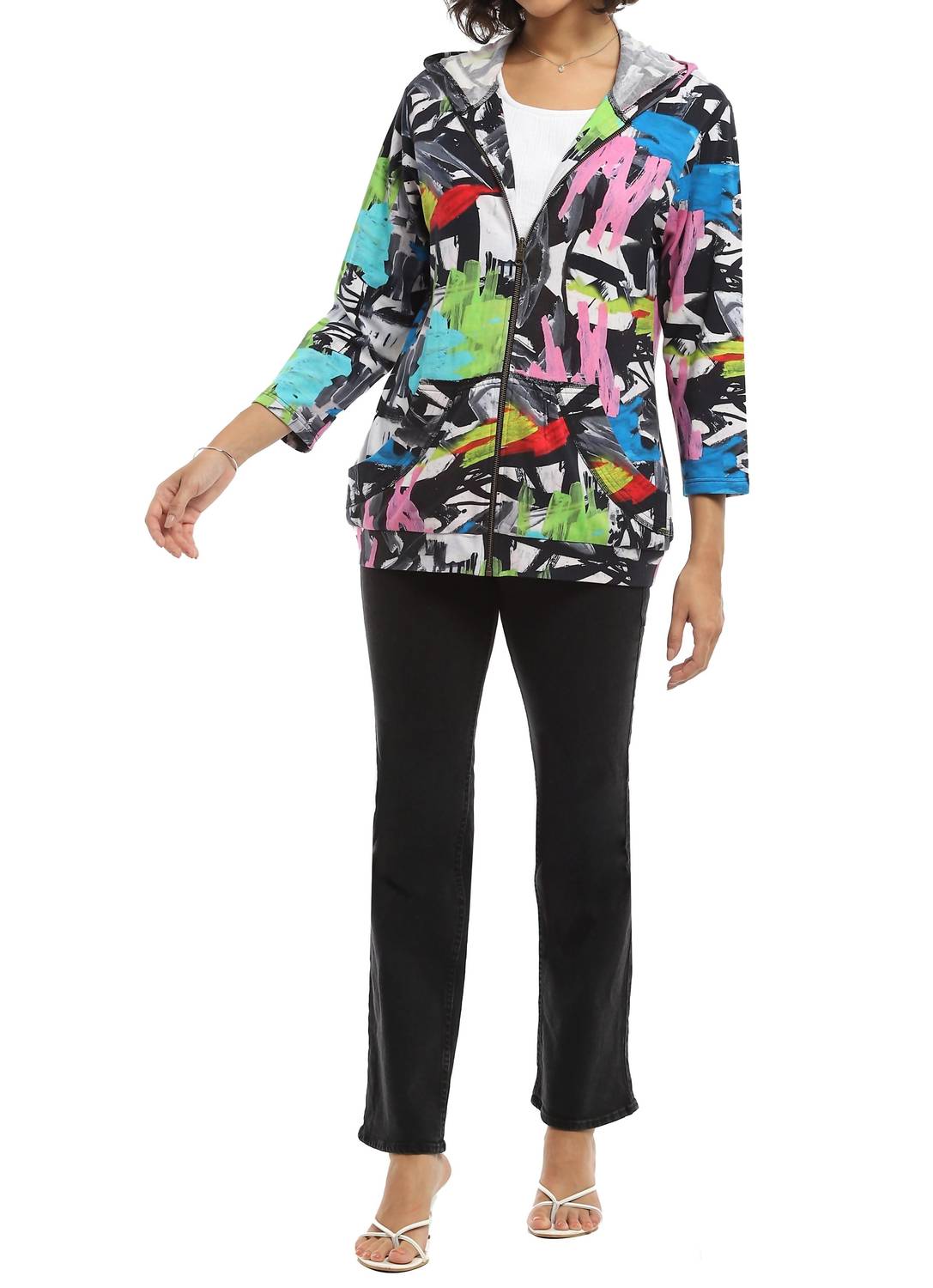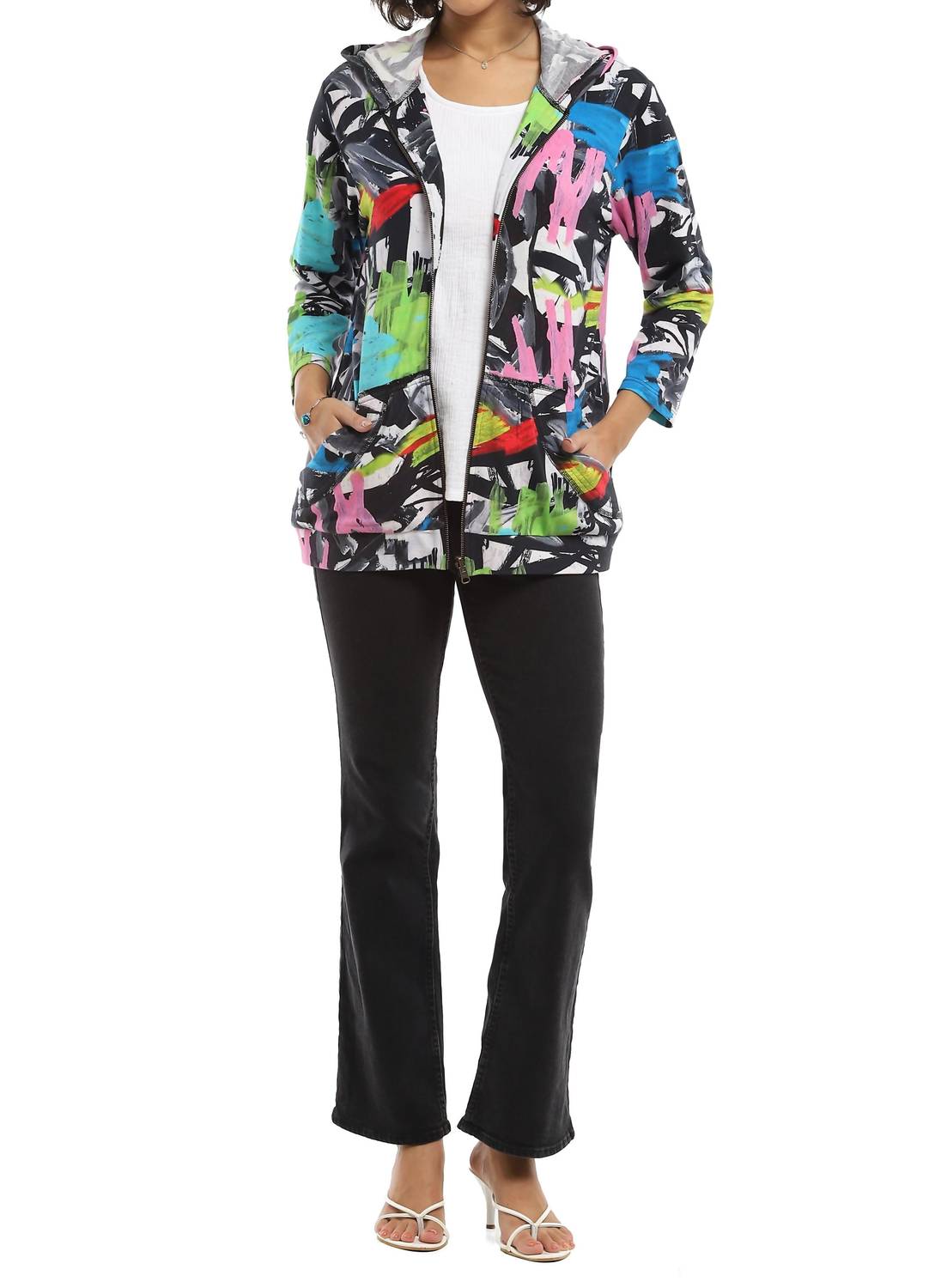 Cute, casual, and comfortable. This jacket is a must have. Elevate your travel wardrobe with the Vita Hoodie Jacket by Parsley & Sage, a perfect blend of style and comfort. Crafted from 55% Cotton, 40% Rayon, and 5% Spandex, this cotton blend casual jacket features a multi-colored, patterned design ideal for the fall season. Designed with three-quarter sleeves and a hooded neckline, this jacket comes complete with a convenient zip closure and functional pockets. Care is simple, as it is machine washable and can be tumble dried.