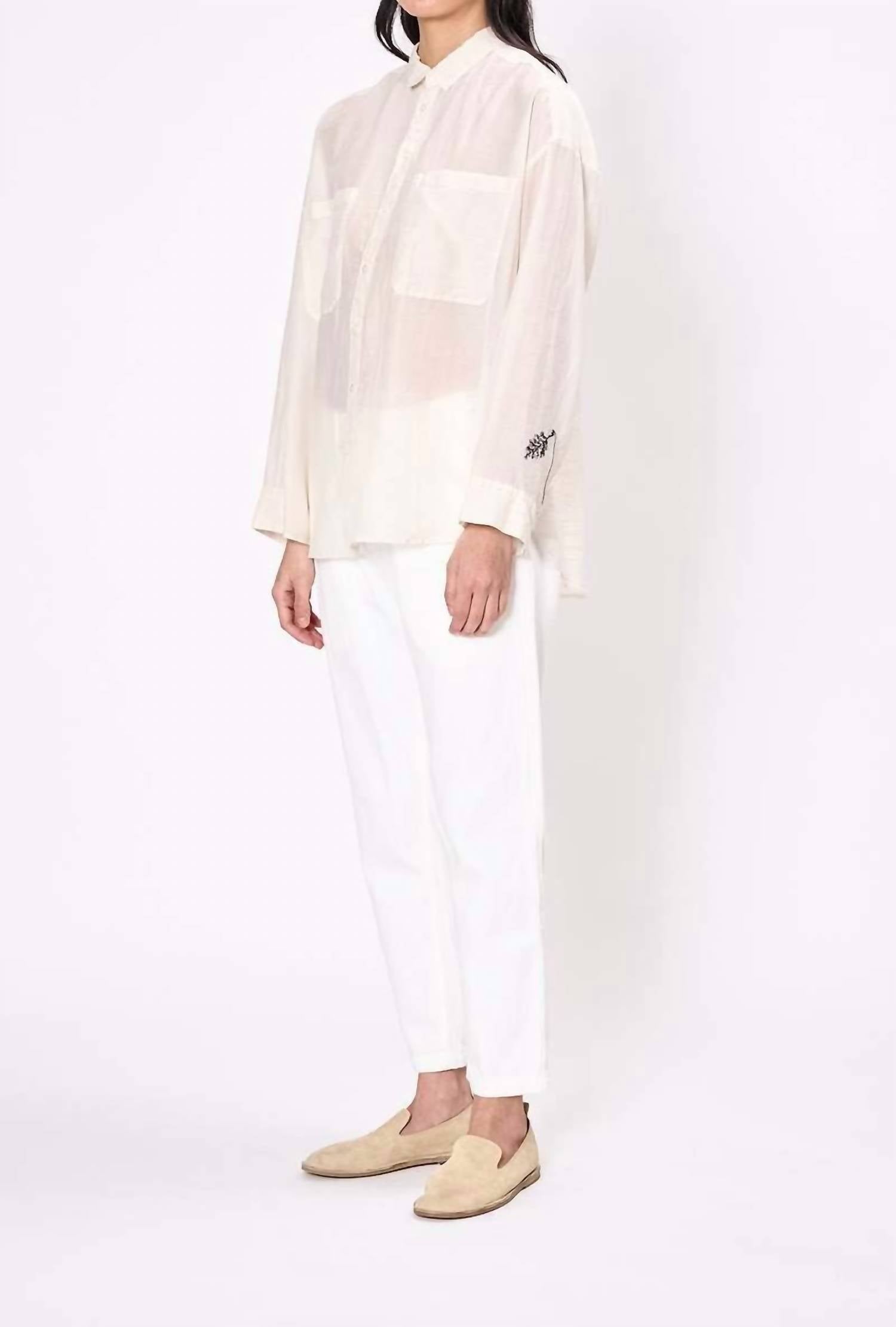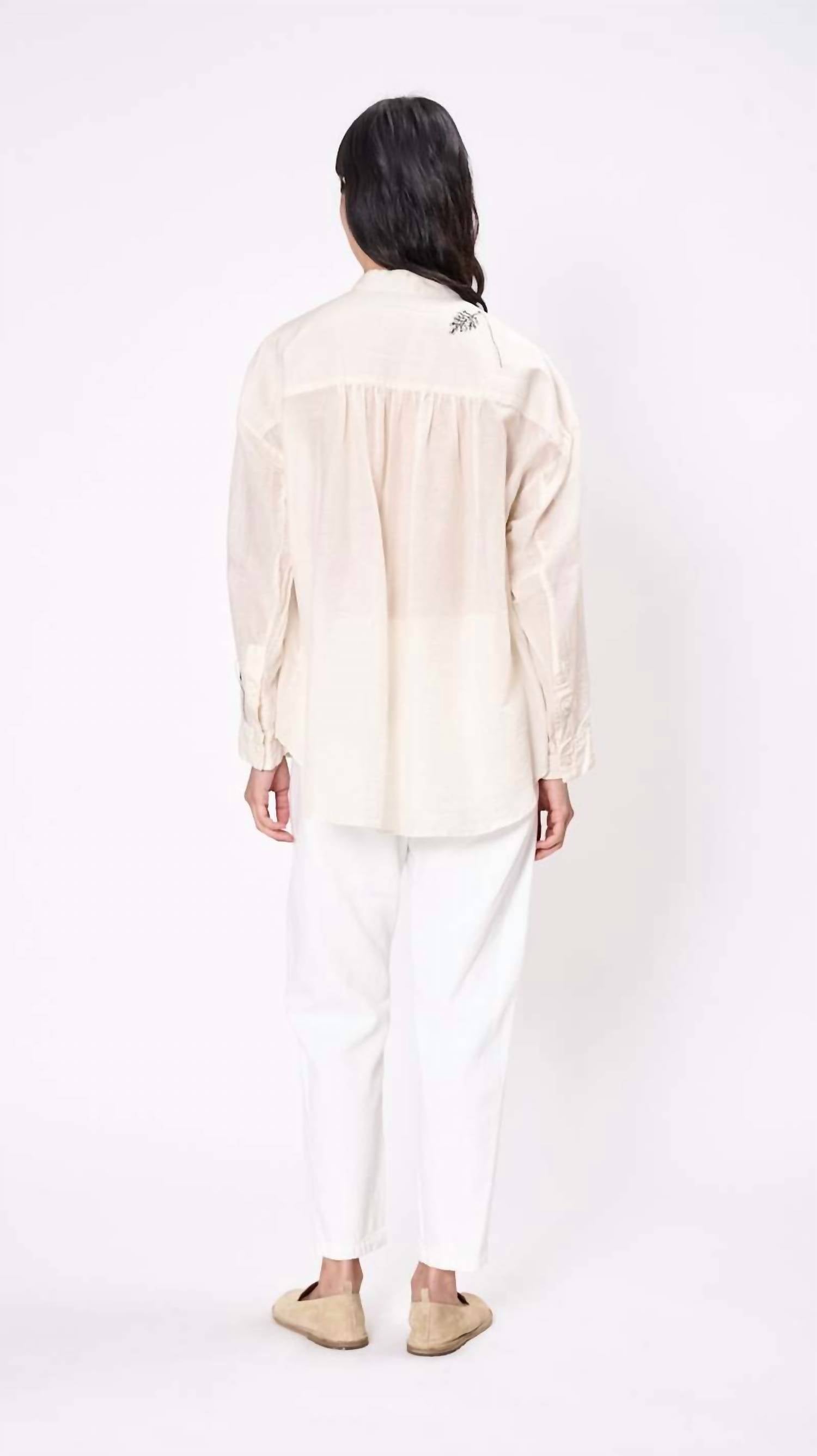 The Wildflower Embroidered Blouse by Pas de Calais is an elegant addition to any wardrobe with its long sleeves, expertly crafted from a cotton and silk blend for a luxurious feel. This ivory blouse, featuring a crinkle texture and intricate embroidery on the cuffs and back, is made in Japan, showcasing the brand's dedication to finely detailed craftsmanship. The oversized, collarless design boasts a button-front closure, making it a chic choice for spring travel or workwear. Care for this exquisite piece by hand washing it and drying in the shade to preserve its quality.