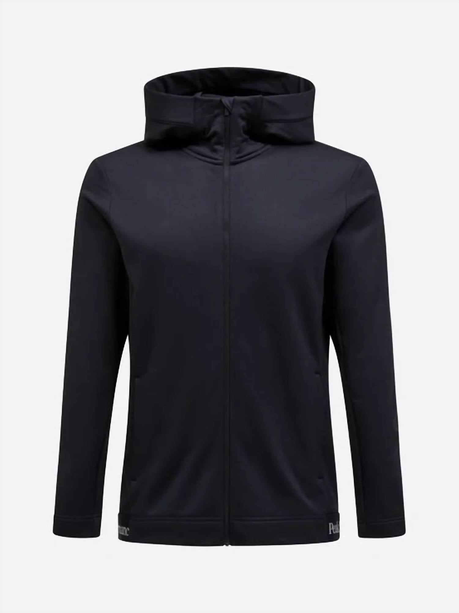 Introducing the Rider Tech Zip Jacket by Peak Performance, designed for the modern outdoorsman. This black hoodie features long sleeves and a high-fitting hood, combining style with functionality. Made from recycled material, it offers a soft, stretchy feel while being moisture-wicking and quick-drying, ideal for hiking and other active endeavors. The jacket has a convenient zip closure and includes pockets for added utility. Care: Machine wash and tumble dry.
