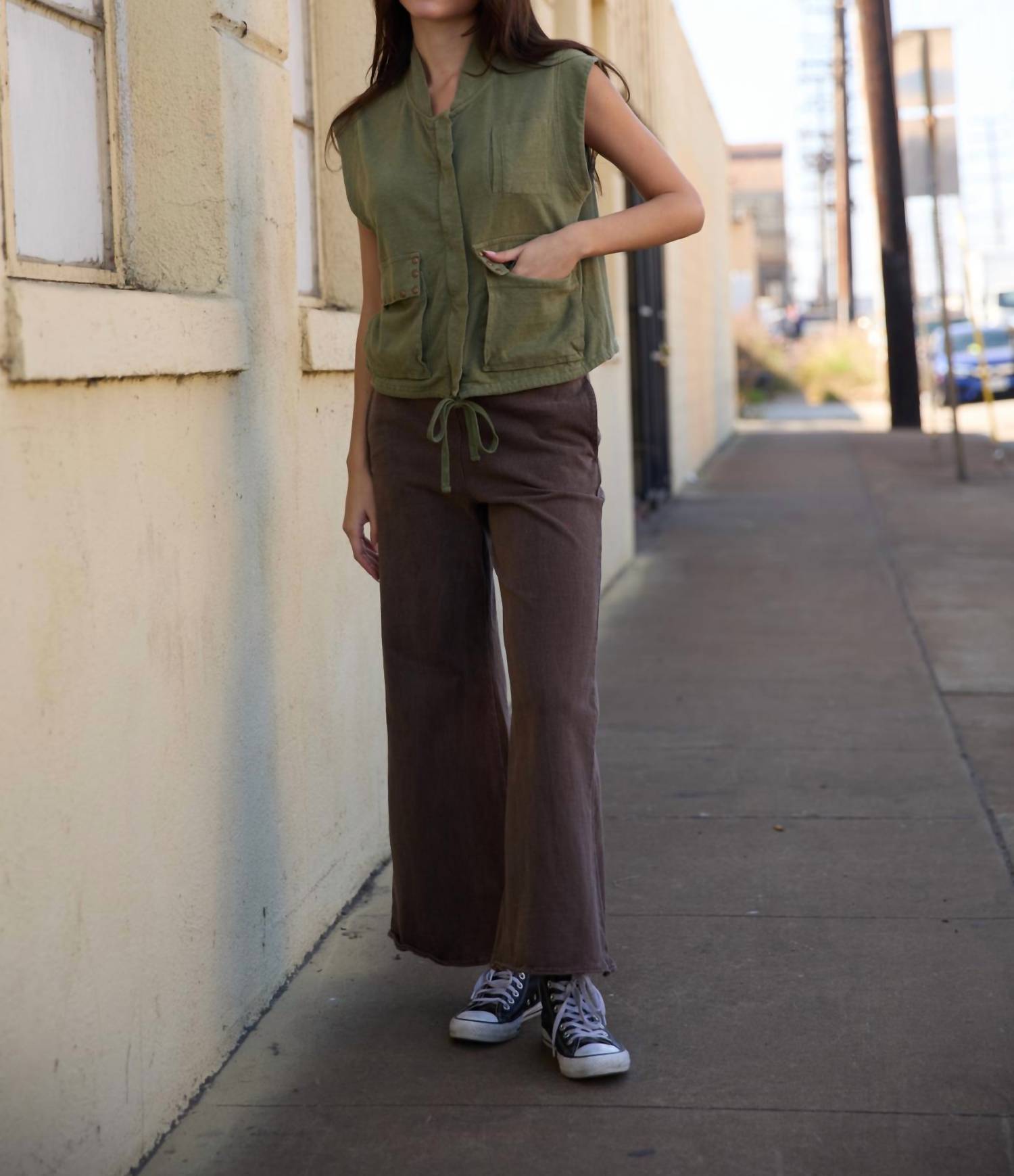Throw this vest over an all black outfit for a perfectly polished look. Introducing the Briar Vest by People of Leisure, a sustainable choice crafted from an eco-conscious blend of 50% hemp and 50% organic cotton. This sleeveless vest in vintage black offers a structured fit with functional pockets, perfect for those seeking minimalist style with a touch of rugged elegance. Closure: Zip closure. Care: Machine wash cold/warm, tumble dry on low. Please wash separately before first wear to maintain quality and avoid dye transfer.