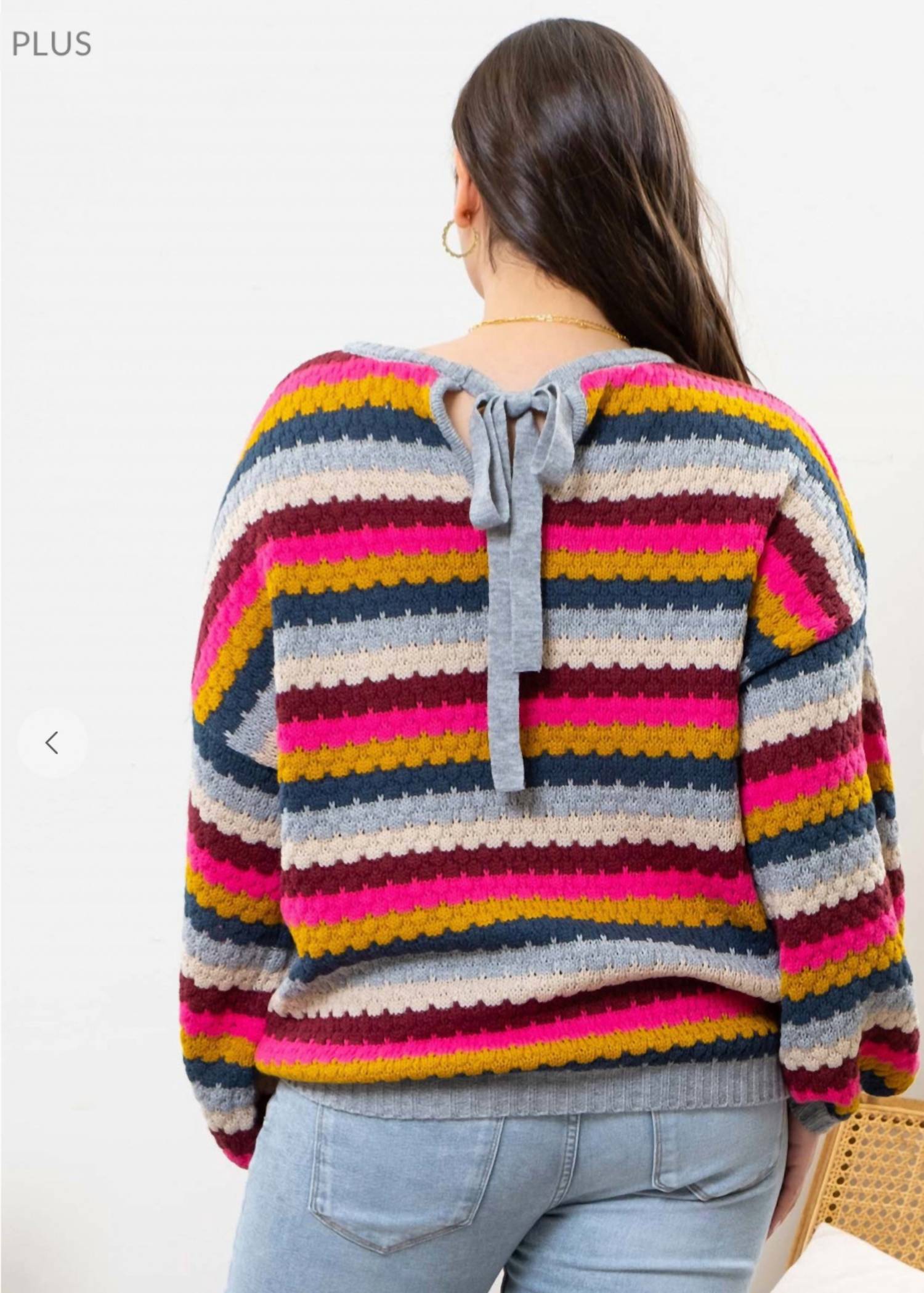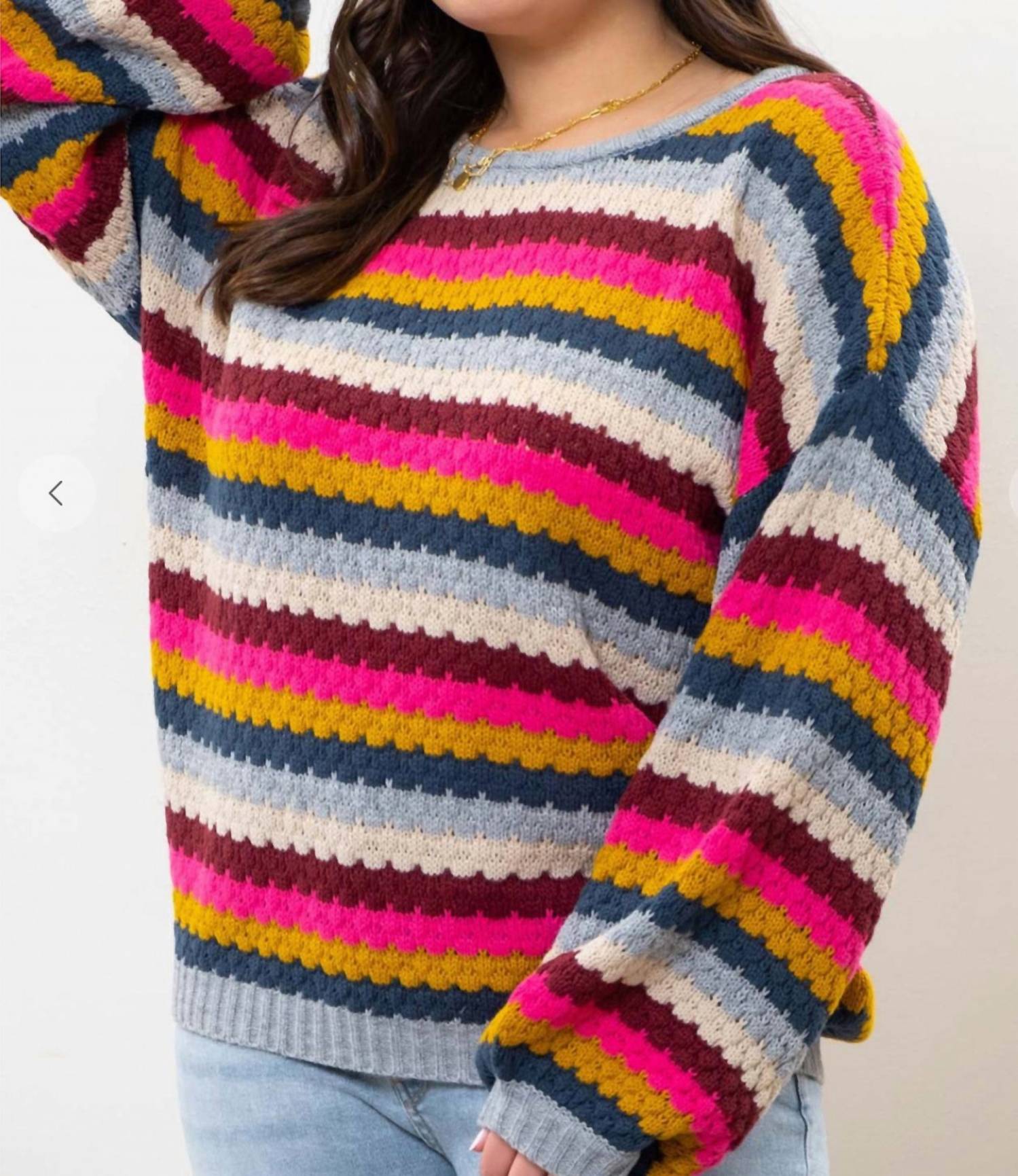 Experience cozy style with the Stripe Sweater - Plus by Perch, designed with eye-catching fuchsia multi stripes, perfect for fall occasions. This women's sweater features a classic crewneck and flattering long sleeves. Crafted from 100% acrylic, it is finished with a charming keyhole tie closure at the back. Ideal for maximalist trends, add this vibrant piece to your vacation wardrobe.