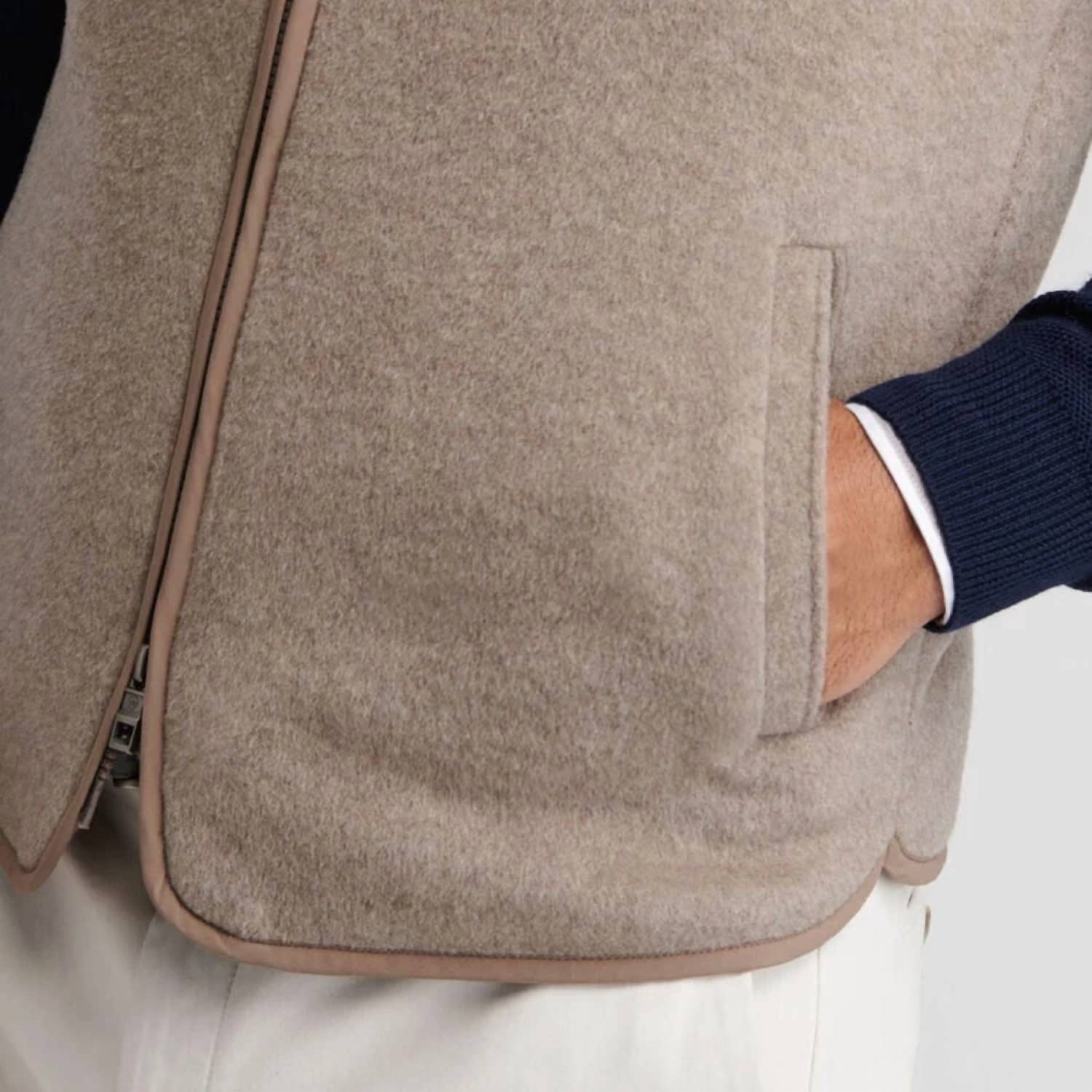 Formerly known as Crown Flex Fleece, this versatile layer highlights the luxurious feel of our exclusive stretch knit Merino wool. Lightly lined and padded this season, it’s the perfect multi-purpose piece to be worn casually or dressed up over sport shirts and sweaters. The design has been softened slightly with a scalloped hem, angled side pockets and a new zipper.