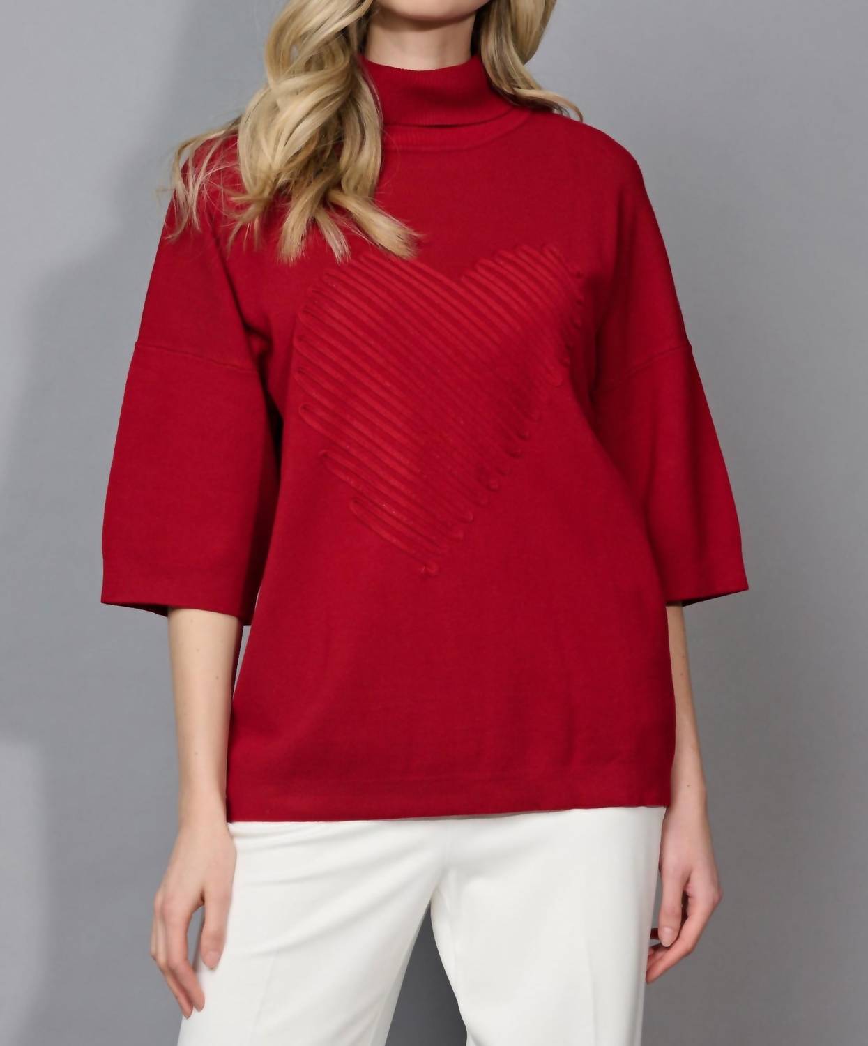 A classic staple that every closet needs. The Picadilly Heart Embellished Top in Sangria is where romantic meets fun. Featuring a turtleneck and three-quarter sleeves, this medium-length top is made from a sweater-knit fabric composed of 80% Rayon and 20% Polyester. With its relaxed fit and delicate heart embellishment, it is perfect for adding a sweet touch to your spring holiday party outfit. Closure: Pull on. Care: Machine wash cold.