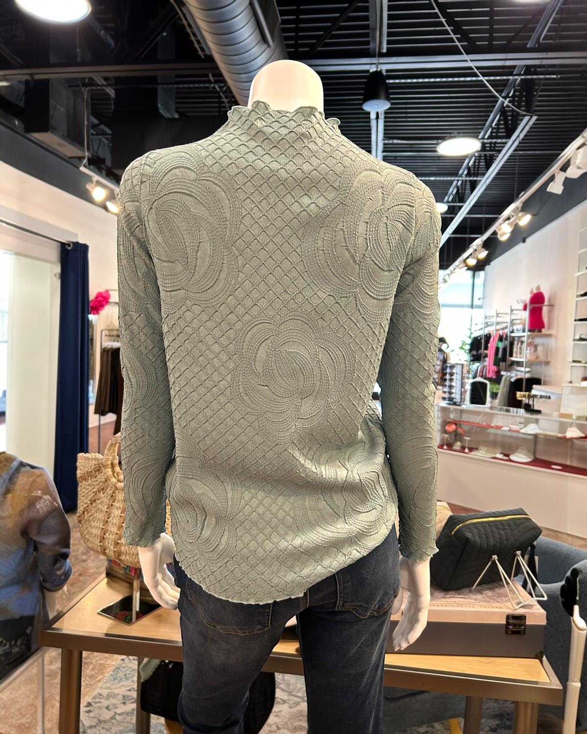 The ultimate go-to sweater, expertly crafted to provide the perfect combination of warmth and style. Its classic design and soft fabric make it a must-have addition to your wardrobe. Introducing the Women's Pleated Rose Top by PICADILLY, designed in an elegant Dusty Jade hue. This long-sleeve top is crafted from 100% Polyester, featuring a textured pattern and relaxed fit. It sports a classic crewneck and is perfect for holiday parties or any chic occasion. Closure: Pull on. Care instructions: Machine wash cold in a washing bag.