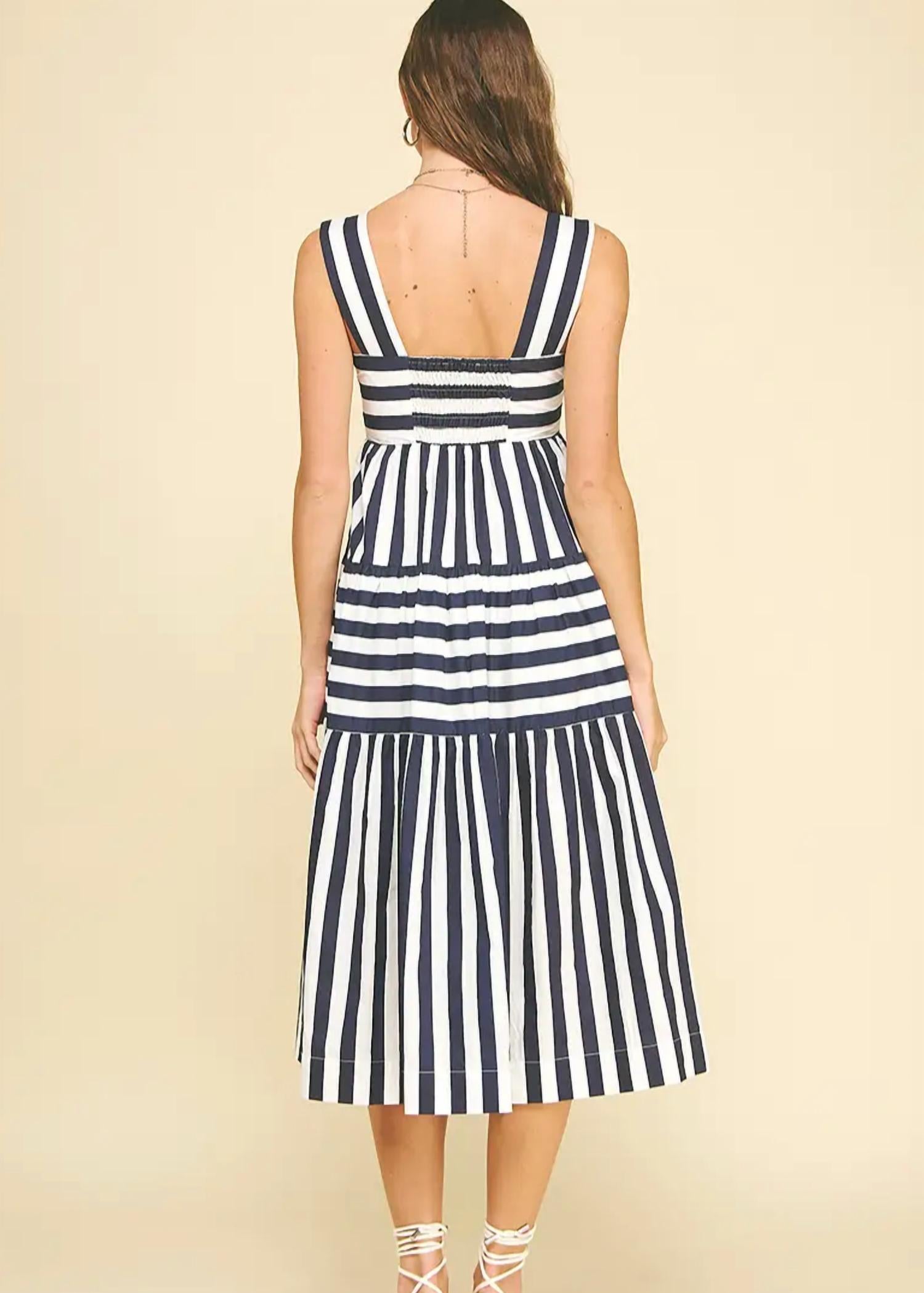 The perfect length dress does exist. Elevate your spring wardrobe with the All You Need Stripe Midi Dress by PINCH, crafted from comfortable cotton for a breezy feel. This navy and white striped dress features a sleeveless design with a square neckline, perfect for warmer days. The elegant A-line silhouette is enhanced by a tiered skirt and smocking detail at the back. Ideal for vacation or Thanksgiving gatherings, it's a nod to 90s fashion trends.