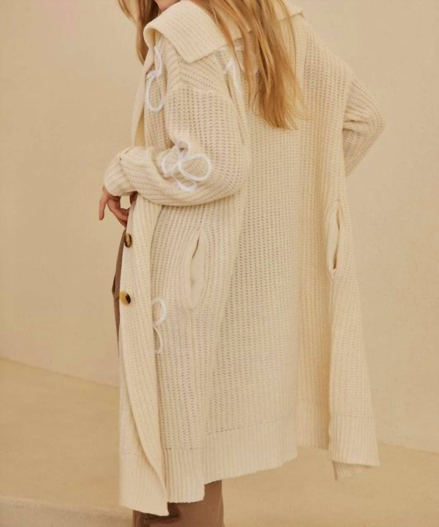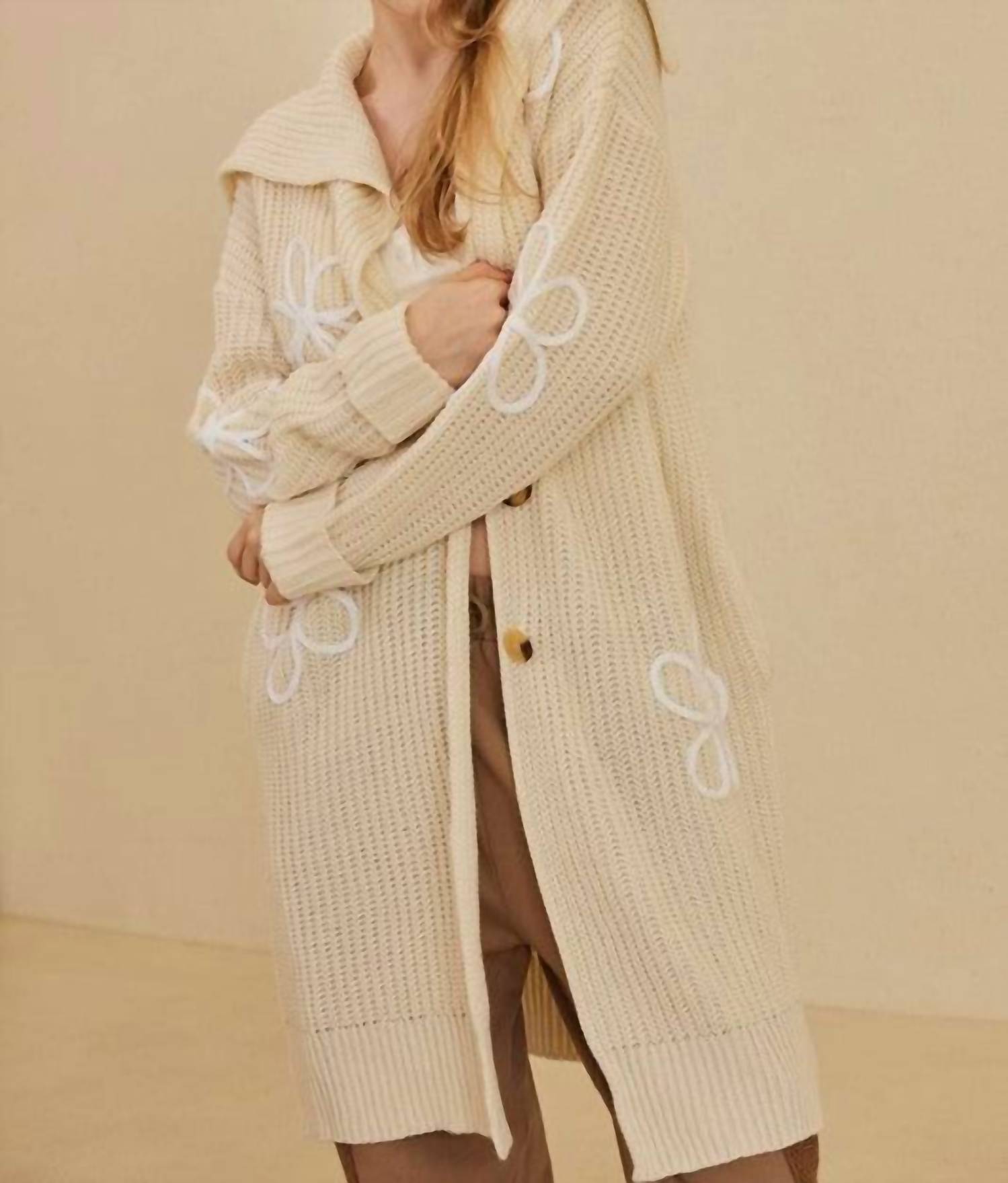 Throw this adorable cardigan over any cami or tank top. Introducing the Hannah Wide Collared Cardigan by PINCH, meticulously crafted with a focus on minimalistic elegance. Presented in a textured cream design, this cardigan features long sleeves and a stylish button closure, perfect for layering during the fall season. Made from soft acrylic, it is designed with a practical wide collar and pockets, making it ideal for Thanksgiving or holiday parties. Effortlessly add a fresh, feminine flair to your outfit with this essential piece for fashionable comfort.