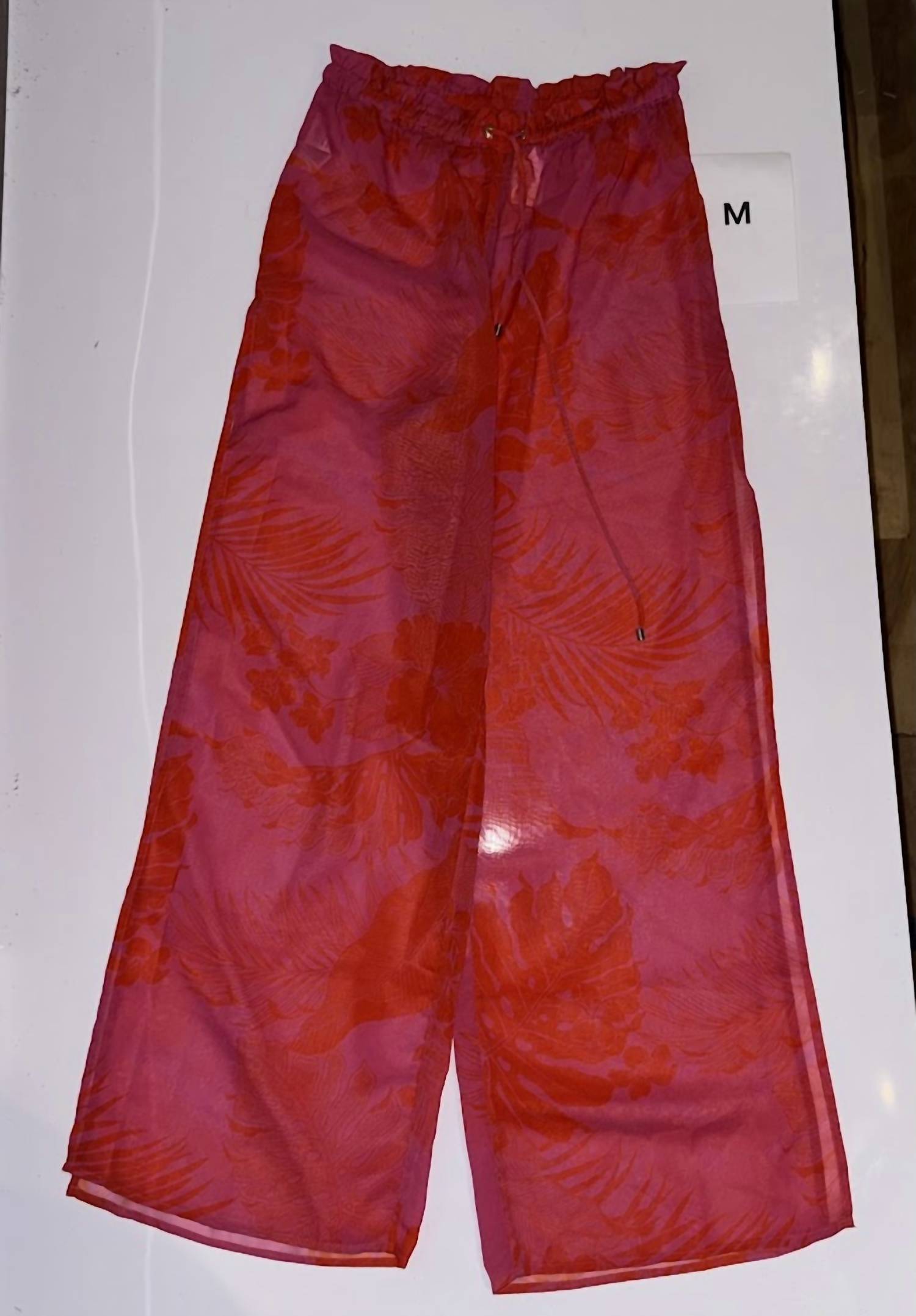 Experience effortless beach elegance with the Ombrelli Pantlone Trousers by PINKO, designed for a chic summer day. With a high-rise, drawstring waist and wide-leg style, these relaxed fit trousers feature a vibrant pink/orange floral pattern. Made from 100% polyester, these sheer, pull-on trousers have 30-inch inseams and stylish side slits, ideal for layering over your swimsuit. Care: Hand wash only.