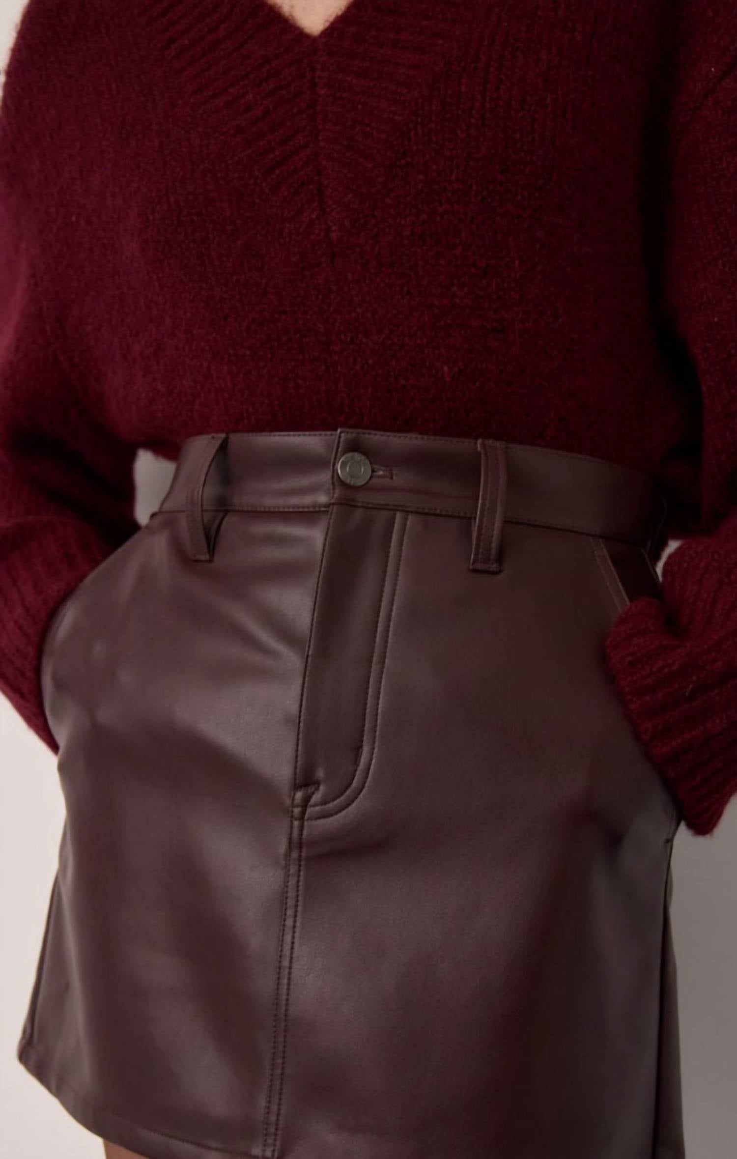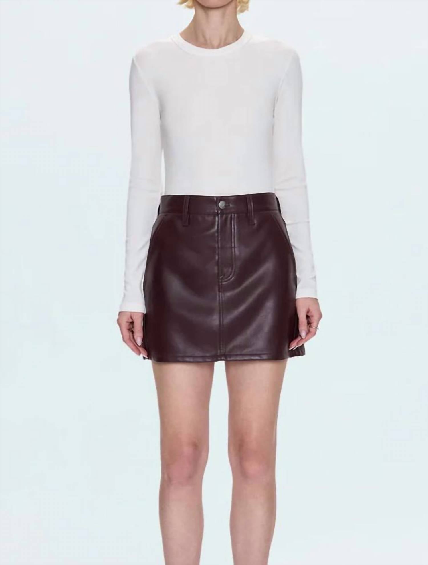 The perfect mini skirt does exist. Presenting the Abi High Rise Mini Skirt by Pistola, a sophisticated essential in rich Cabernet. This mini skirt boasts a luxurious leather-like finish crafted from 100% PU coating with a 100% polyester back, ensuring its expert shape and lasting appeal. Featuring a button closure, this piece is perfect for cocktail parties, brimming with elegance. Care instructions include washing cold, adding practicality to its chic allure. Model is 5'9" and wears a size 26.