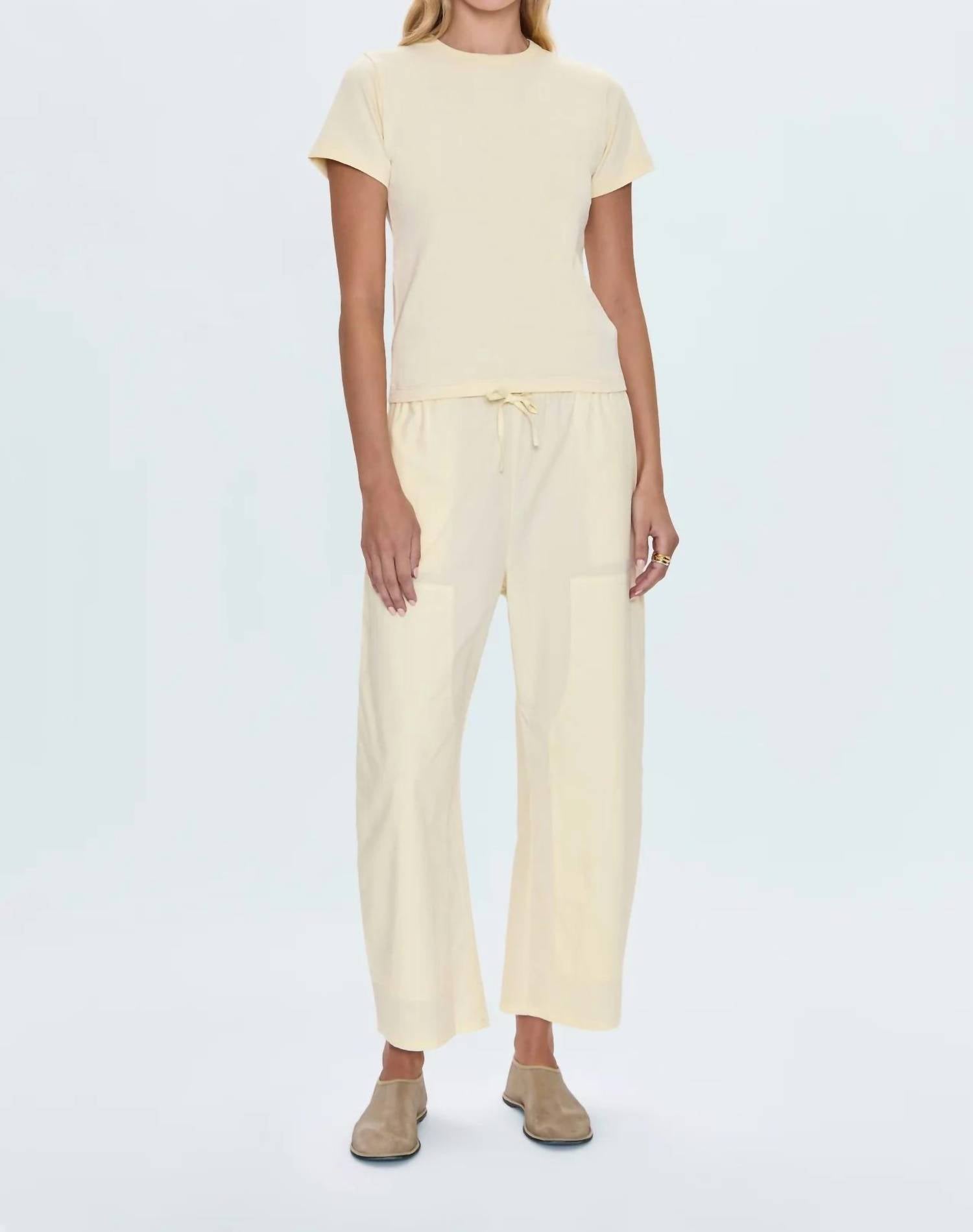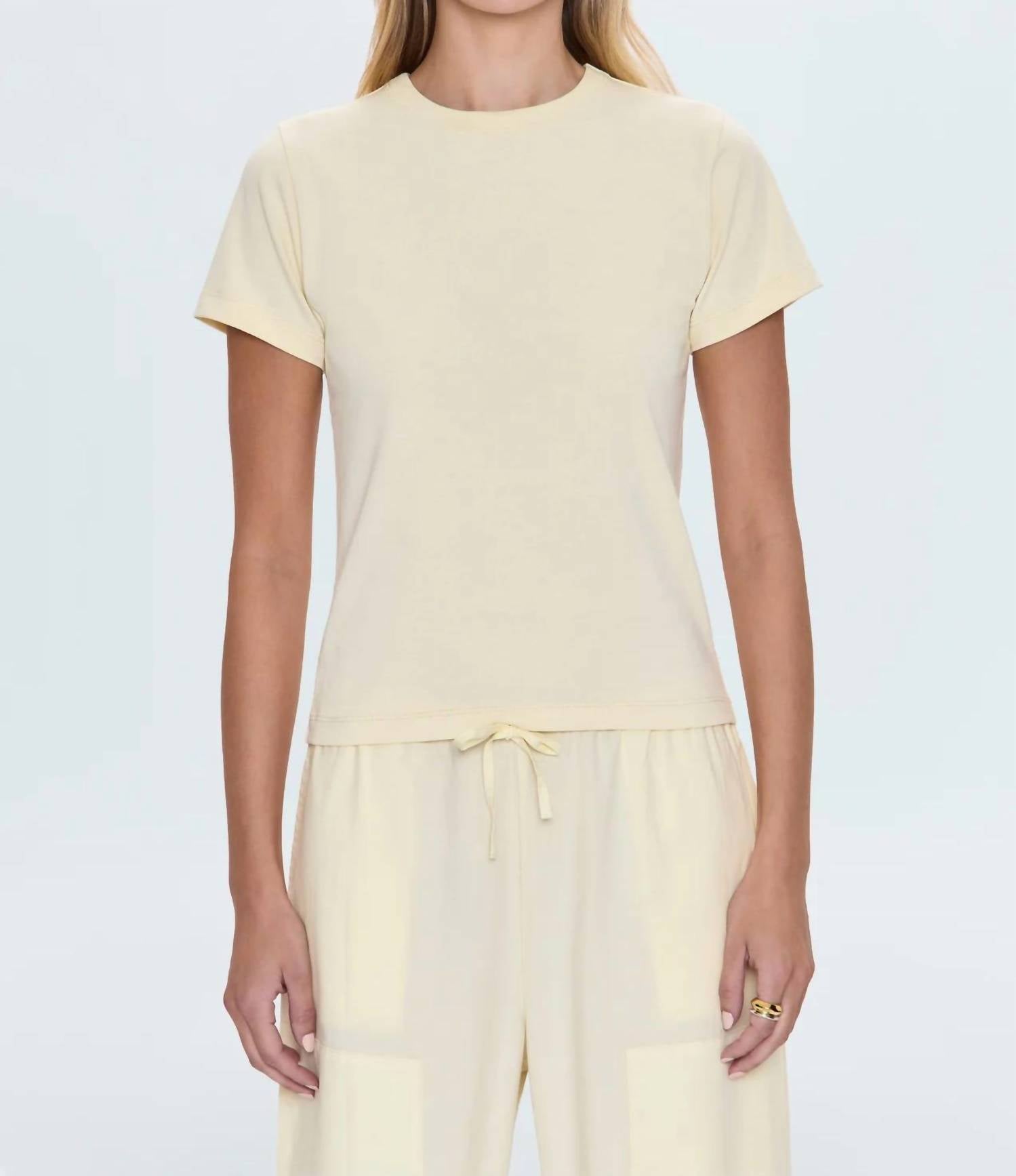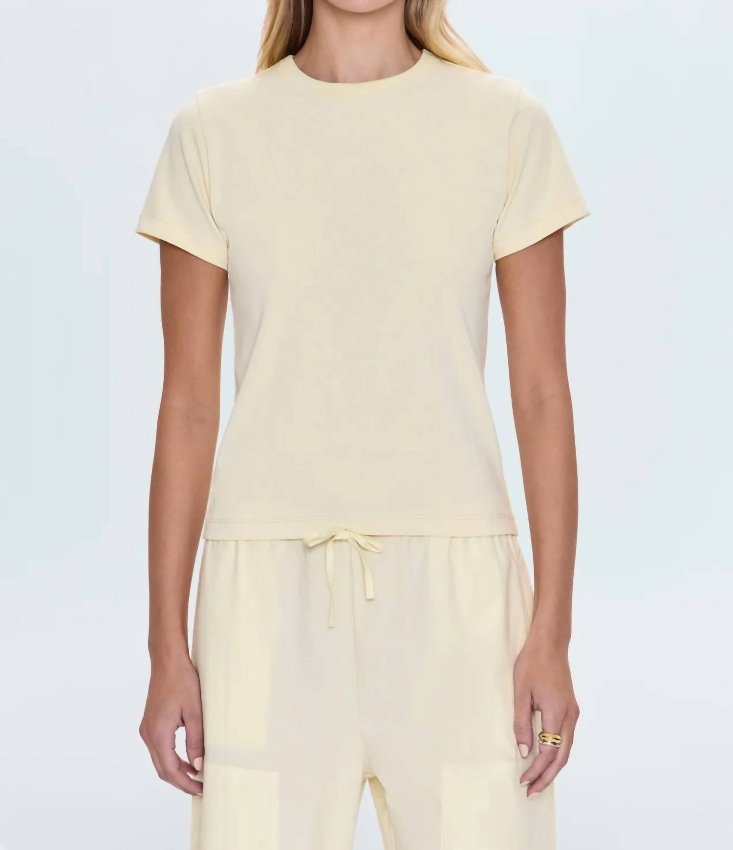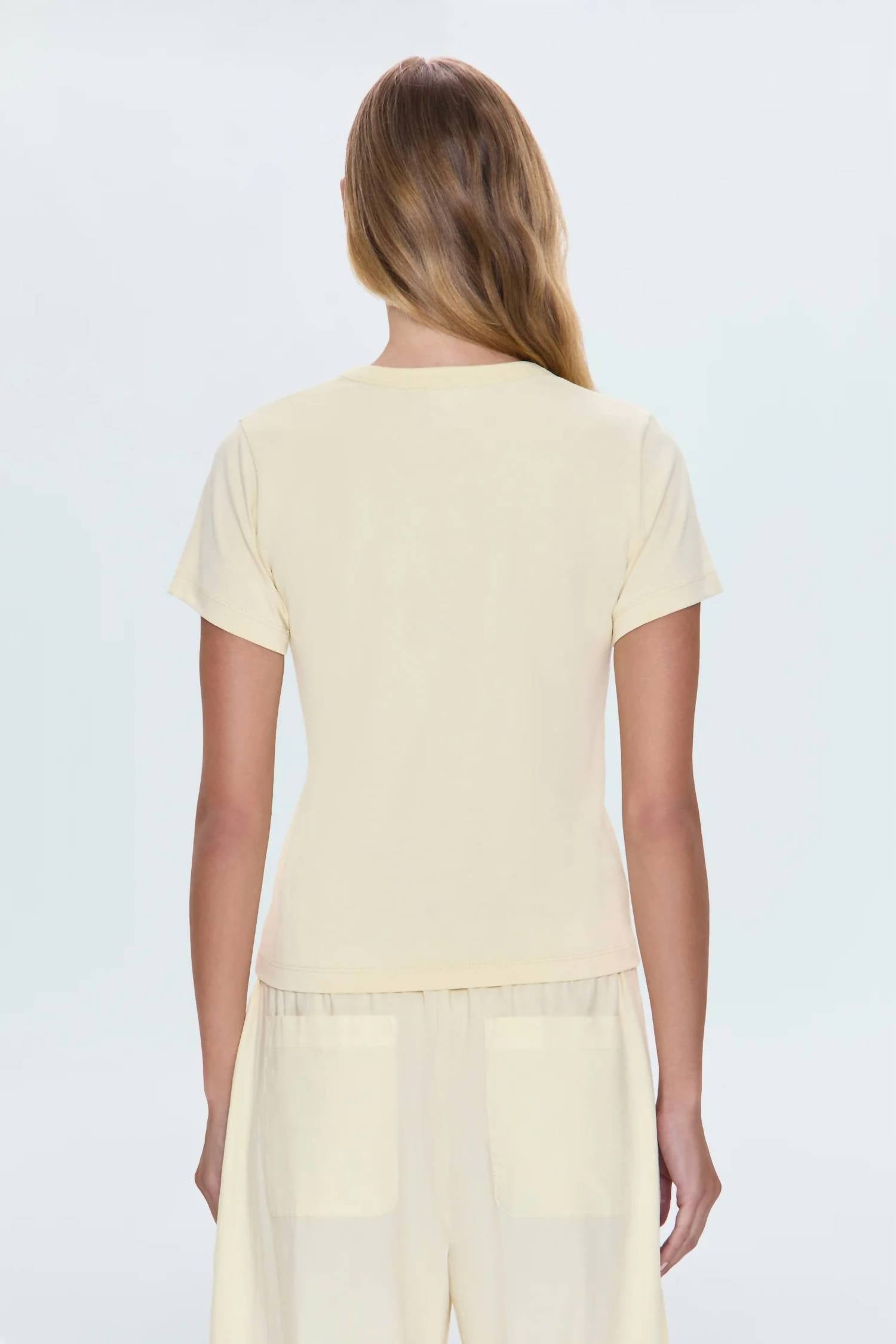 This classic, short sleeve tee will be your go-to staple this season and beyond. Meet the Alba Baby Tee by PISTOLA, a holiday-ready essential in vibrant Lemonade. With short sleeves and a classic crewneck, this tee is crafted from 100% Cotton for ultimate comfort. Boasting a waist-skimming length of 22 inches, it's perfect for pairing with your favorite bottoms. Closure: Pull-on style. Made for the minimalist in mind and imported with care.