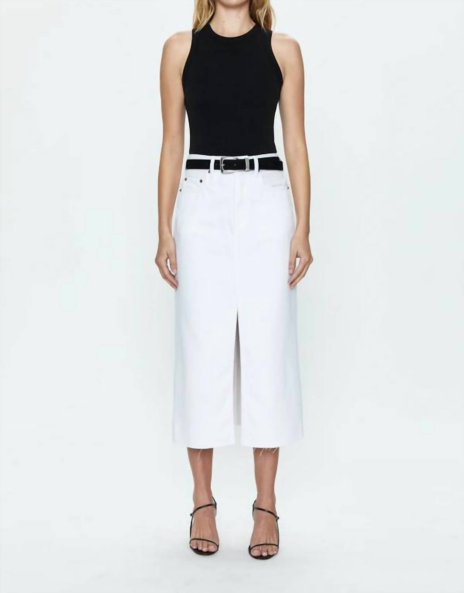 The midi length skirt is here to stay and we especially love this style. Elevate your summer wardrobe with the Alice Midi Skirt by PISTOLA, a perfect blend of style and practicality. This sophisticated white denim skirt features an elongated midi length with a chic frayed hem and a strategic front slit for ease of movement. Crafted from a 99% Cotton and 1% Spandex blend, it boasts a classic five-pocket design, complete with a secure zip closure. Designed for effortless travel and streetwear, care for it with machine wash and tumble dry instructions.