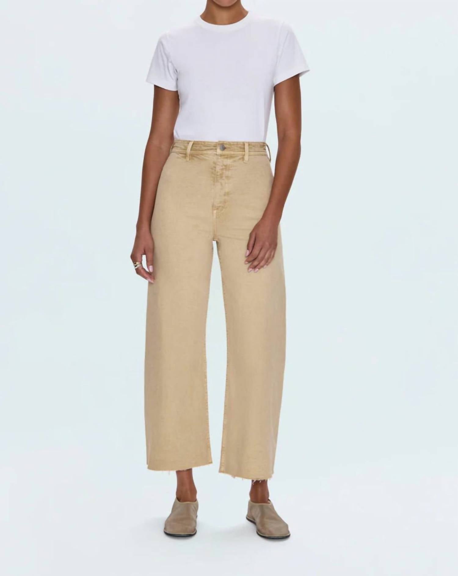 Just as cute as they are comfortable. Discover the Penny High Rise Wide Leg Crop Jeans by Pistola, your new go-to piece in a versatile Sand Dollar hue. These jeans boast a flattering high-rise fit and chic wide-leg silhouette, tailored from a premium cotton blend with 99% Cotton and 1% Elastane for exceptional comfort and flexibility. Featuring a cropped 27" inseam and a 12" rise, the jeans are completed with a zip closure and thoughtful details like scissor-cut hems. Easy care with machine wash and tumble dry, these jeans are perfect for showcasing your favorite footwear this spring.