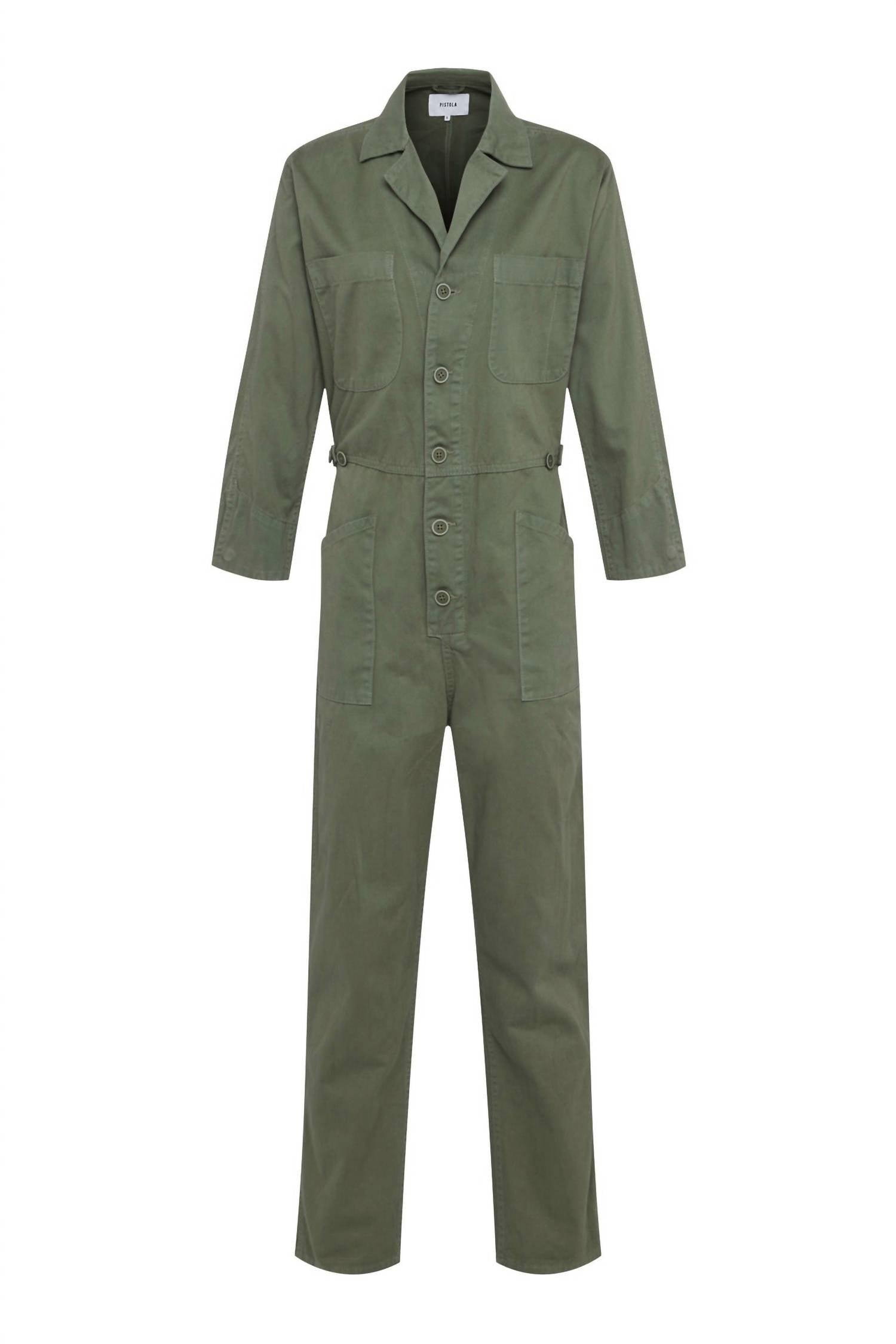 Throw it on and go! Meet the Tanner Cotton Field Worker Jumpsuit by PISTOLA, an olive-hued essential for your fall travel wardrobe. This jumpsuit boasts long sleeves and a solid pattern, featuring a button front closure with high-rise waist and straight leg style. Crafted from 100% cotton, it includes adjustable side straps for a customized fit, and pockets for added convenience. Care: Machine wash cold.