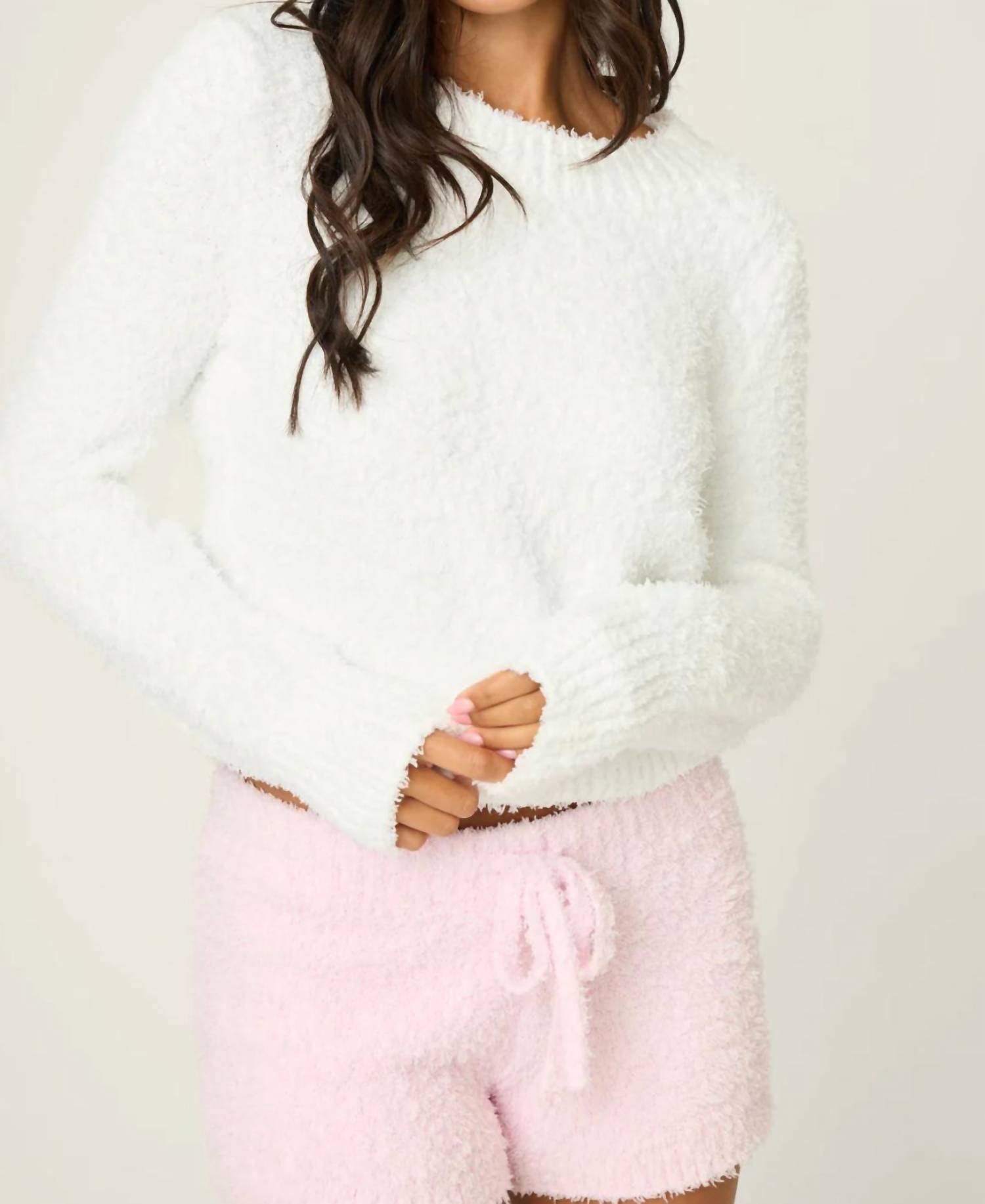 Stay warm and stylish in this versatile and effortlessly cool knitwear staple. Wear it alone or layered, it's the perfect sweater for the season and you'll wish you had it in every color. Experience ultimate comfort with the Bundle Up Bouclé Long Sleeve Top by PJ Salvage, crafted for cozy layering. This ivory top is made from 100% polyester bouclé, offering a plush, cloud-like texture that feels irresistibly soft. Designed with a classic crew neckline and ribbed trim, its pull-on style is both flattering and practical for everyday wear. Care is a breeze with its machine wash and tumble dry low instructions, making it a hassle-free addition to your wardrobe.