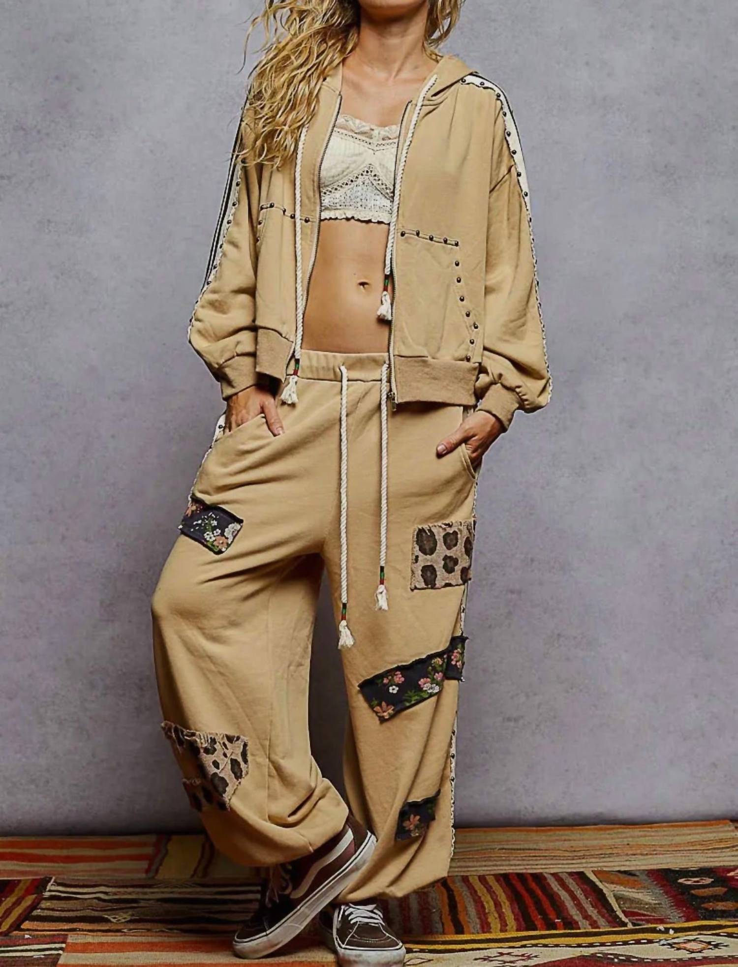 A set so cute you'll never want to take it off. Designed to look good while lounging, this little number is the perfect outfit for hanging at home in style. Introducing the POL French Terry Striped Elastic Side Studded Jacket and Jogger Set, the perfect choice for vacation-ready streetwear. This mocha-colored loungewear set features a striking textured pattern and long sleeves, ideal for spring outings. Made from a comfortable cotton blend of 60% cotton and 40% polyester, it's designed with a hooded neckline for a casual yet stylish look. Care is a breeze with machine wash instructions, making it a practical addition to your wardrobe.