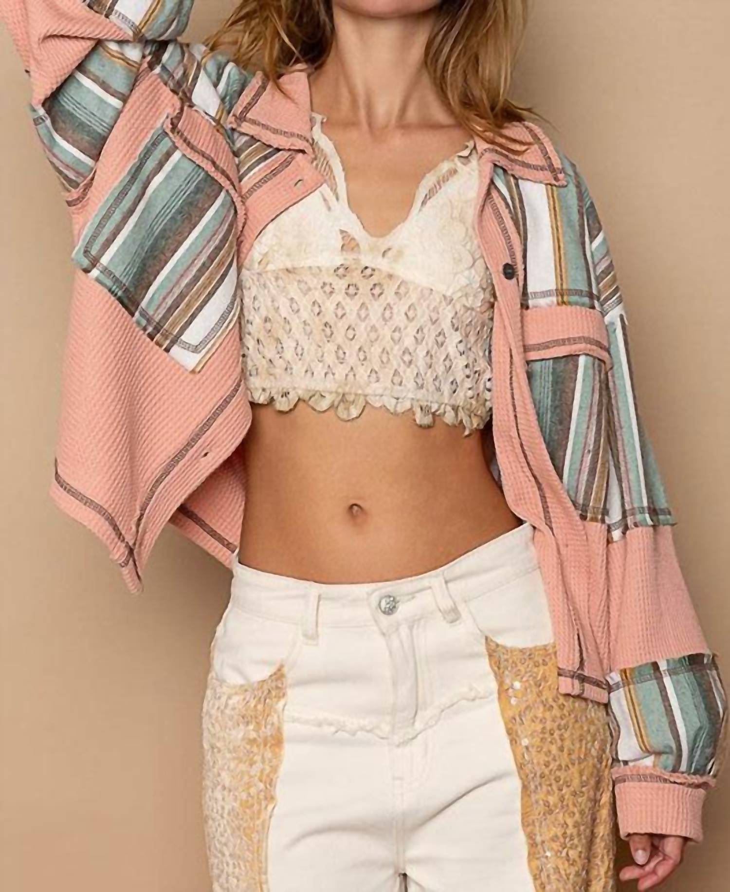A classic button down shirt that will never go out of style. Elevate your wardrobe with the Striped Woven Panels Button Down Knit Shirt Top by POL, a perfect choice for any Spring occasion. Featuring a relaxed fit with long balloon sleeves, this top is crafted from 100% Cotton and showcases a stitch detailed pointed striped pattern. Closure is a classic button style, complemented by a collared neckline. Available in a vibrant Coral Multi, this patterned piece embodies the Boho Chic trend, making it ideal for your Easter holiday gatherings.