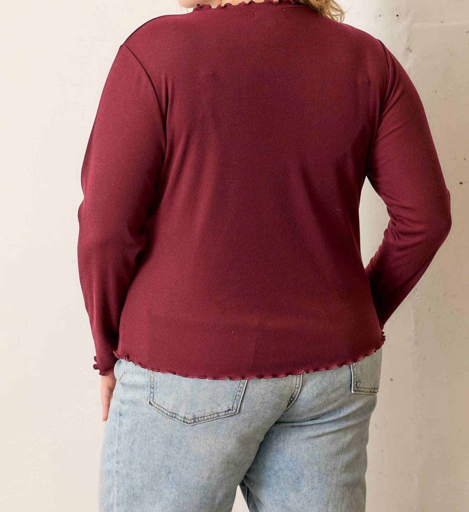 The ultimate go-to sweater, expertly crafted to provide the perfect combination of warmth and style. Its classic design and soft fabric make it a must-have addition to your wardrobe. Experience effortless elegance with the Plus Ruffled High Neck Rib Knit Top by Polagram, a chic addition to your wardrobe in a rich burgundy hue. This long sleeve top is crafted from a cozy knit material, perfect for Spring travel and minimalist styling. It features a high crewneck and solid pattern, complementing its pull-on closure for easy wear. Designed for women, this piece comes in a plus size, offering a stylish yet comfortable fit.