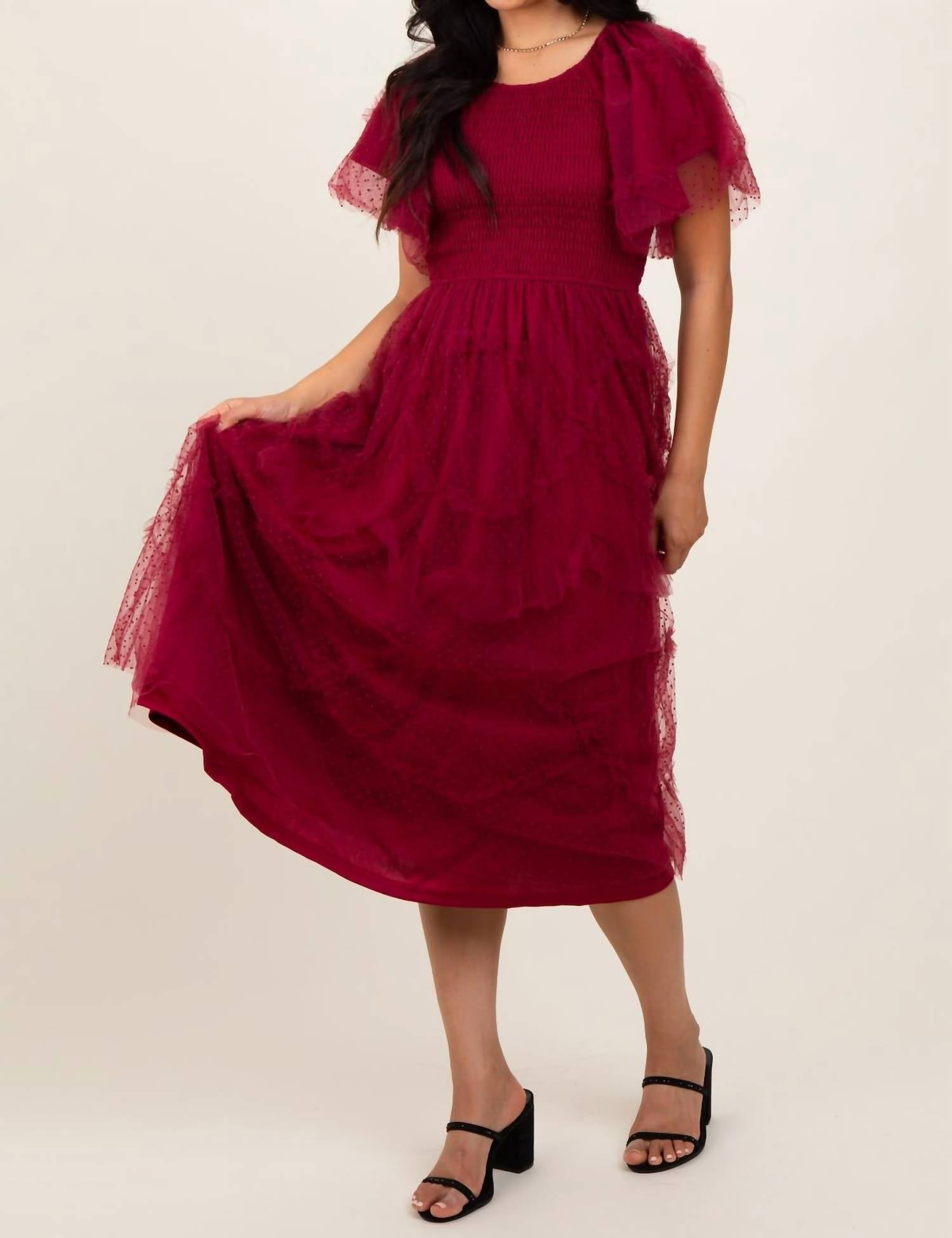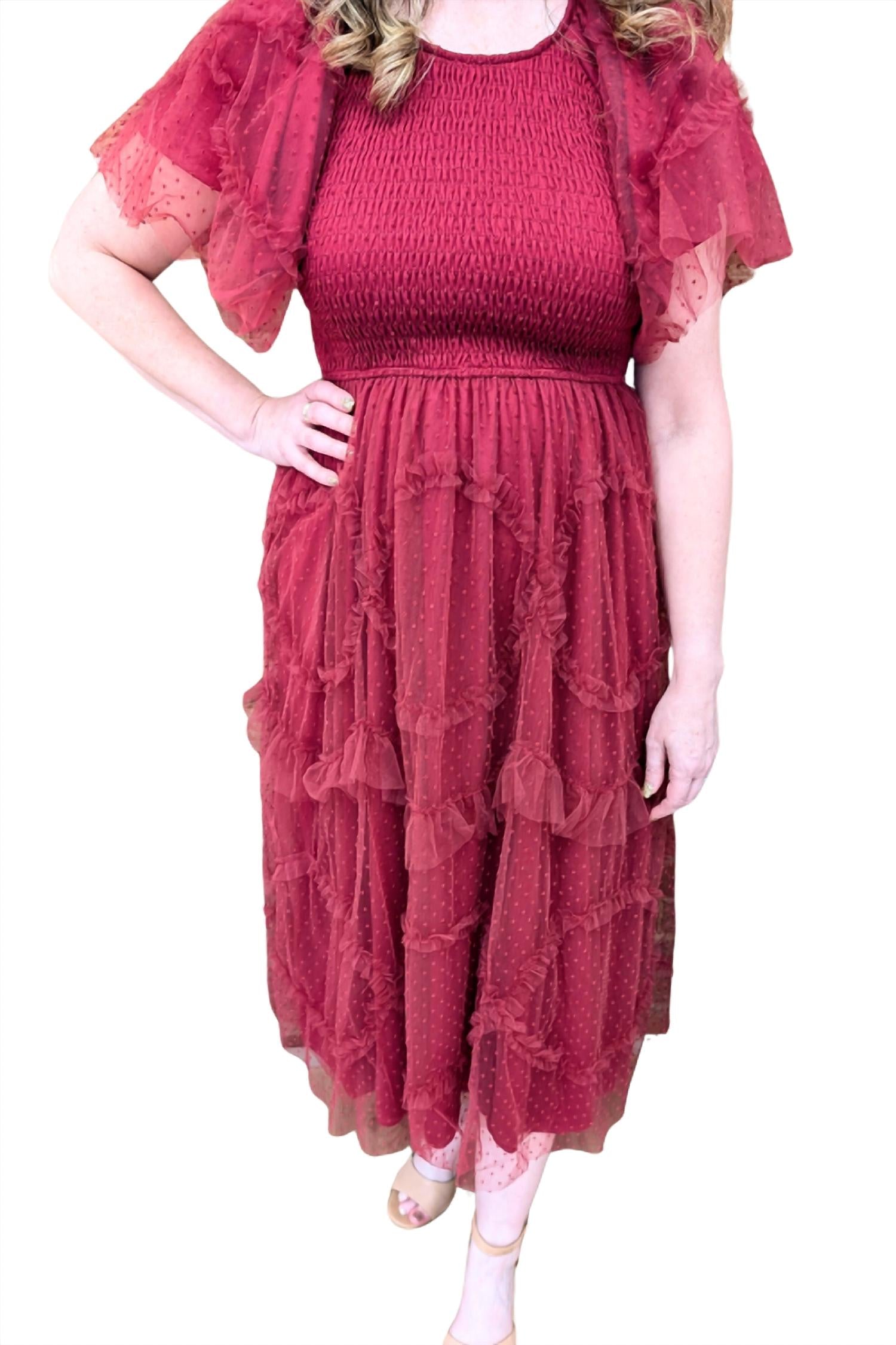 Looking for that perfect event dress? Look no further... This fully lined garment is made of 100% Polyester featuring a mesh overlay with Swiss dots and ruffles. It is designed with a relaxed, true-to-size fit, a smocked back, and a rear keyhole closure for accessibility.