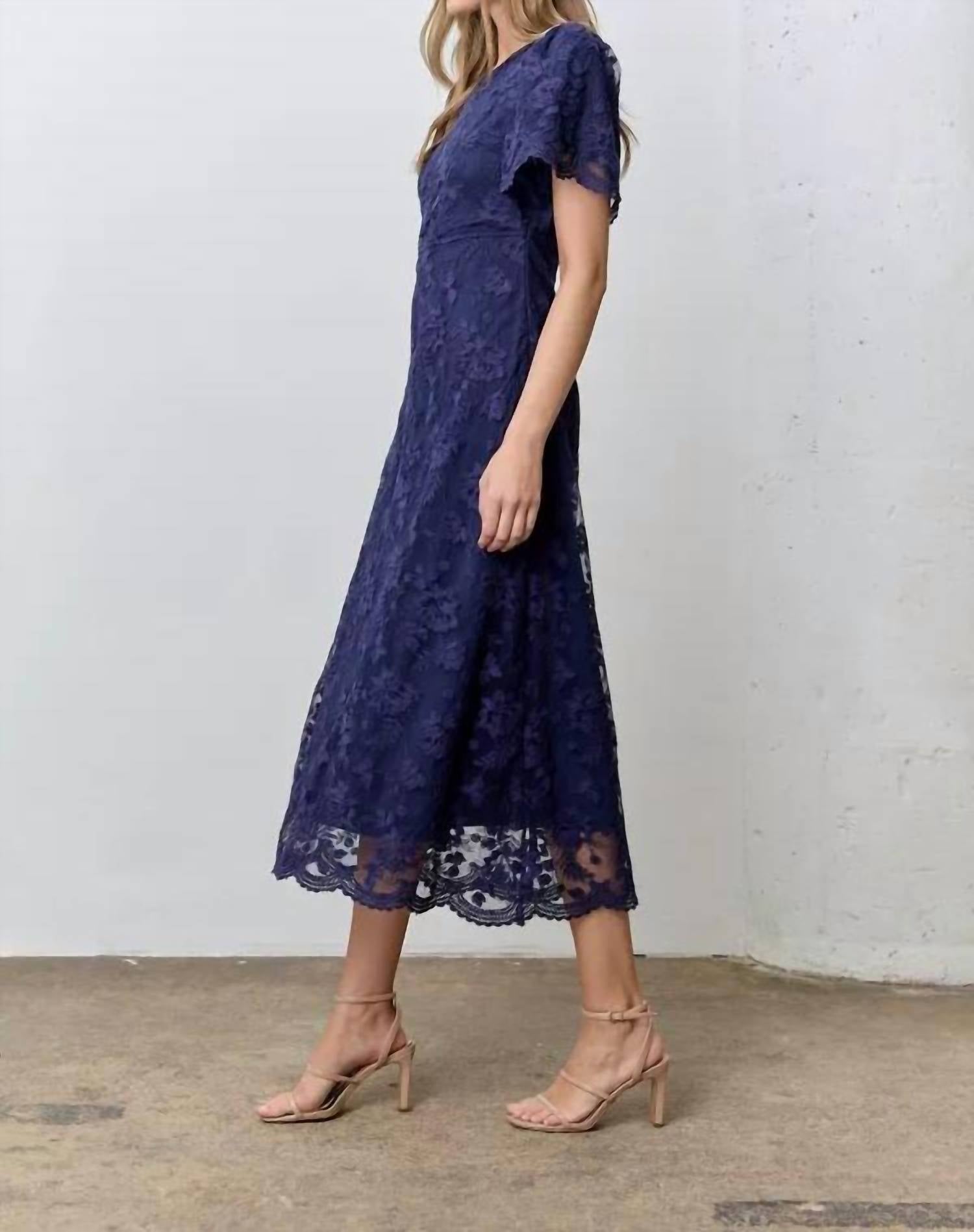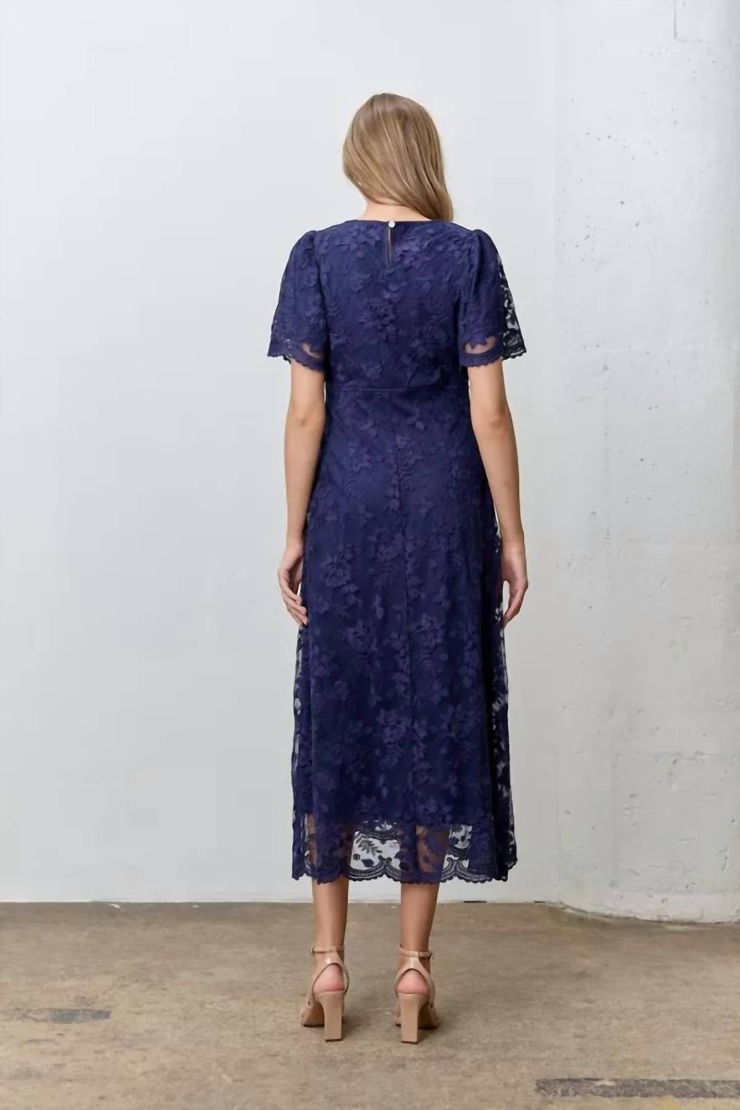 A midi dress so versatile, your options for wearing it are endless. This dress is made in China from a fabric blend of 70% cotton and 30% nylon. It features a round neckline, A-line skirt, button back closure, floral lace details, and buttonhole sleeves.