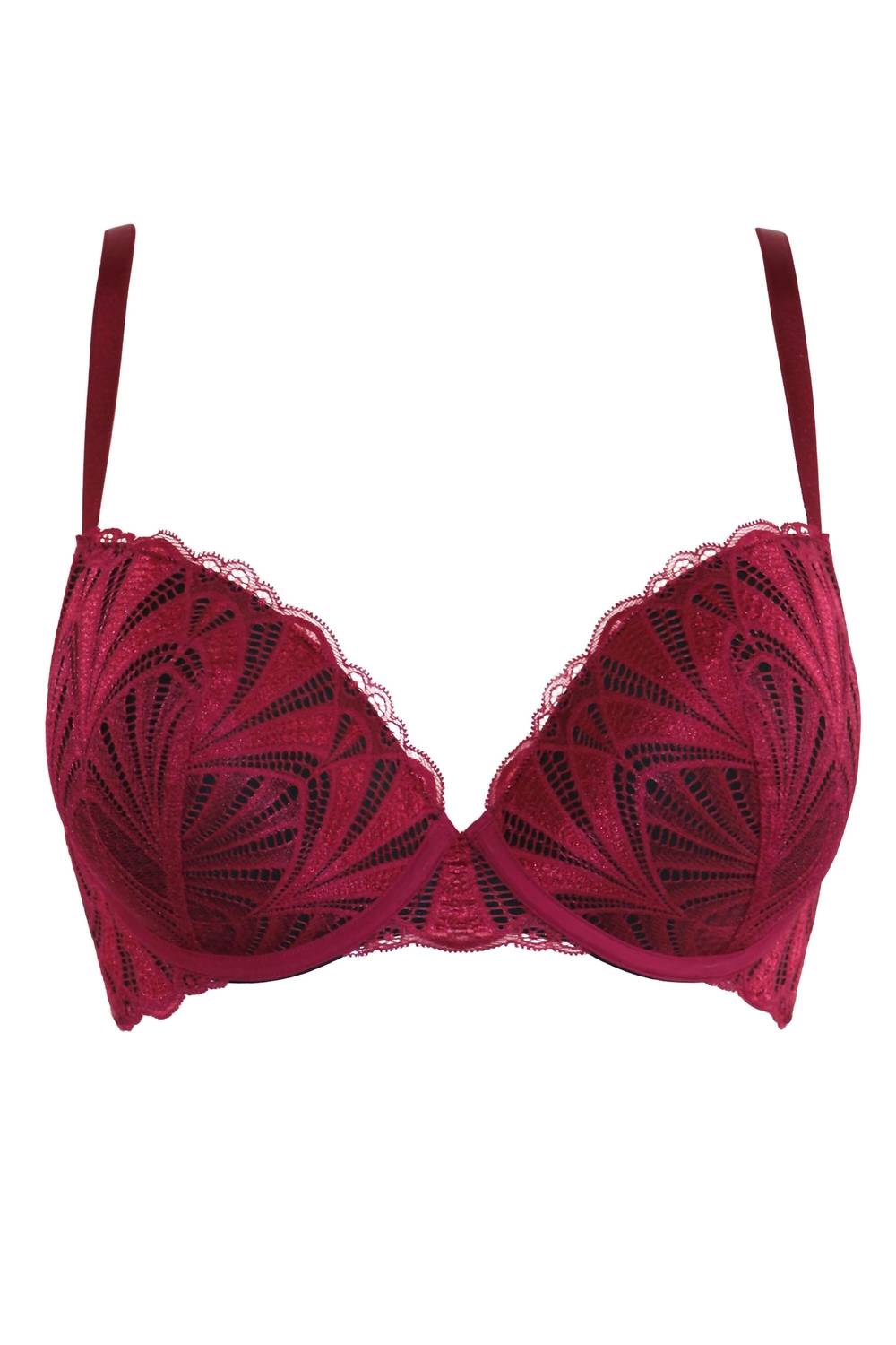 This bra will be your new top-drawer favorite. Discover the Pour Moi New Romance Padded Push-Up Plunge Bra, perfect for a dinner party or special occasion. This cherry red bra features an underwired, plunging shape and decorative lace outer cup with a contrasting color lining. It's crafted from 63% Polyamide, 28% Polyester, and 9% Elastane, offering superb push-up support with a padded inner mould. The design is completed with fully adjustable soft touch straps and a hook-and-eye fastening. Care for this bra with a gentle hand wash. Ideal for elevating your wardrobe with a hint of 90s fashion elegance.