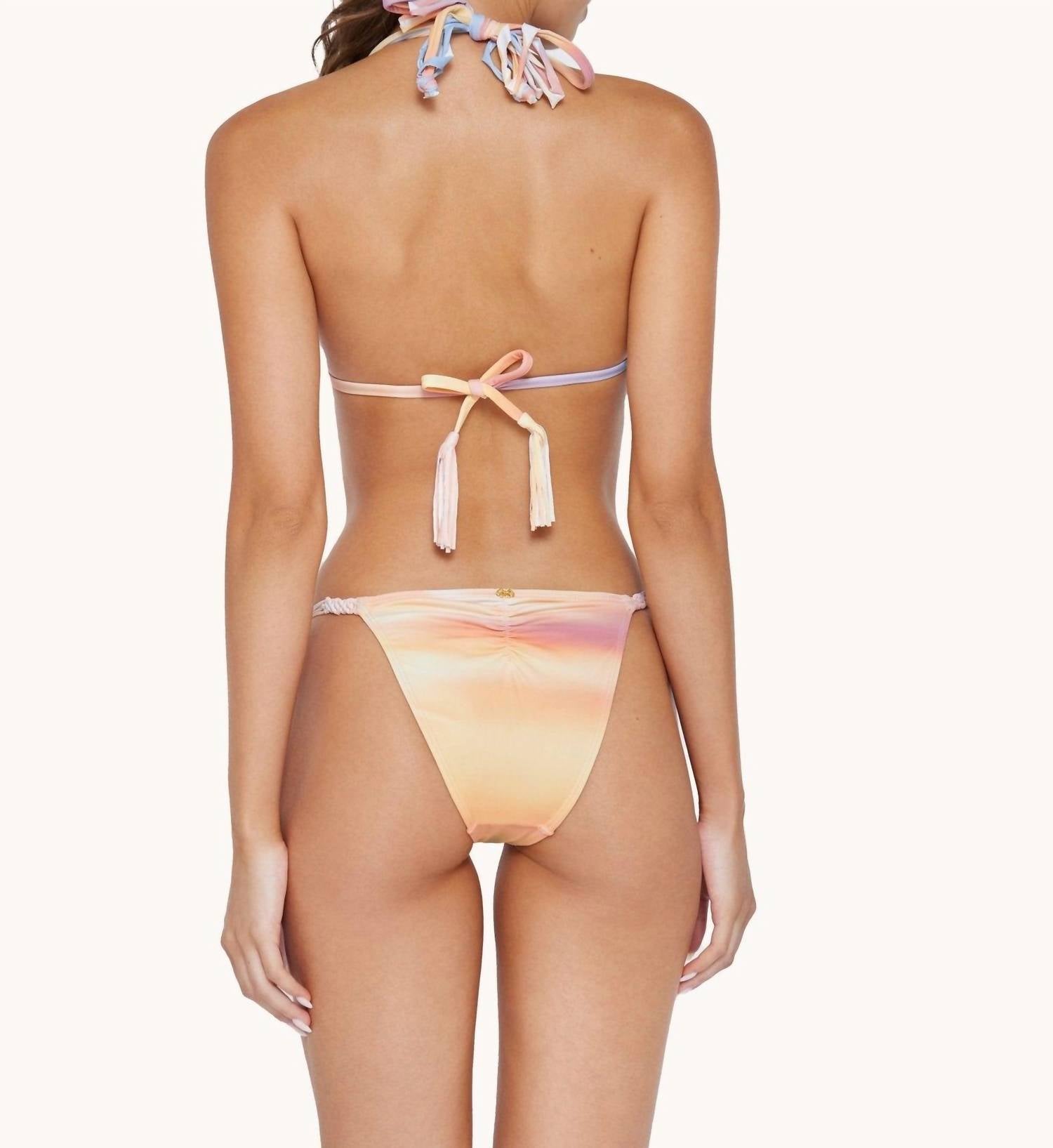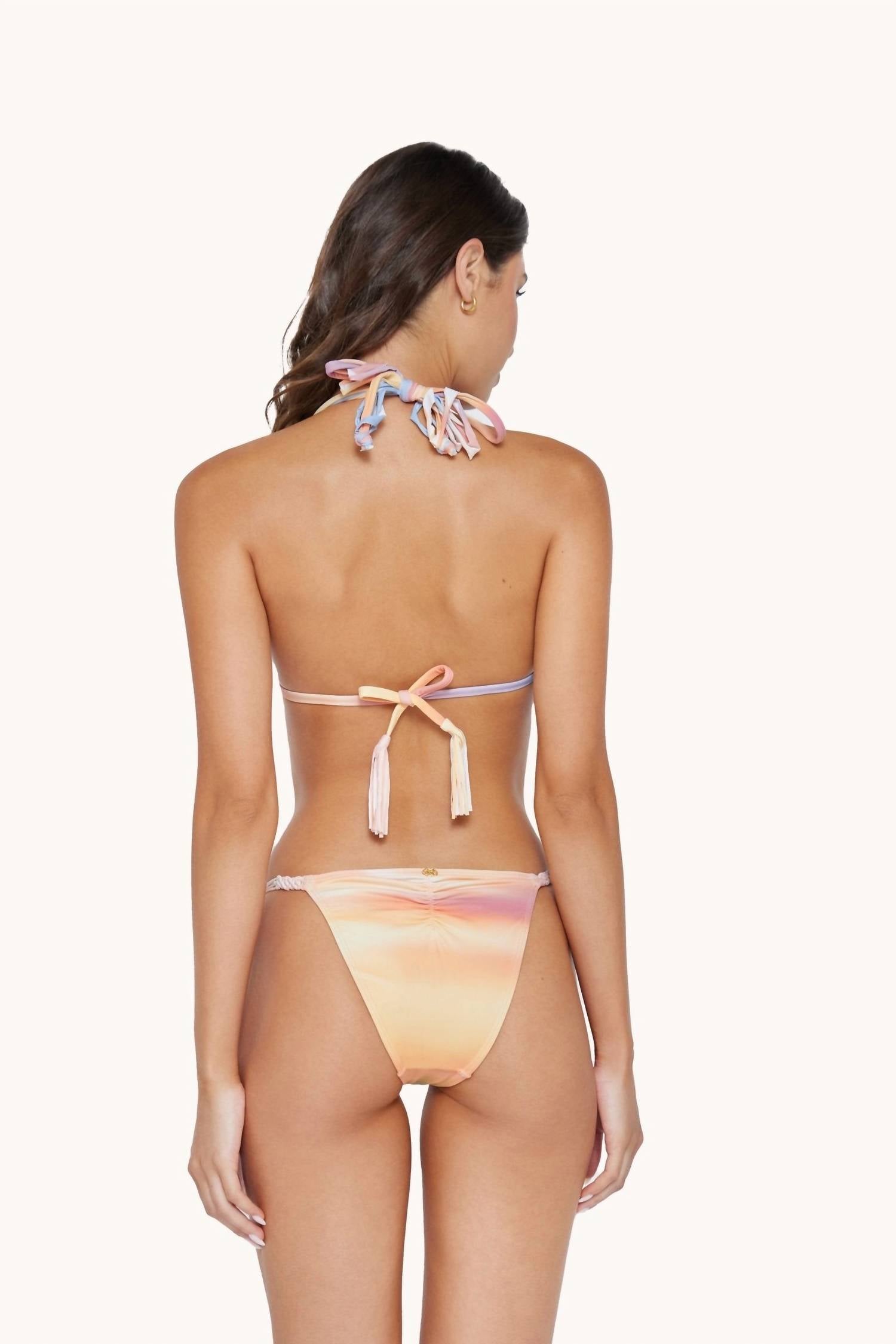 Dream of your next beach getaway in this cute little number. Pair with strappy sandals, a floppy hat, and an oversized tote to complete the perfect vacation look. Elevate your beachwear with the Mila Tie Bikini Bottom by PQ Swim, crafted in the enchanting Sunset Skies pastel print. Designed for a bold summer statement, these mid-rise bottoms feature stunning macrame braided straps and a chic ruched back for a fashion-forward, textured look that fits the maximalist trend. Made from eco-friendly recycled materials, these bottoms provide cheeky coverage and are perfect for mix-and-match versatility. Care instructions include hand wash and line dry to maintain their unique style.
