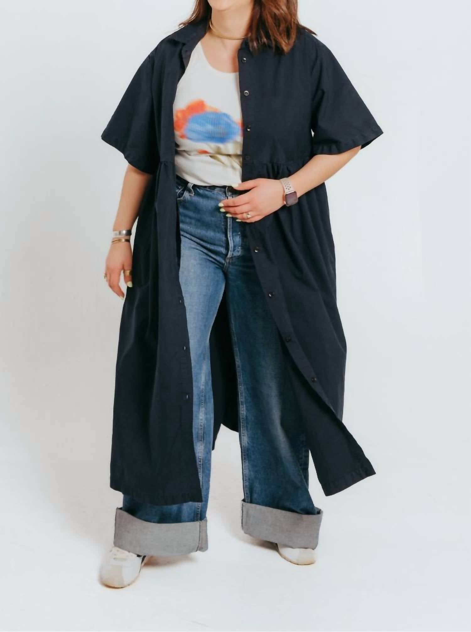 The perfect length dress does exist. Introducing the Que Sera Sera Midi Dress by Prairie Underground, a stunning piece in deep midnight navy crafted for versatile chic. Featuring a dramatic silhouette, this dress can be worn solo or layered as a jacket, complete with elbow sleeves for structured elegance. Made from heavy cotton poplin, it offers both durability and a sculptural drape, while a button-front closure provides styling versatility. Expertly crafted in Seattle, USA, and ideal for fall engagements, this piece blends practicality with side seam pockets and sophisticated style.