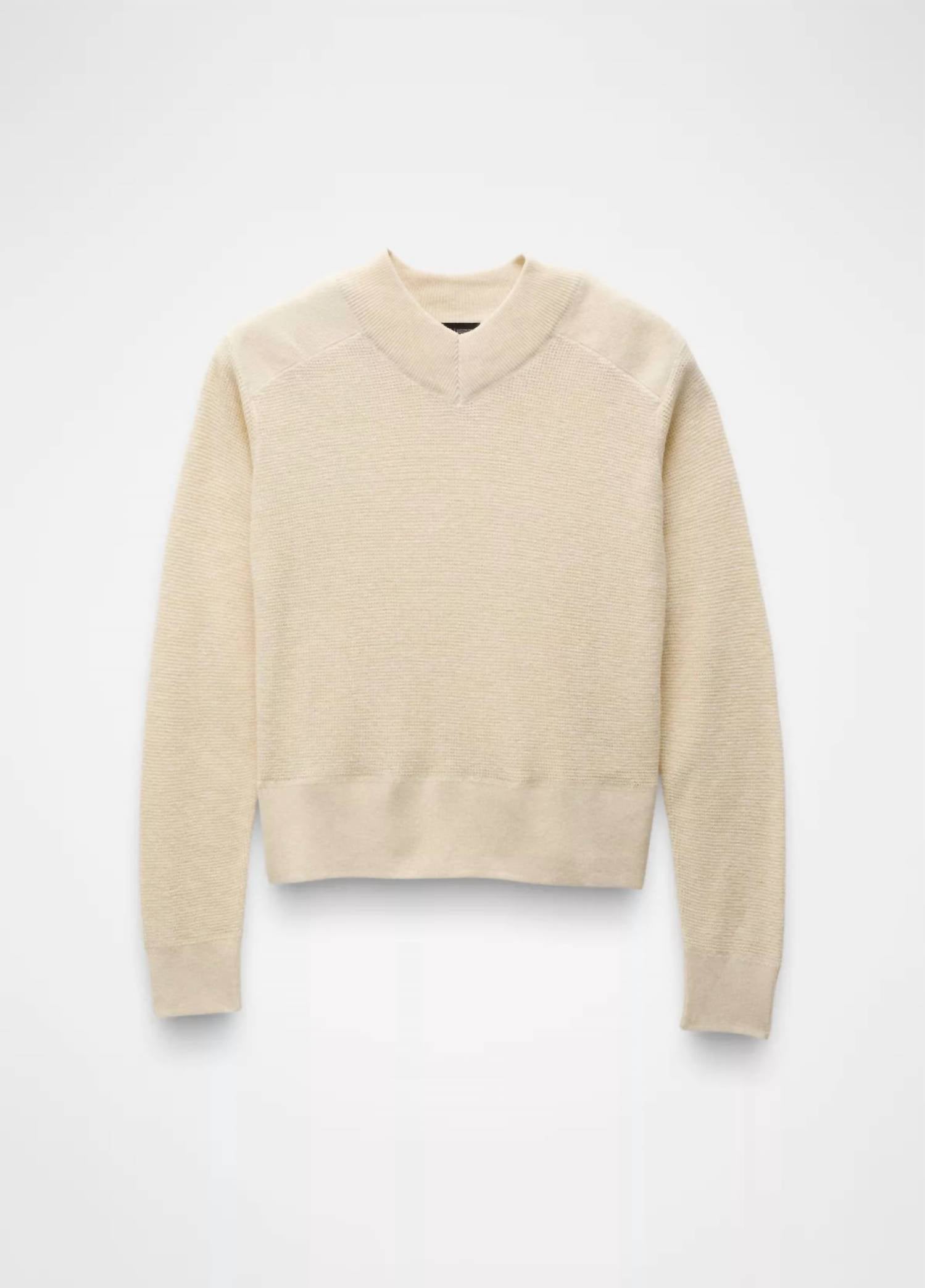 A timeless v-neck sweater that works season after season. The prAna Women's Milani V-neck Sweater in Sweet Cream is your perfect companion for travel and minimalist style. Designed with long sleeves, this textured sweater features a chic V-neck and mixed rib textures, complemented by 4x2 ribbed body and 1x1 ribbed cuffs, hem, and collar. Made from a sustainable cotton blend, the composition includes 60% Regenerative Organic Certified® Cotton, 30% Recycled Polyester, and 10% Wool. Originating from an imported make, this sweater has a pull-on closure and is machine washable.