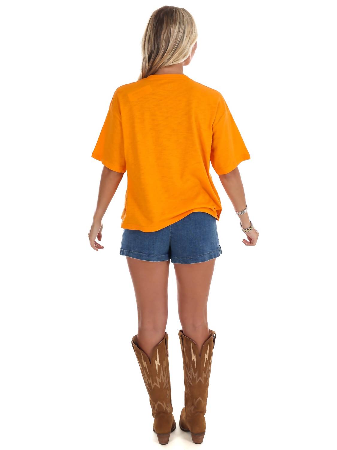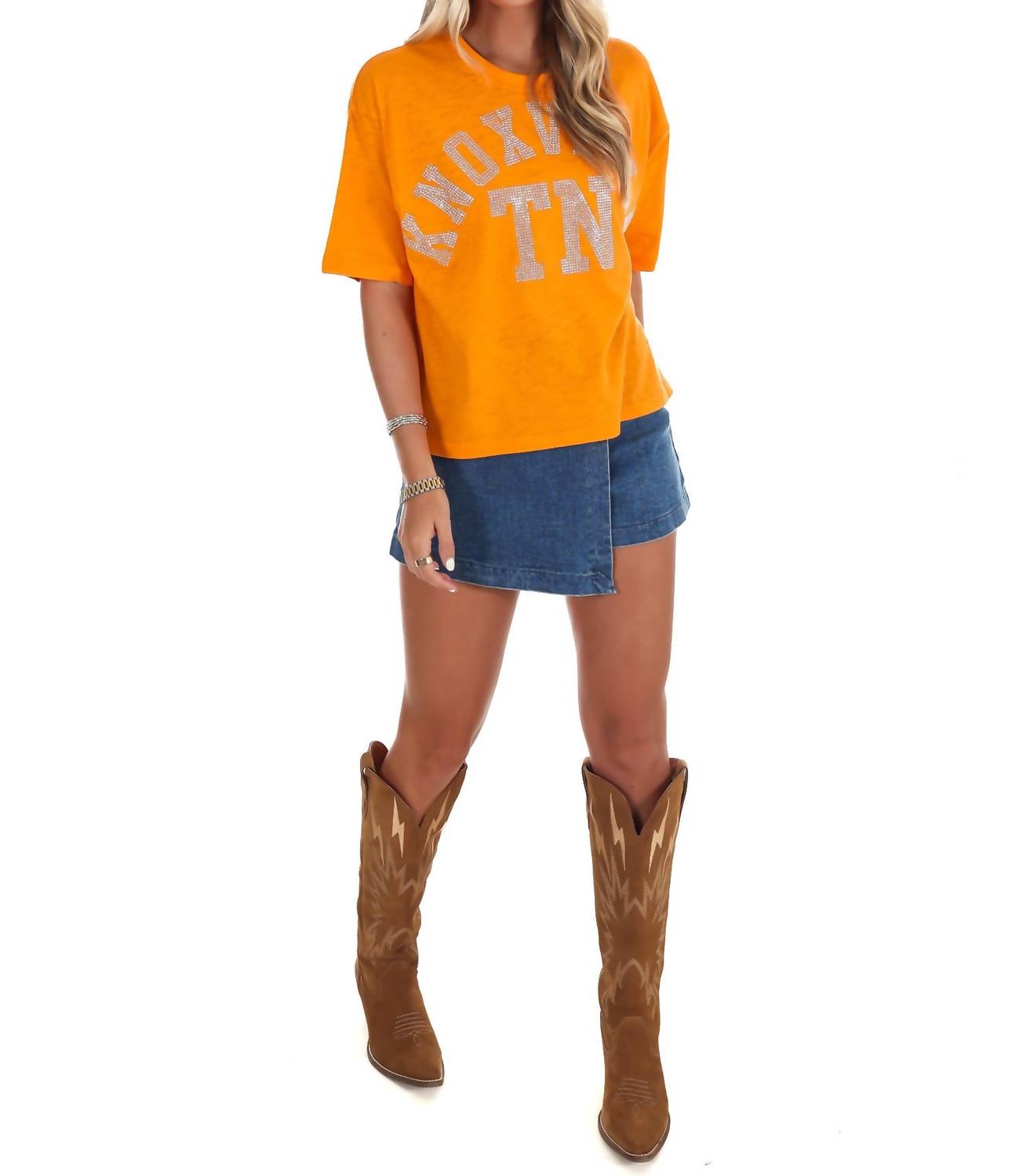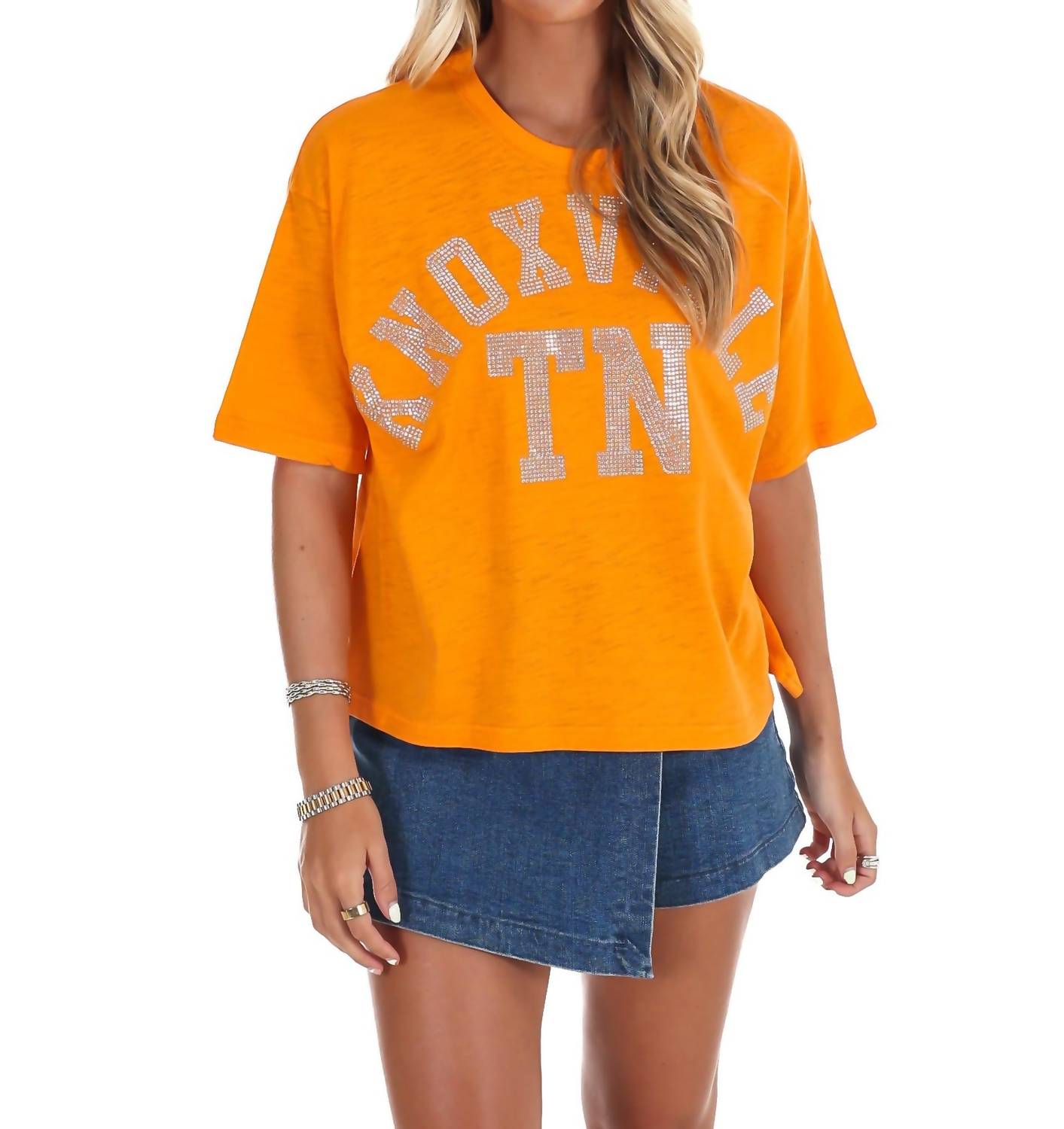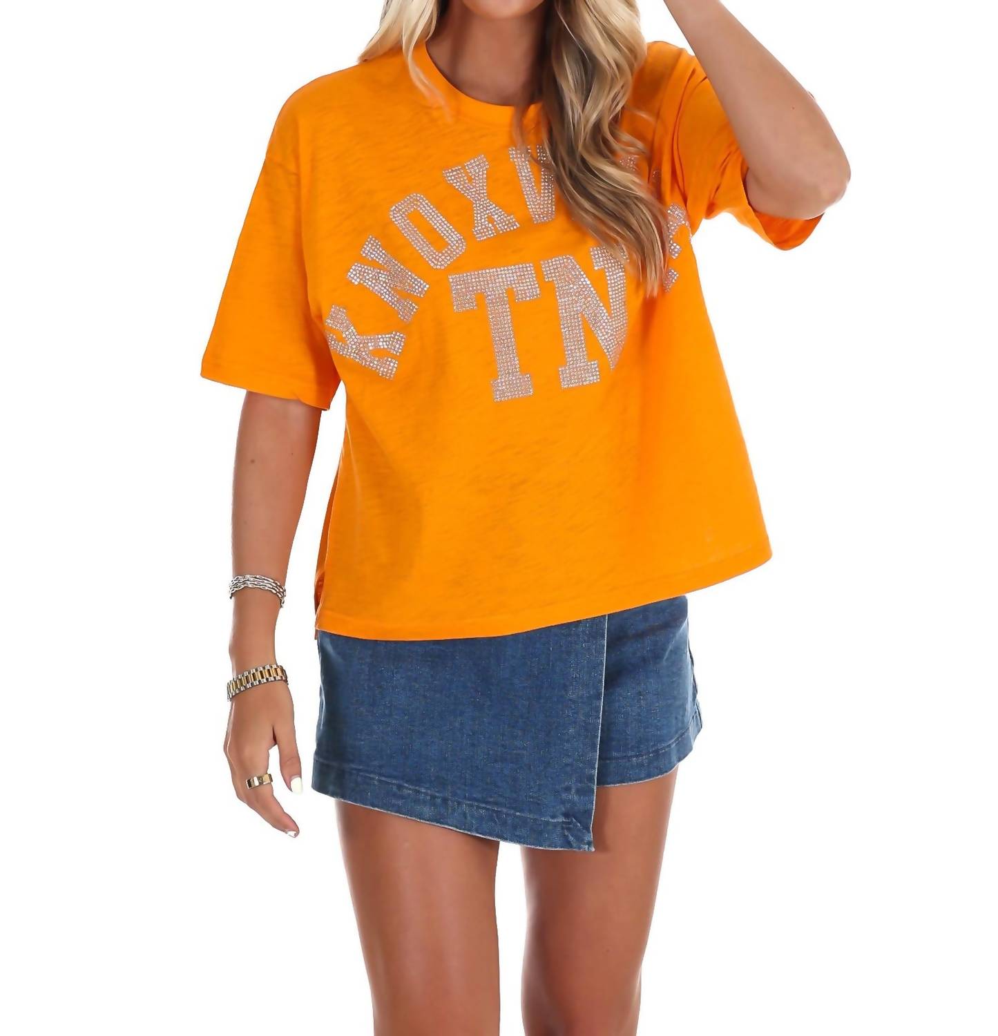 The short sleeve tee you'll want in every color. Introducing the Rhinestone Crew Neck Tee by Pressbox, a vibrant addition to your casual collection. This short sleeve, orange tee is elevated by glimmering silver rhinestones, bringing a touch of sparkle to your streetwear look. With a graphic pattern and pull-on closure, it's perfect for playful outings and travel occasions. Care: Machine wash and tumble dry for easy maintenance.