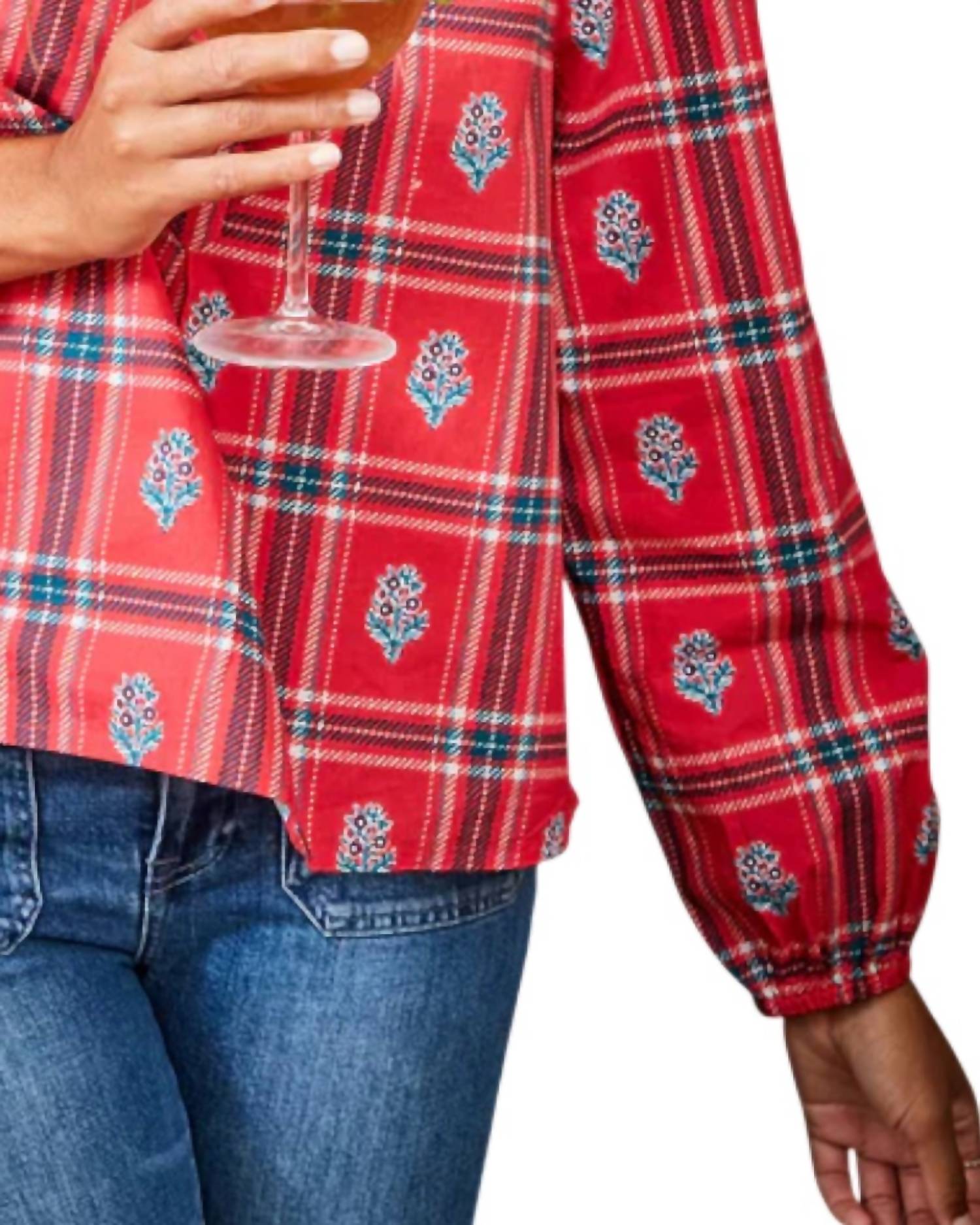 A versatile blouse that works from desk to dinner! Introducing the On The Books Plaid Blouse by Printfresh, a perfect addition to your holiday wardrobe. This long sleeve blouse, crafted from our signature 100% organic cotton poplin, features a charming plaid pattern and intricate lace detail. Hand screen-printed fabric by artisans in India and finished with a classic button closure, it embodies elegance with a vintage flair. Care: Launder on delicate with like colors, tumble dry on low heat, and press lightly or steam for elevated occasions.