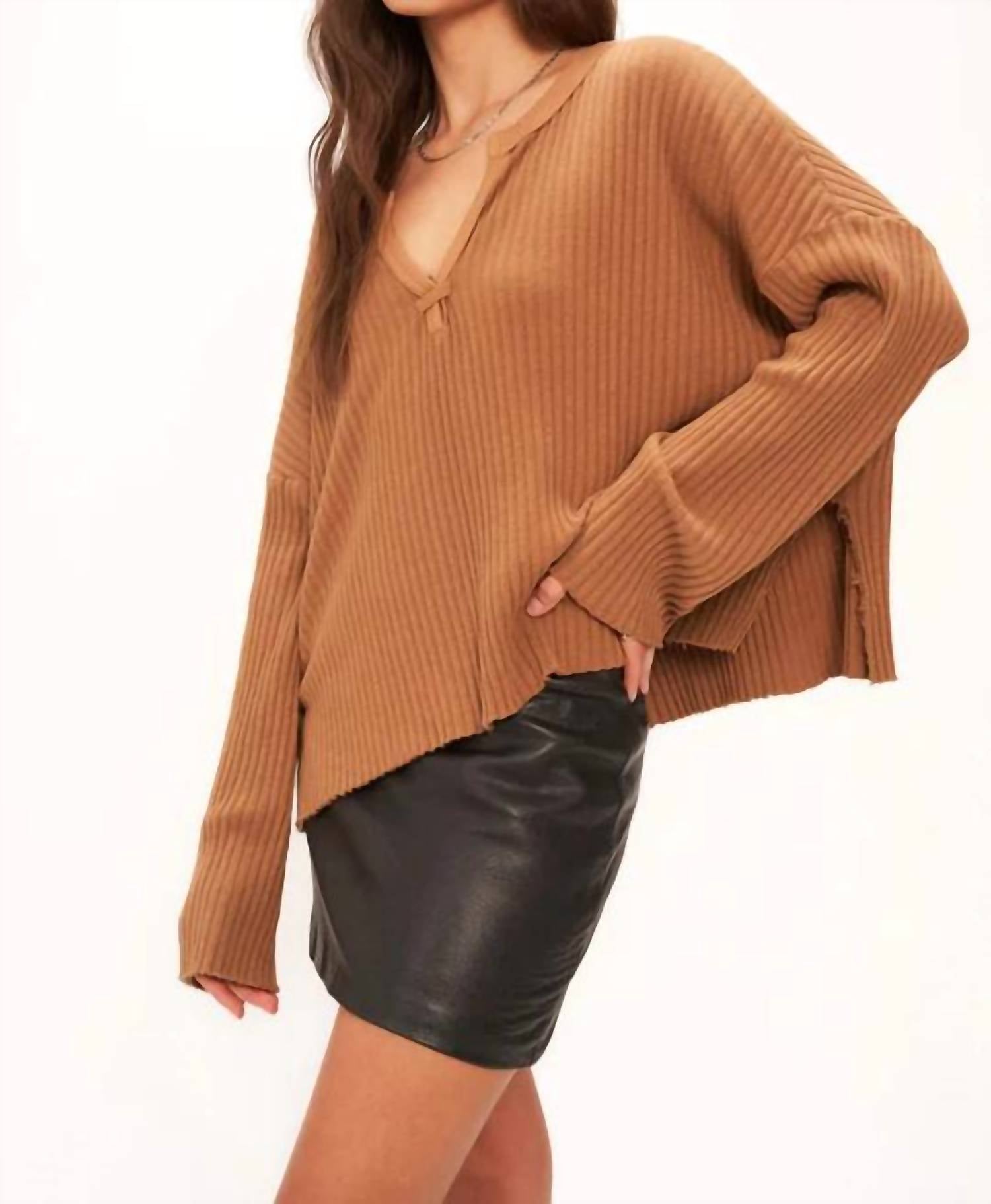 You'll be reaching for this comfy and classic v-neck sweater all season long. Introducing the Getaway Notch Neck Sweater Rib Pullover by PROJECT SOCIAL T, a stylish addition to your wardrobe in a warm caramel hue. This textured V-neck pullover features long sleeves and is crafted from a comfortable cotton blend. Designed for women, it offers a convenient pull-on closure and should be machine washed and laid flat to dry. Perfect for those who value both comfort and style.