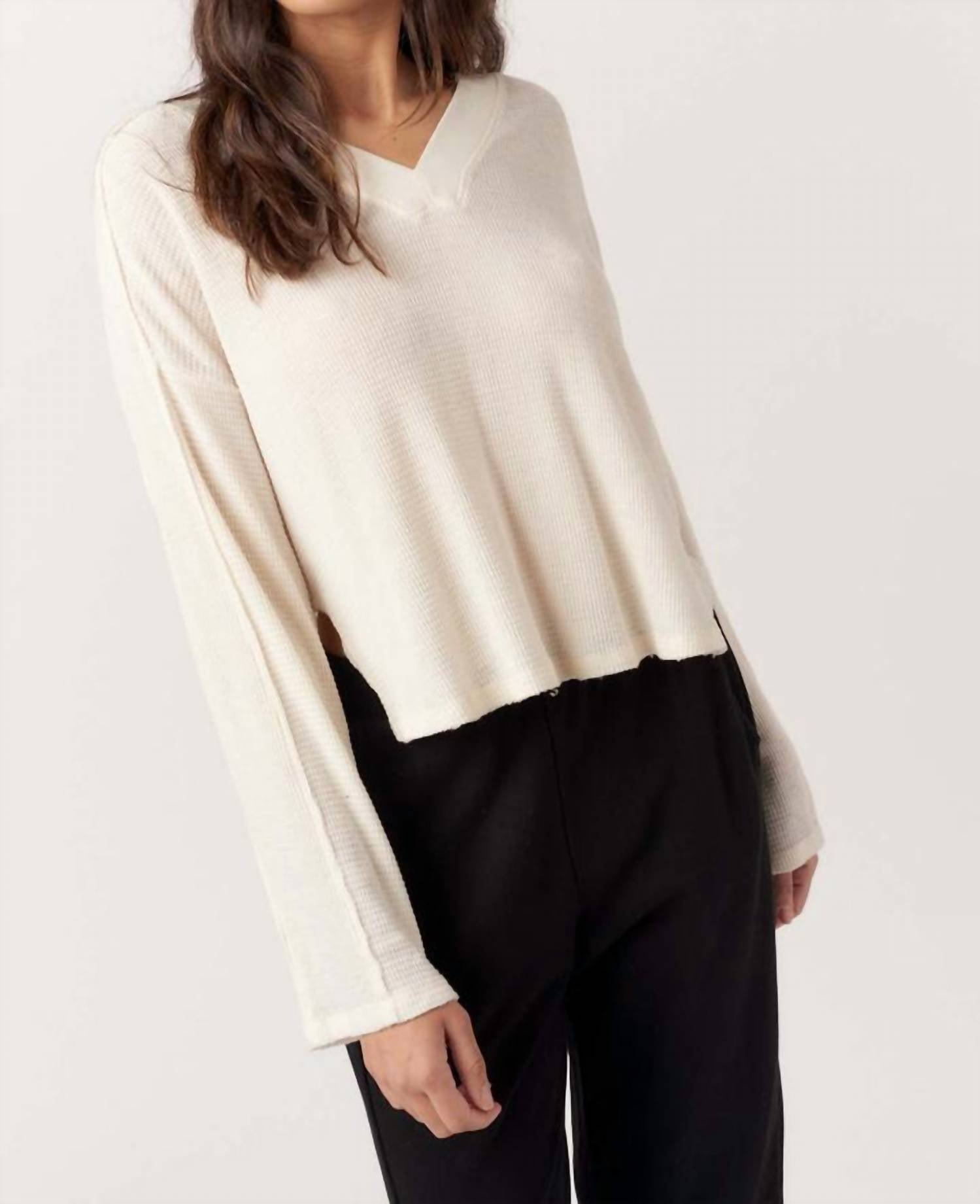 A timeless v-neck sweater that works season after season. Embrace minimalist style with the Project Social T Underground Thermal Burnout V-neck Long Sleeve Tee in a solid white shade. Crafted from a cotton blend, this tee offers both comfort and durability for your fall wardrobe. The V-neck design and pull-on closure ensure easy wear, making it an ideal choice for vacations or casual outings. Perfect for layering or wearing on its own.