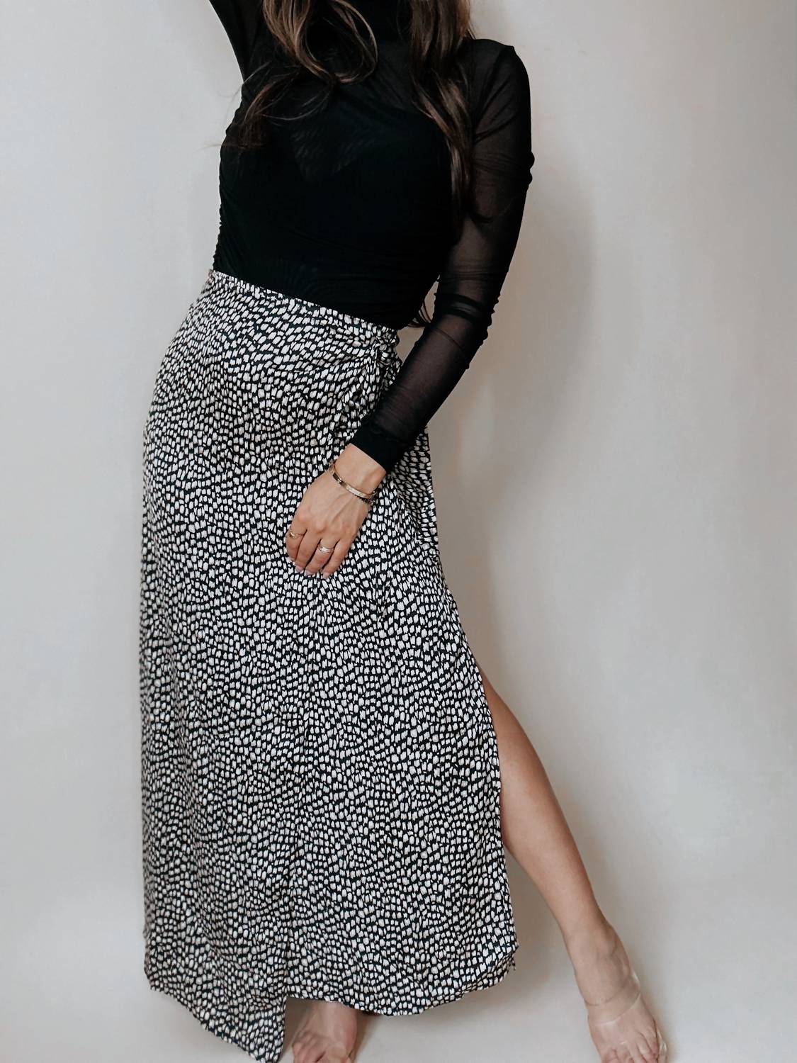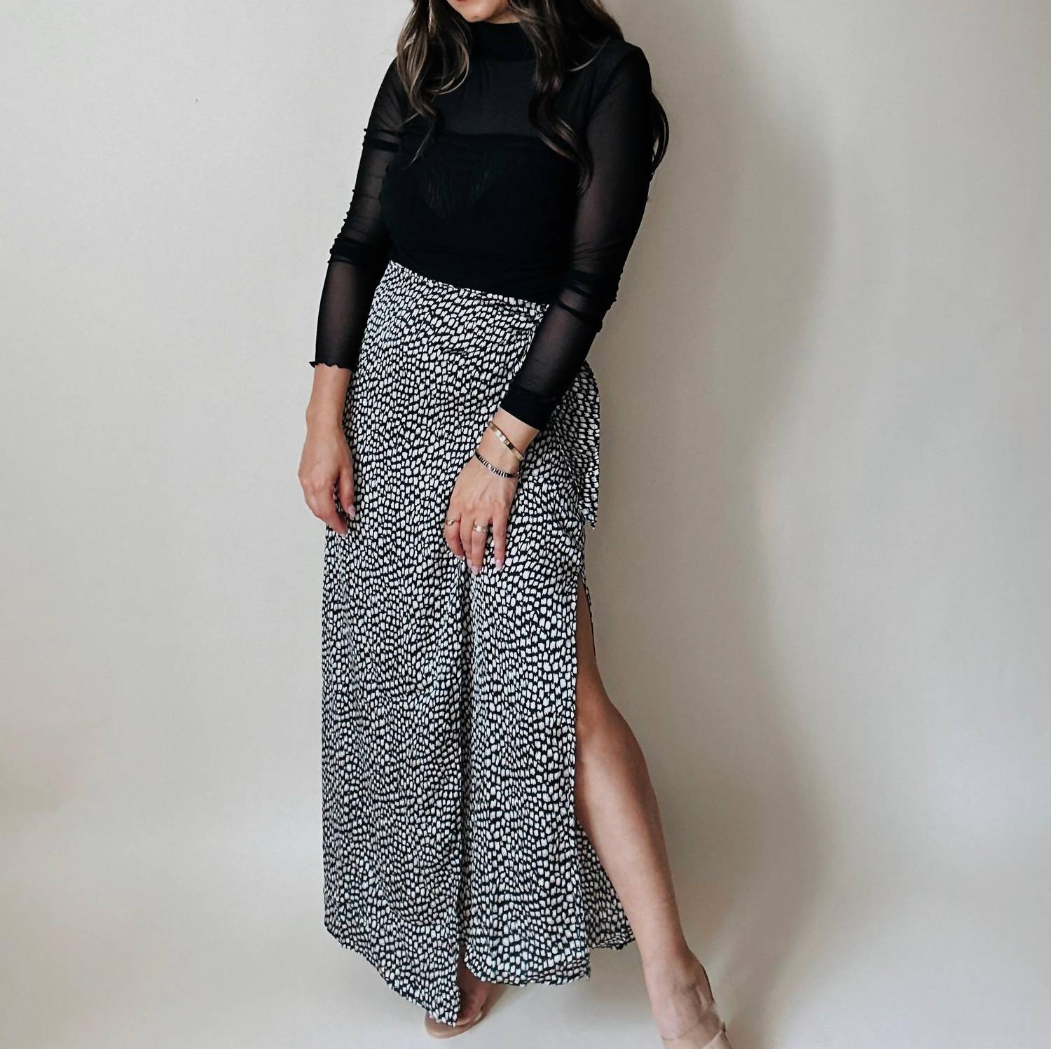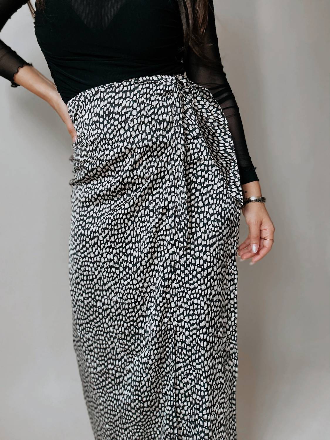 Tuck in your favorite tee for a more casual yet feminine look. Introducing the Angeles Animal Print Satin Wrap Skirt by PROMESA, a stunning piece that combines elegance with a boho chic flair. This maxi-length skirt showcases a modern black and cream animal print on lightweight satin fabric and features a side wrap detail with a sultry side slit. Made with a back zip closure, this piece is ideal for spring engagements and holiday celebrations. Note: Hand wash recommended; model Cristina is 5'1" wearing a size small.