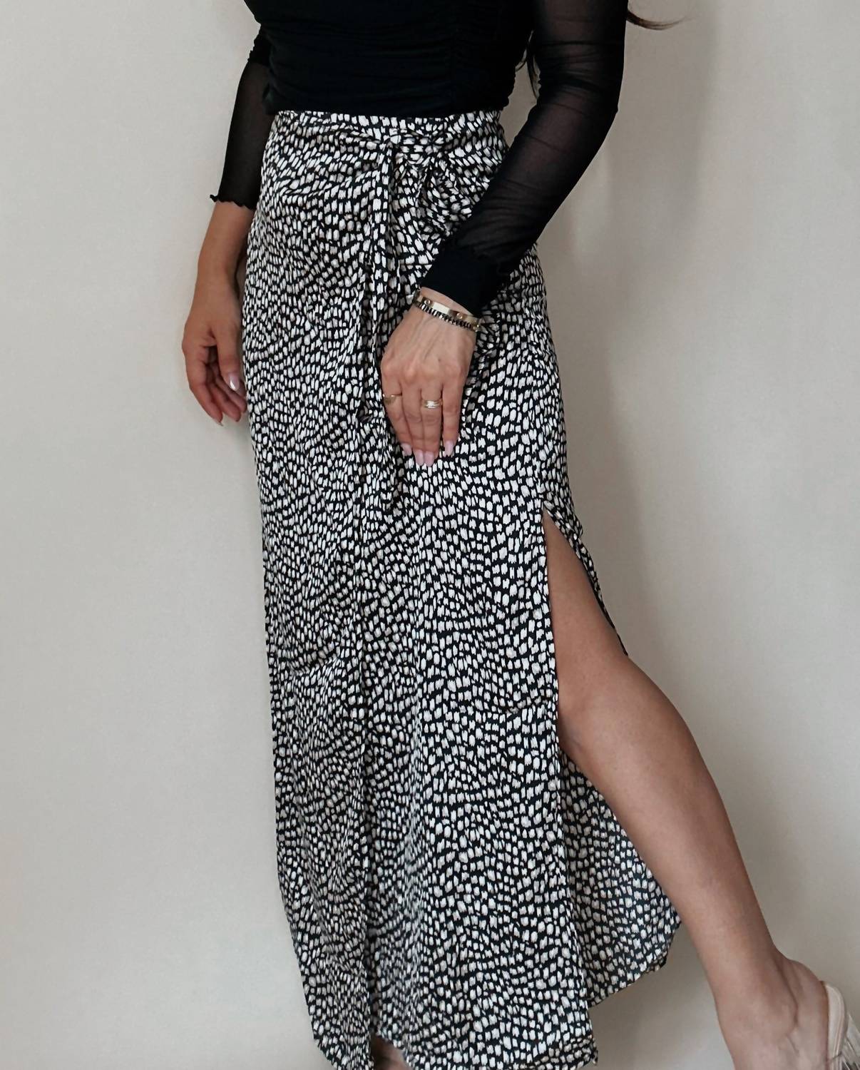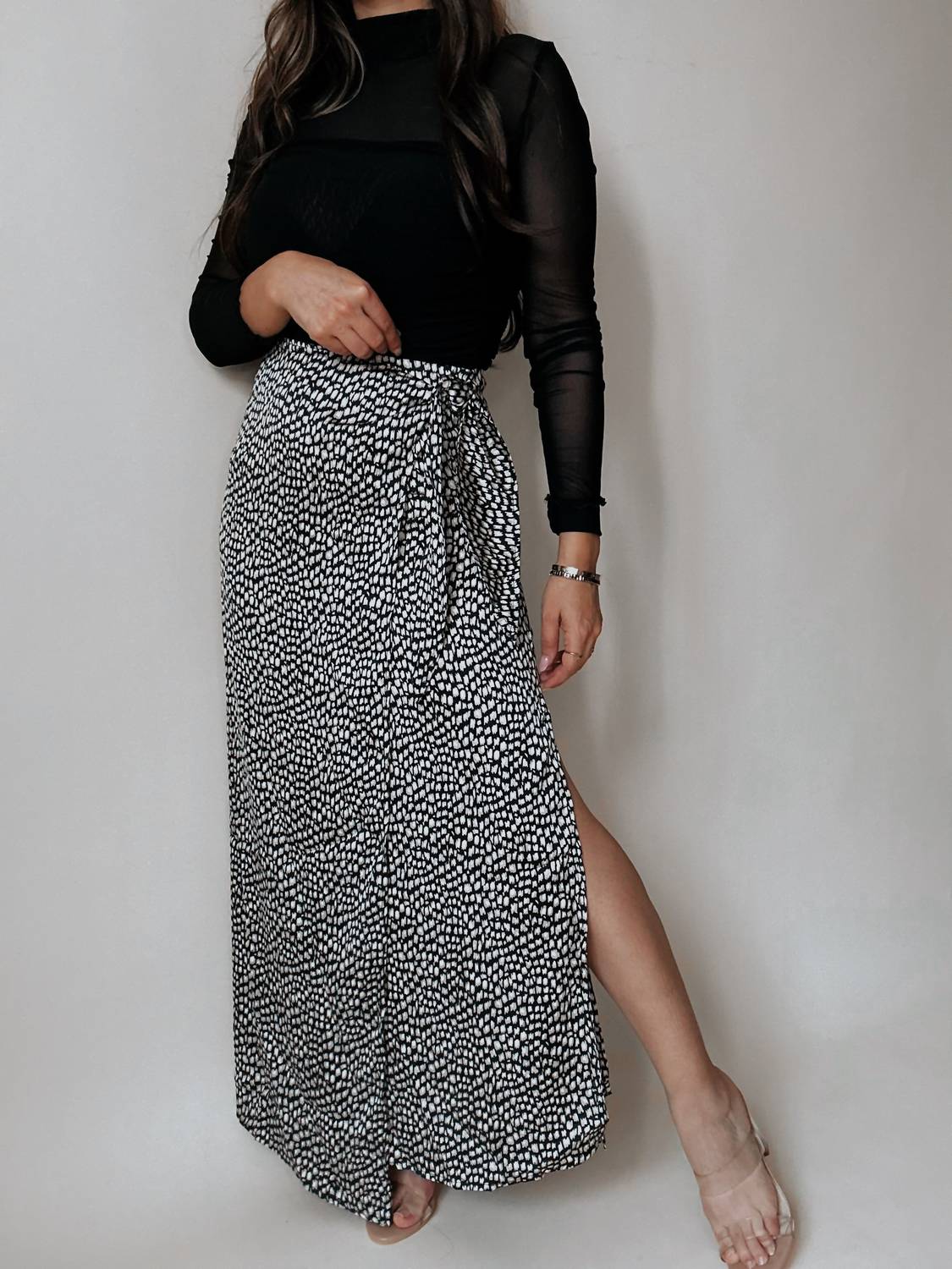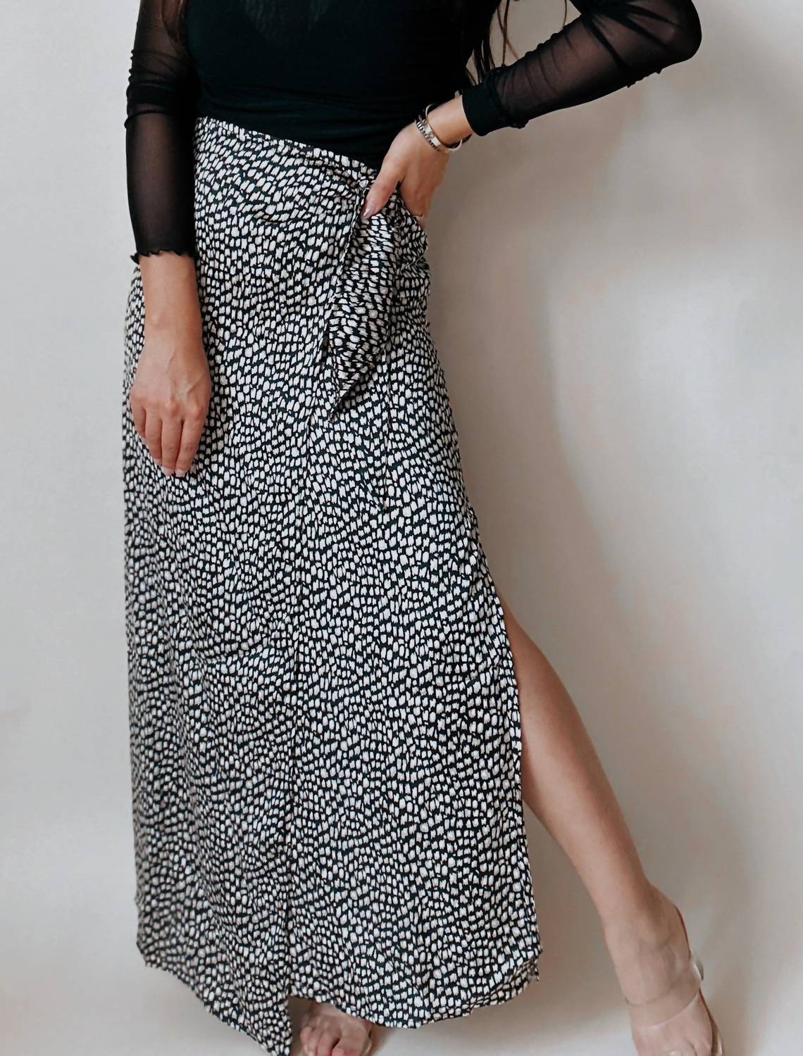 Tuck in your favorite tee for a more casual yet feminine look. Introducing the Angeles Animal Print Satin Wrap Skirt by PROMESA, a stunning piece that combines elegance with a boho chic flair. This maxi-length skirt showcases a modern black and cream animal print on lightweight satin fabric and features a side wrap detail with a sultry side slit. Made with a back zip closure, this piece is ideal for spring engagements and holiday celebrations. Note: Hand wash recommended; model Cristina is 5'1" wearing a size small.