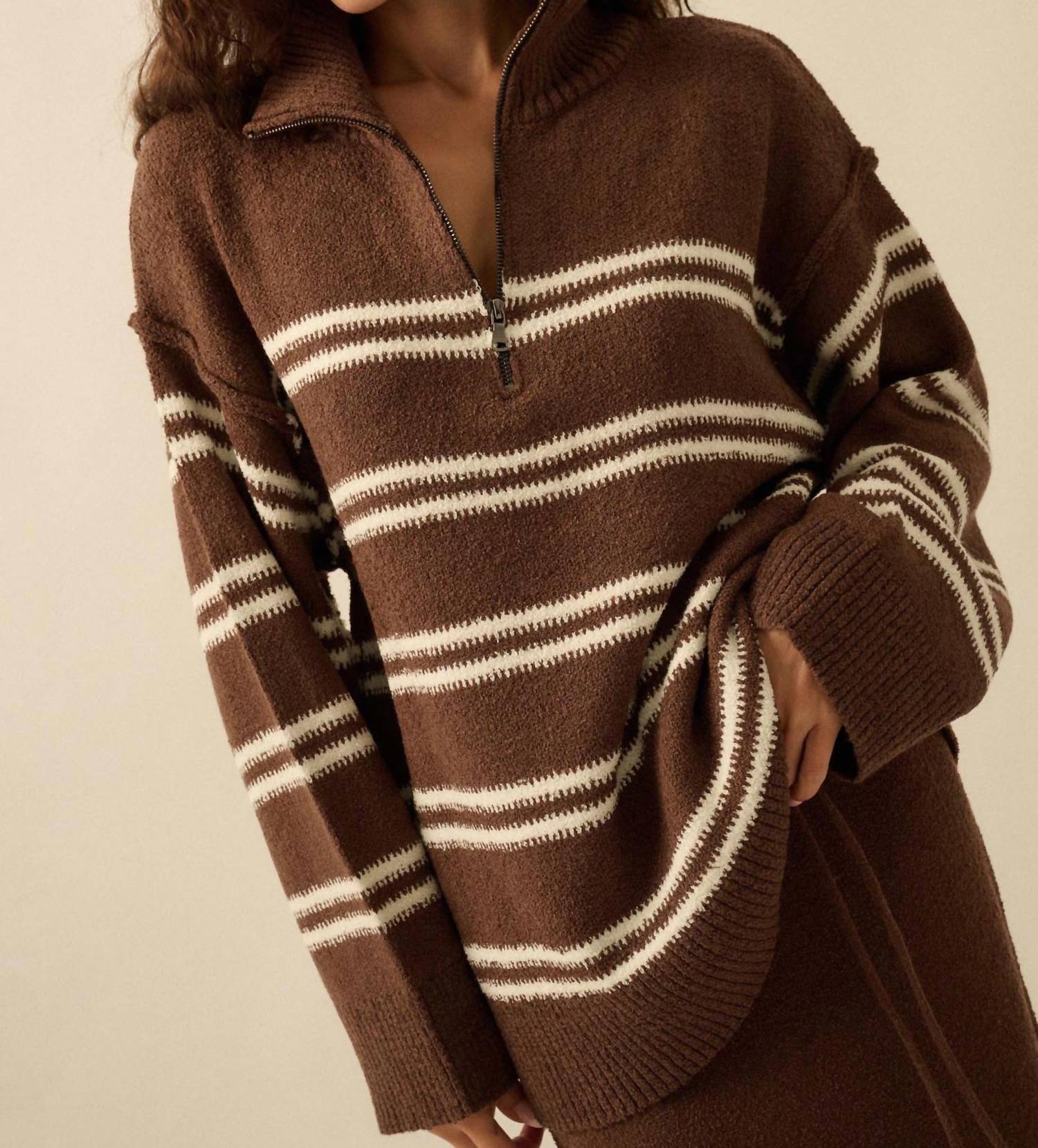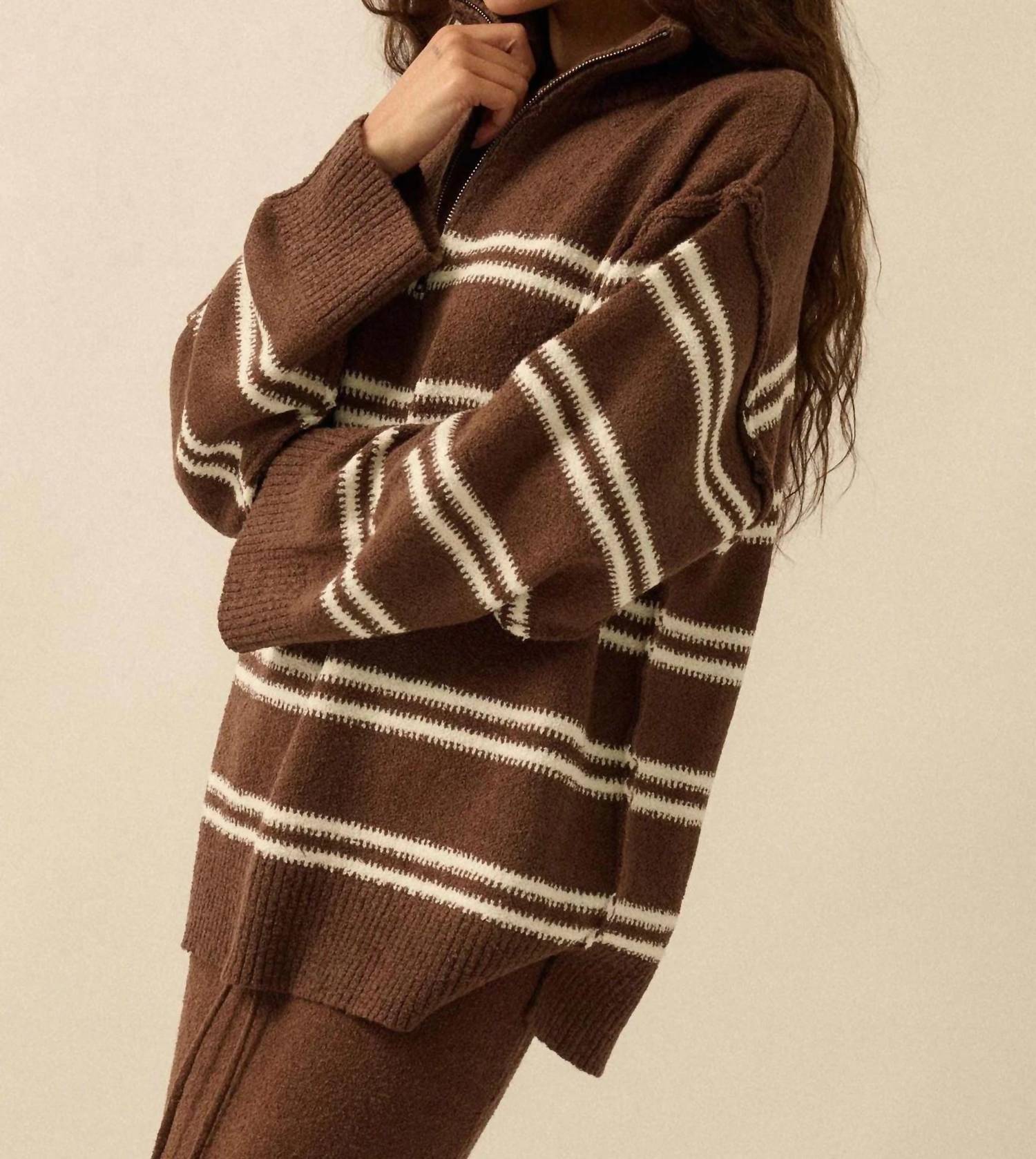 Wear this v-neck sweater with your favorite denim for the perfect fall look. Introducing the Striped Knit Quarter-zip Sweater by PROMESA, a cozy and stylish piece in a brown hue perfect for your fall wardrobe. This long sleeve sweater features a high collar, drop shoulder, and exposed shoulder seams for a relaxed, loose fit. Crafted from 100% polyester, it boasts a textured, striped pattern with ribbed knit details on the collar, cuffs, and hem, complemented by a practical side-split hem. Closure: Quarter-zip front closure. Country of Origin: Imported, designed in LA. Care: Hand wash, lay flat to dry.
