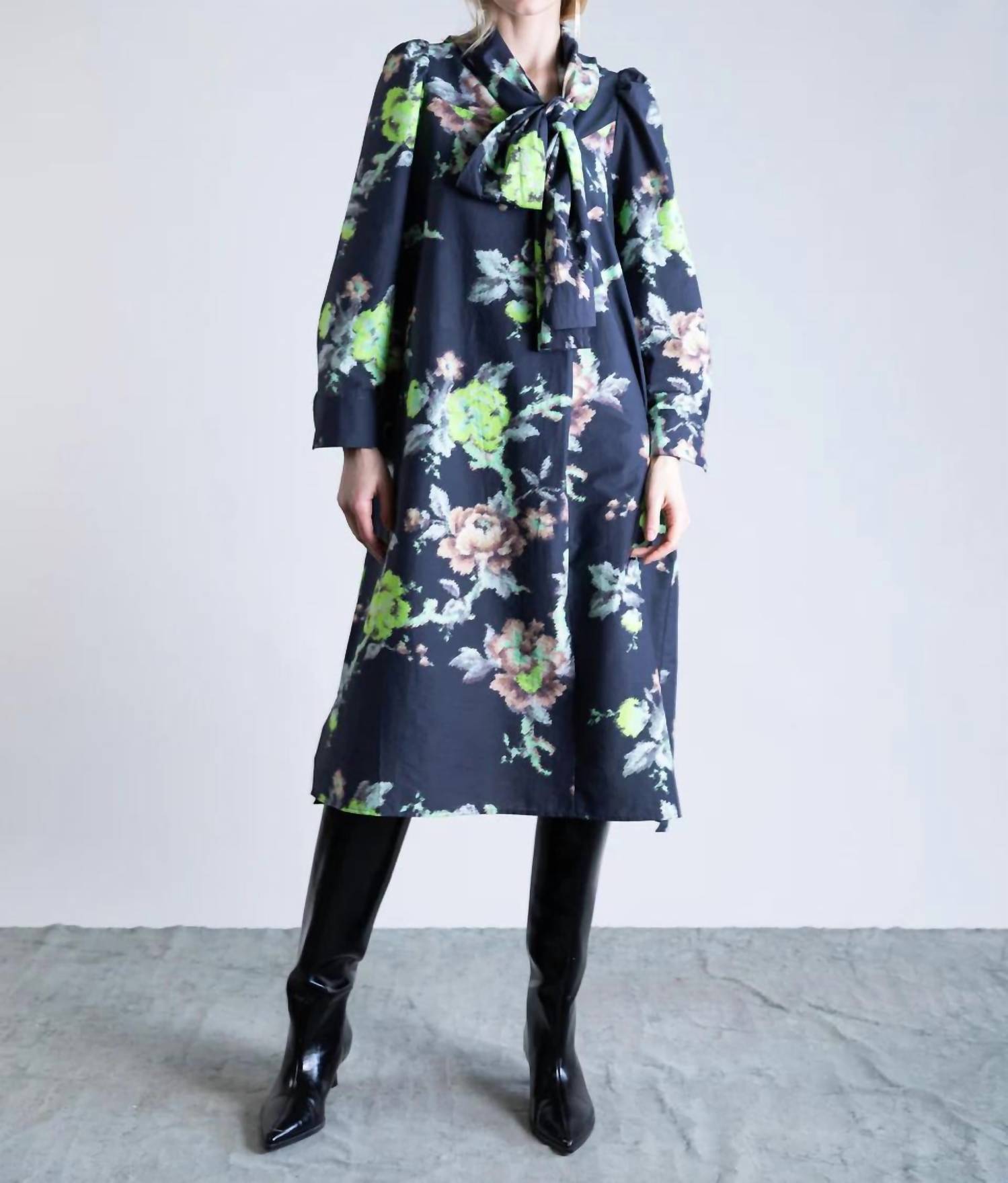 The perfect length dress does exist. Presenting the Indian Flower Juliet Sleeve Dress by Psophia, an exquisite piece that captures the essence of boho chic. This midi dress features long Juliet sleeves and a cowl neckline adorned with a poetic bow, perfect for evening events. Crafted from a blend of 82% cotton and 18% nylon, the fabric offers lightweight breathability and excellent durability. Closure: Pull on. Care: Dry clean only.