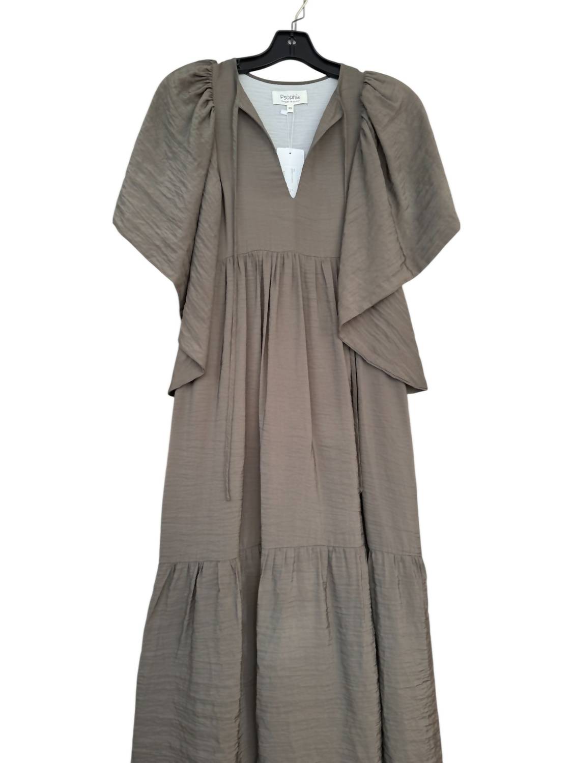 A maxi dress that is just as cute as it is comfortable. Relaxed bohemian piece in a stunning kaki hue ideal for a housewarming occasion. Short sleeve dress features a V-neck with a tie detail and wide flutter sleeves, offering a breezy silhouette perfect for spring. Crafted from a lightweight textured fabric with a semi-fitted bodice and a tiered skirt, a nod to 90s fashion. Pull on closure. Hand wash for lasting wear.