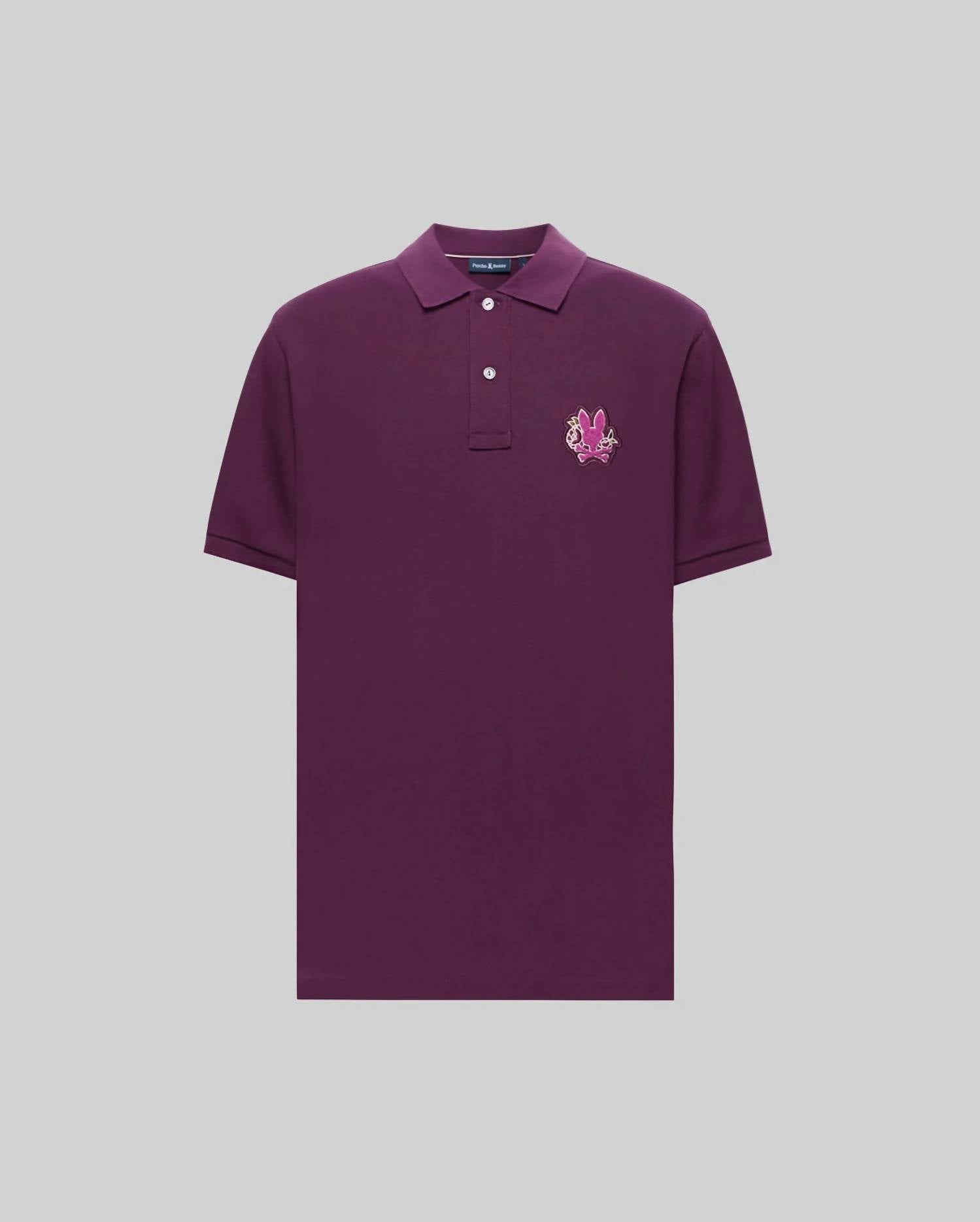 Introducing the Auguste Pique Polo by Psycho Bunny, a vibrant Potent Purple piece perfect for those seeking a modern twist on classic varsity style. This short-sleeve polo is crafted from 100% Pima cotton, offering a soft touch and exceptional breathability. Featuring a graphic design with chenille-patch floral detailing, it closes with a button closure and is proudly made in Peru. For best results, hand wash and lay flat to dry, ensuring the longevity of this striking addition to your spring wardrobe.