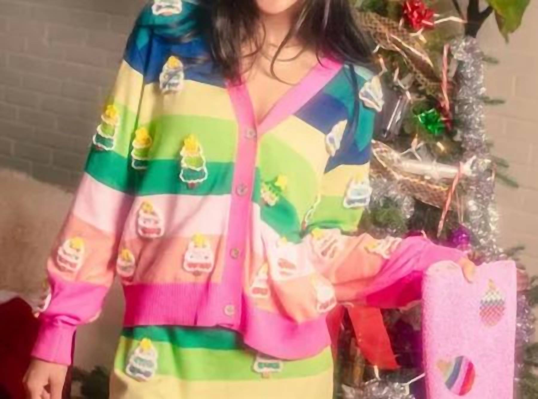 A classic fit that works just as good buttoned as it does left open. A soft, cozy knit cardigan featuring vibrant rainbow stripes and adorable crocheted and sequined Christmas tree appliqués. It features rhinestone buttons.