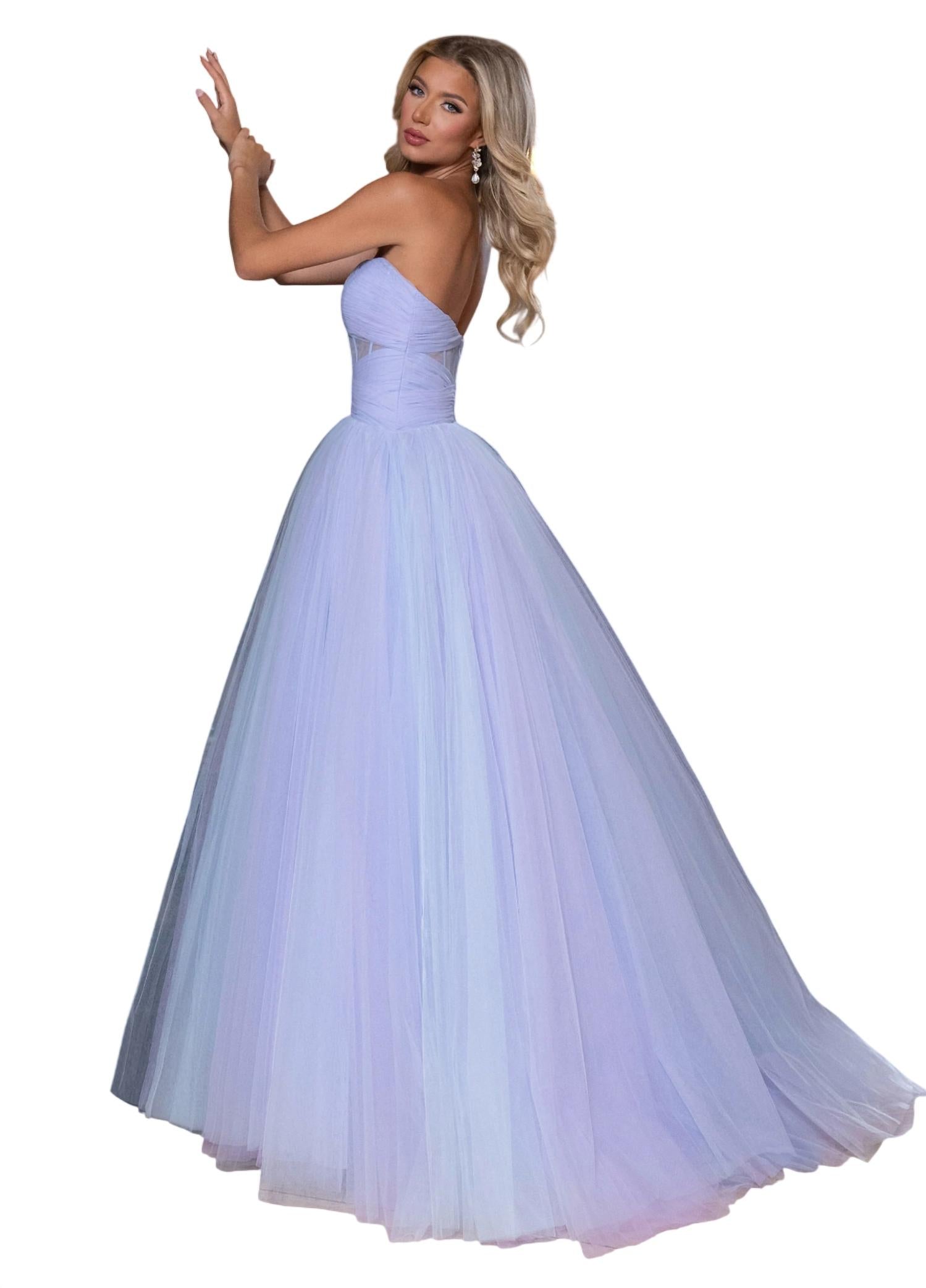 Just add a cute little clutch and a matching heel for the perfect event look. Look breathtaking in this dreamy pleated tulle ballgown, featuring a strapless A-line silhouette that balances classic elegance with modern design. The fitted bodice is accented by a contemporary sheer cutout that enhances the figure, while the voluminous skirt creates a captivating fairytale effect with every movement.