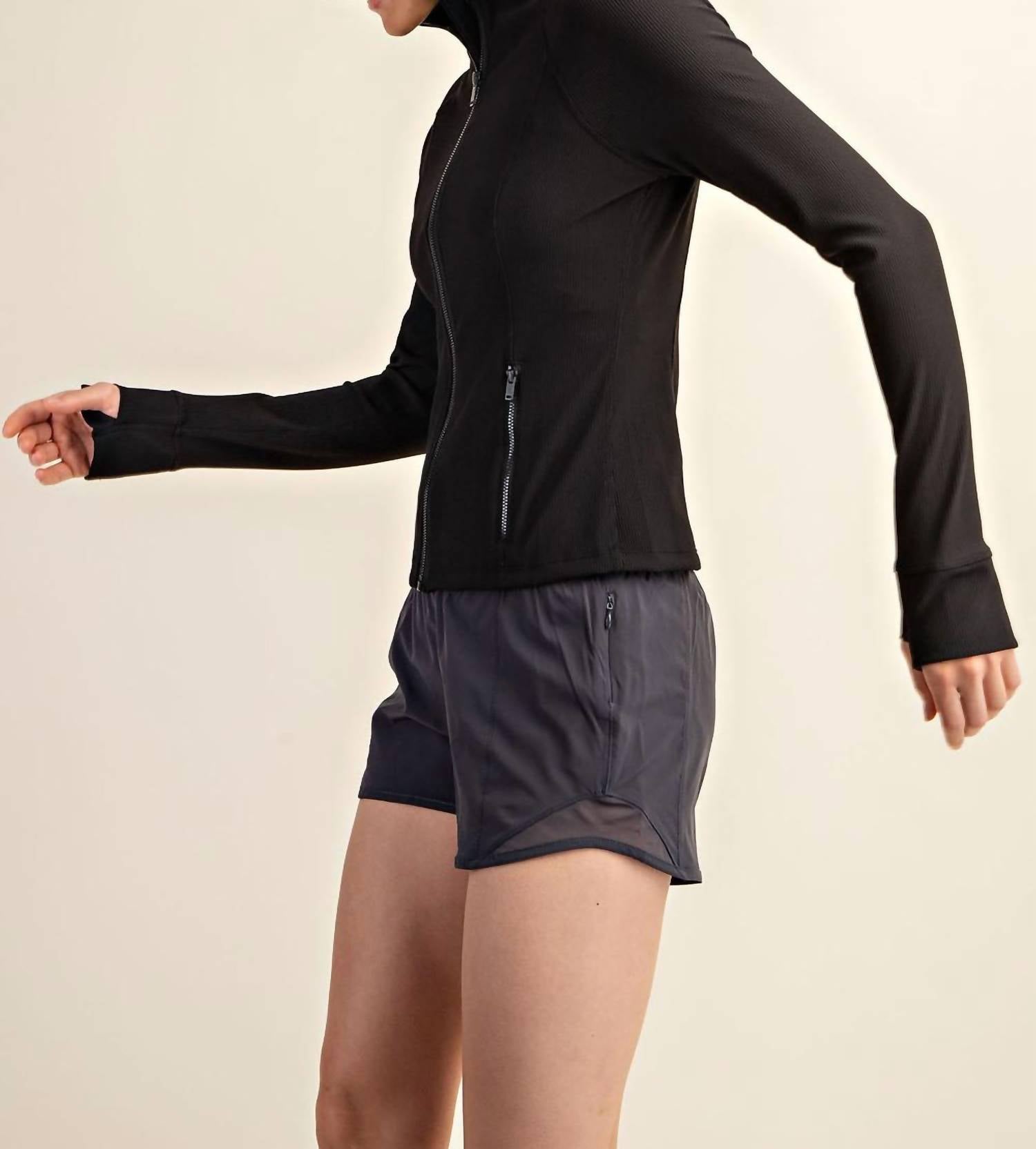 Cute, casual, and comfortable. This jacket is a must have. Introducing the Ivy Nylon Rib Jacket by RAE MODE, a stylish piece in solid black perfect for your athleisure wardrobe. It features long sleeves with thumbhole details, crafted from a butter-soft 2x2 Nylon Rib fabric with 4-way stretch for maximum mobility. Composition: 75% Nylon, 25% Spandex Knit. Closure: Full zip closure. Designed for fall, this slim-fit jacket offers side zip pockets and a chic mockneck, making it ideal for layering during your fitness sessions.