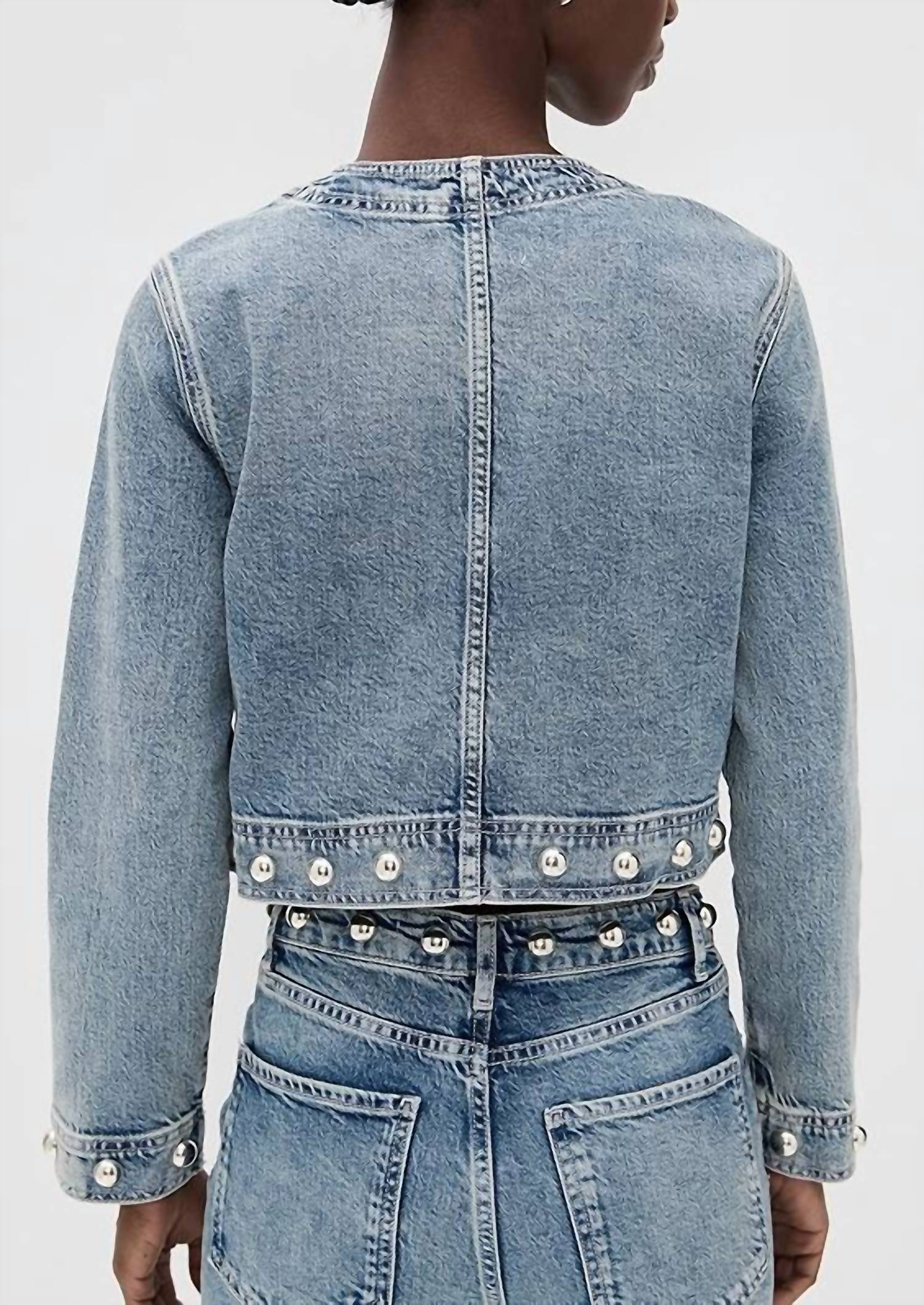 Throw this adorable jacket over just about anything for an effortlessly stylish look. The Capistrano Cropped Jacket by Rails is a chic addition in Desert Sky Studded that redefines the classic "lady" jacket. This long-sleeve piece is crafted from a cotton blend of 59% Cotton, 40% Lyocell, and 1% Elastane, offering comfort and a touch of elasticity. Its cropped, collarless design with rounded studs adds modern flair, and it features button closure and flap pockets for convenience. For care, dry clean only is recommended.