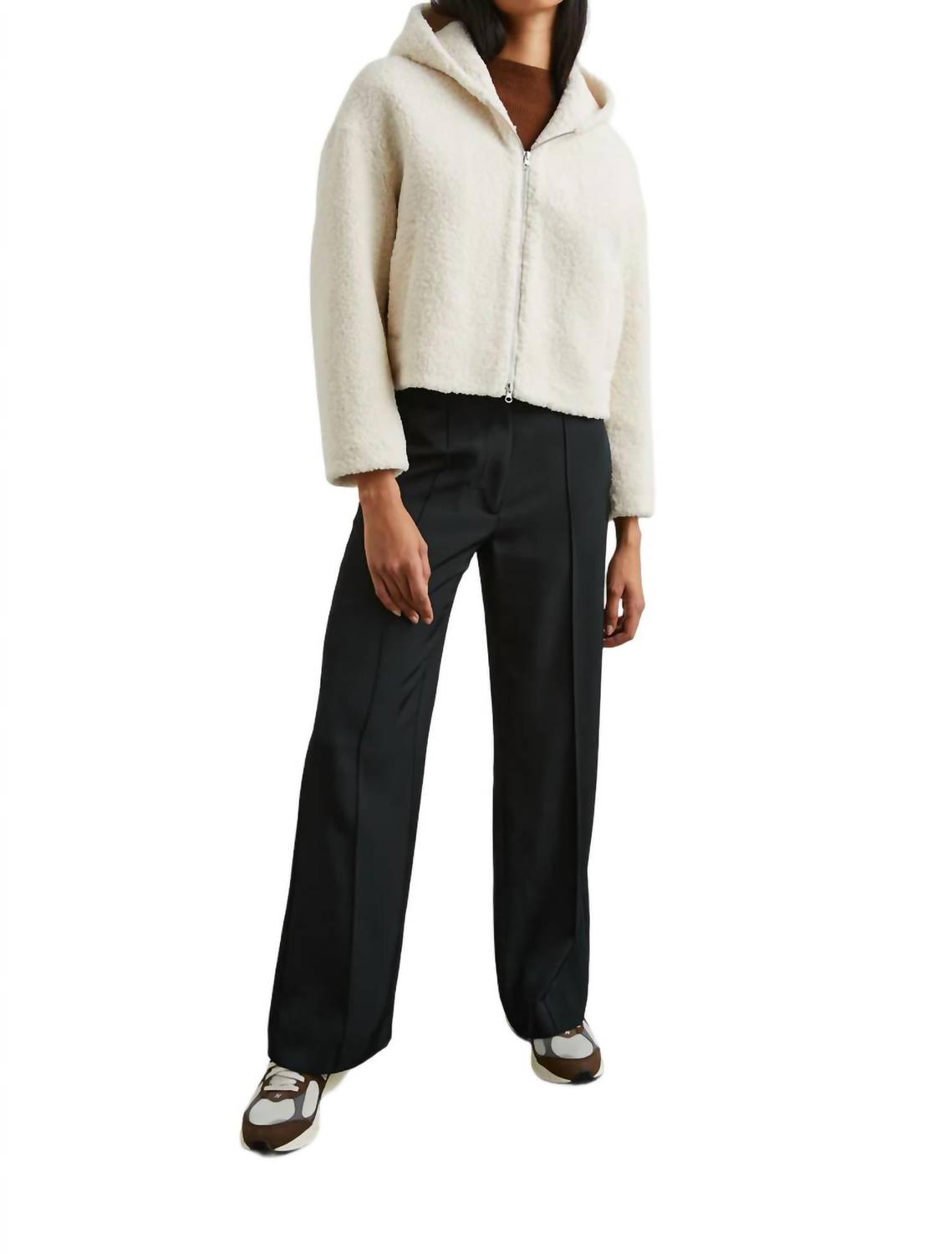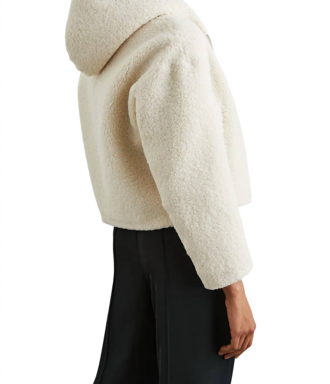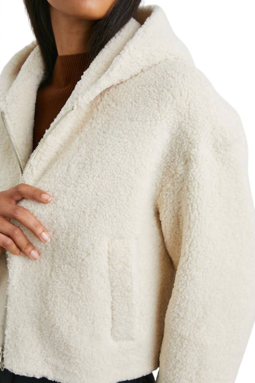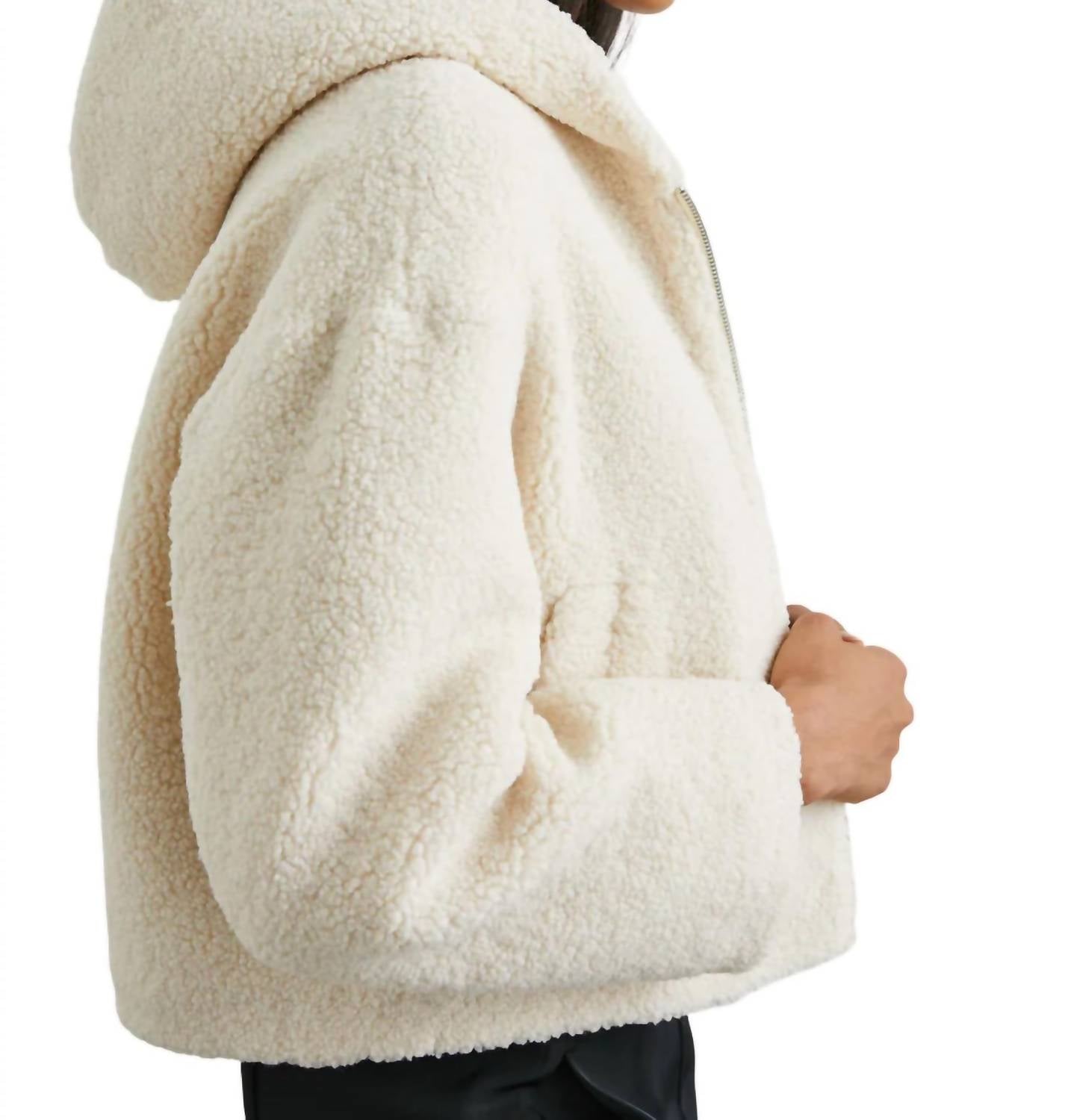 Make any outfit instantly cool by pairing it with this bomber jacket. The Fabi Jacket by Rails exudes chic simplicity with its cozy faux sherpa fleece crafted in an ivory teddy hue. This long-sleeve, hooded bomber offers a trendy minimalist silhouette with a cropped length of 22.5 inches, perfect for winter travel. Featuring a two-way adjustable zip closure and practical front pockets, it's designed for style and functionality. The jacket is composed of 100% polyester and requires dry cleaning to maintain its textured appeal.