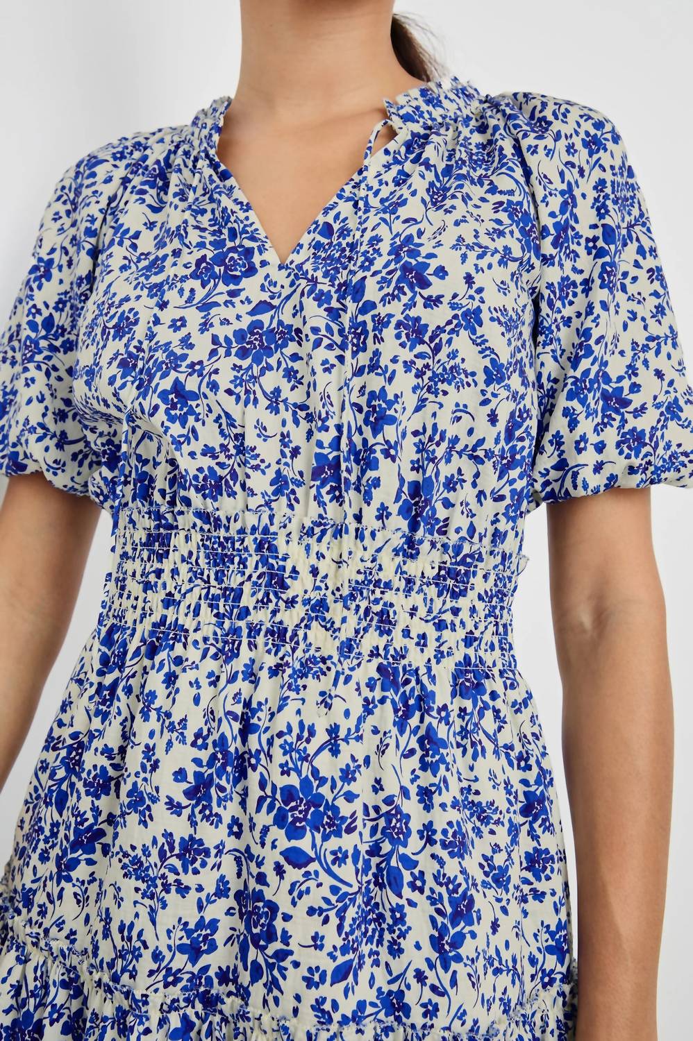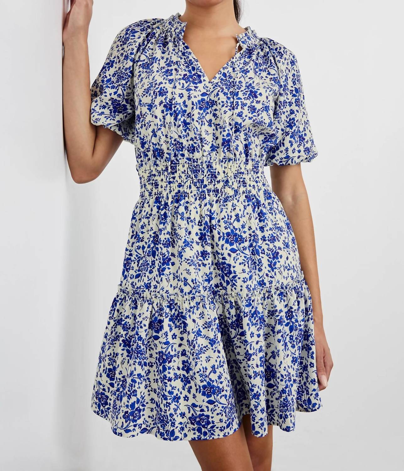 The perfect mini dress for those warmer months. Step into effortless elegance with the Fiorella Mini Dress by Rails, perfect for any dinner party or summer celebration. This Blue Marguerite floral dress showcases short peplum sleeves and a plunging V-neckline, crafted from 100% lightweight Viscose crinkle chiffon. Designed with a shirred waist that beautifully transitions into a lined, tiered skirt, it offers a flattering fit and flare silhouette. Made for ease with a pull-on style, this boho chic piece is imported and measures a front body length of 35 1/2" in size S. Care for it by hand washing in cold water and line drying it in the shade.