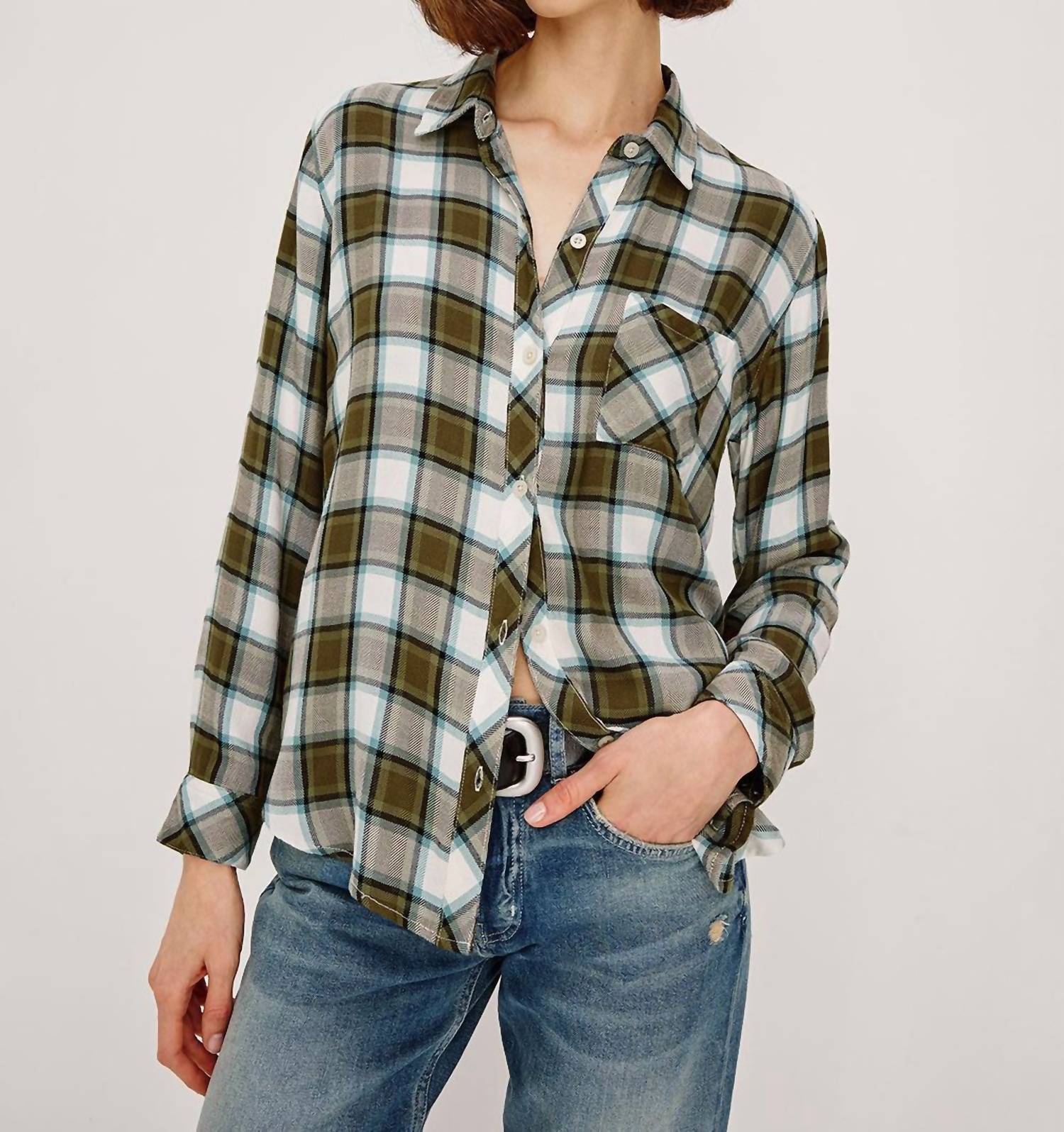 The perfect long sleeve tee that goes with just about anything. Elevate your wardrobe with the Hunter Long Sleeve Shirt by Rails, an embodiment of heritage style in a gorgeous Olive Stone Blue plaid. Crafted from 100% rayon, this shirt showcases a luxuriously soft and fluid feel reminiscent of cashmere, perfect for both all-season versatility and comfort. The button closure and collar neckline add timeless elegance, complemented by the practicality of pockets. Maintain its luxurious finish with a hand wash in cold water and line dry to keep it looking its best.