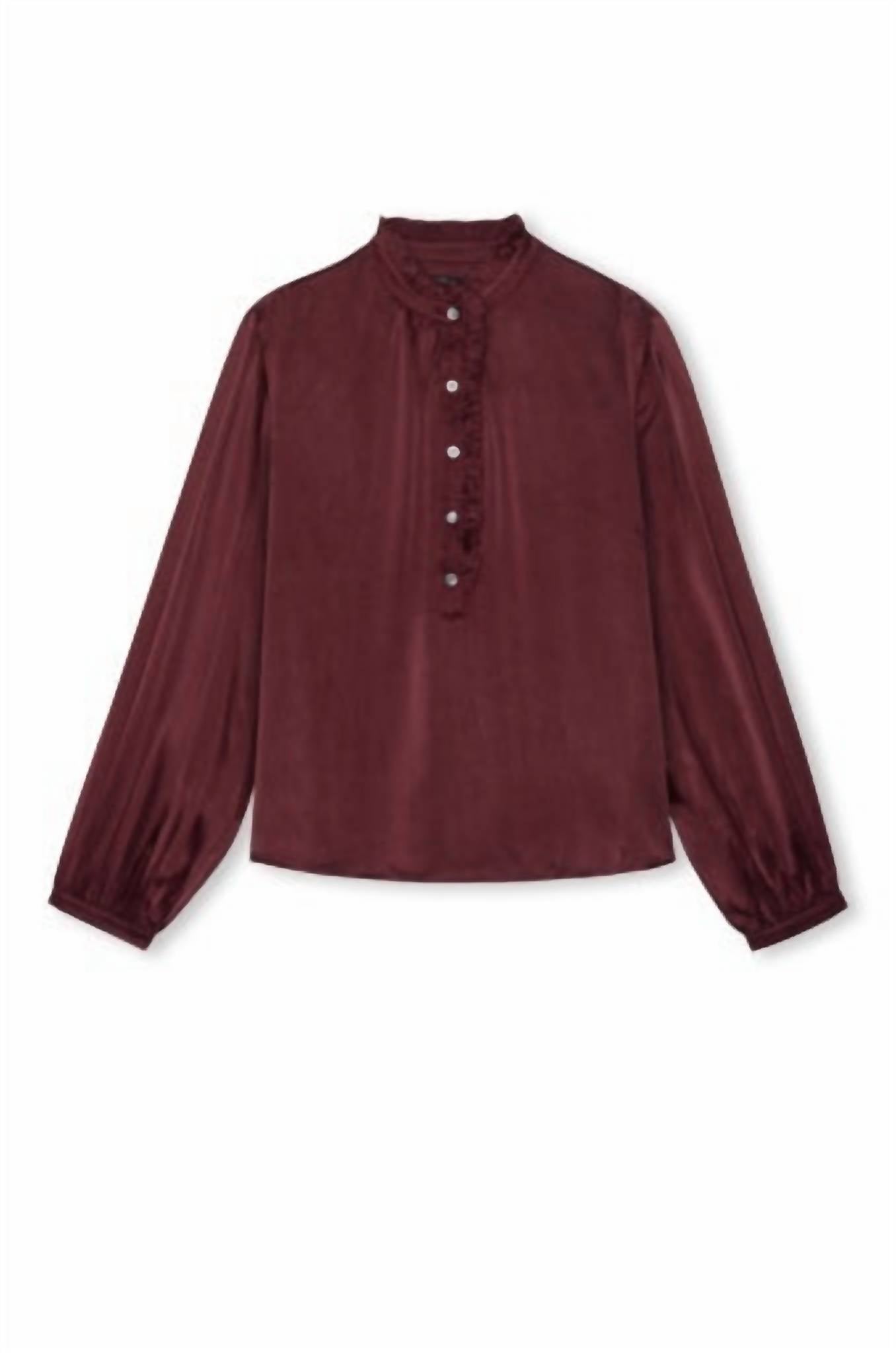 Pair this with your favorite jeans and slides for your next girls night out. Elevate your wardrobe with the Sien Blouse by Rails in a rich Garnet hue, designed for the modern minimalist. This long-sleeve piece features a stand-up collar and a loose-fitting, straight silhouette, perfect for cocktail parties or fall occasions. Crafted from 100% silk with a solid pattern, it offers luxe comfort without compromising style. Button closure.