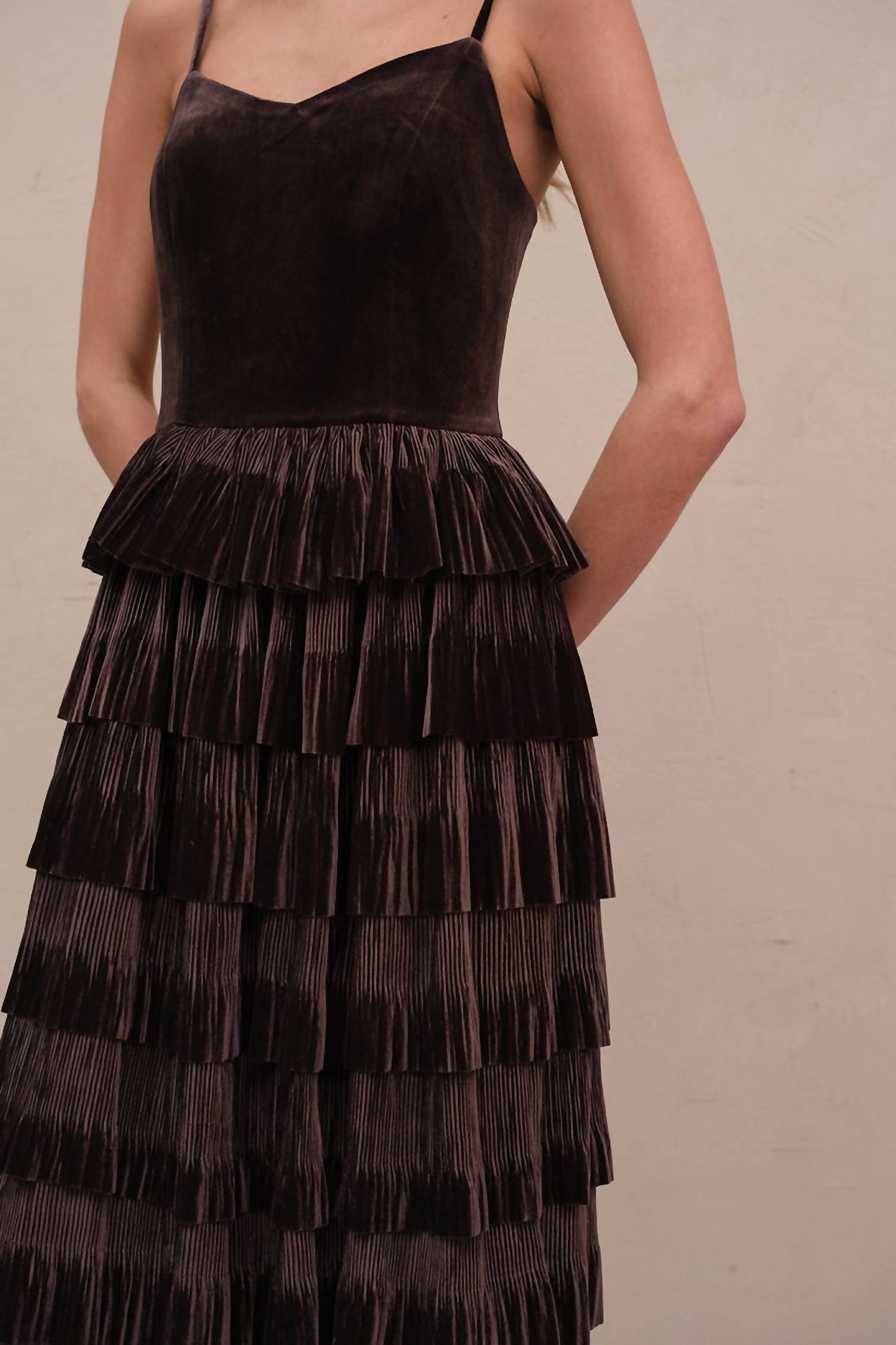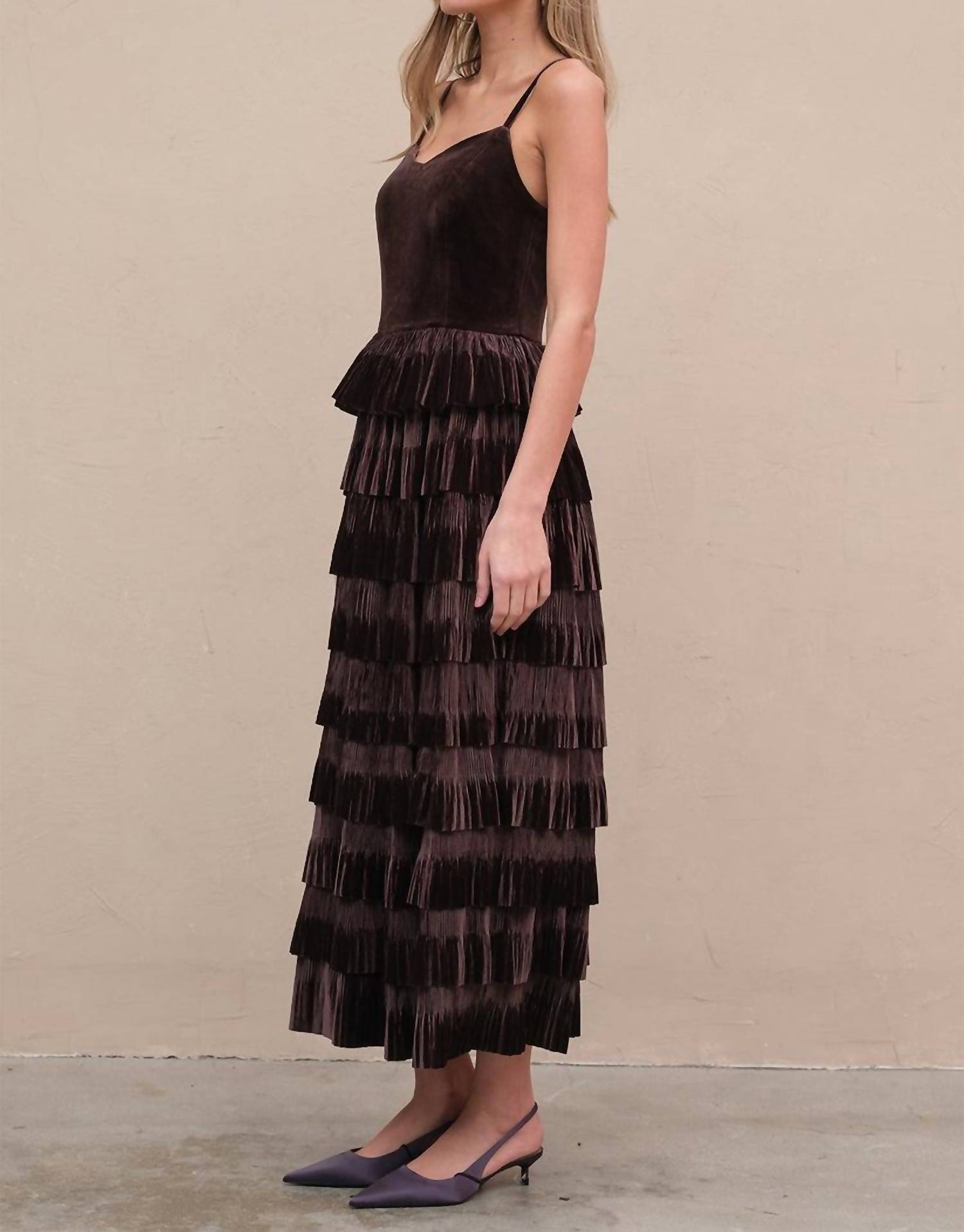 The perfect length dress does exist. Elevate your evening ensemble with the Velvet Pleated Tier Dress by Raisonnel, a sophisticated choice in rich brown. This women's A-line midi features spaghetti straps and a cascading tiered silhouette of luxe pleats, exuding elegance and texture. Designed with adjustable shoulder straps and a side invisible zipper for a flattering fit, its fully lined interior ensures comfort throughout any special occasion or evening event. Perfectly complementing the monochrome trend, this dress is an ideal choice for spring soirées or Easter celebrations.