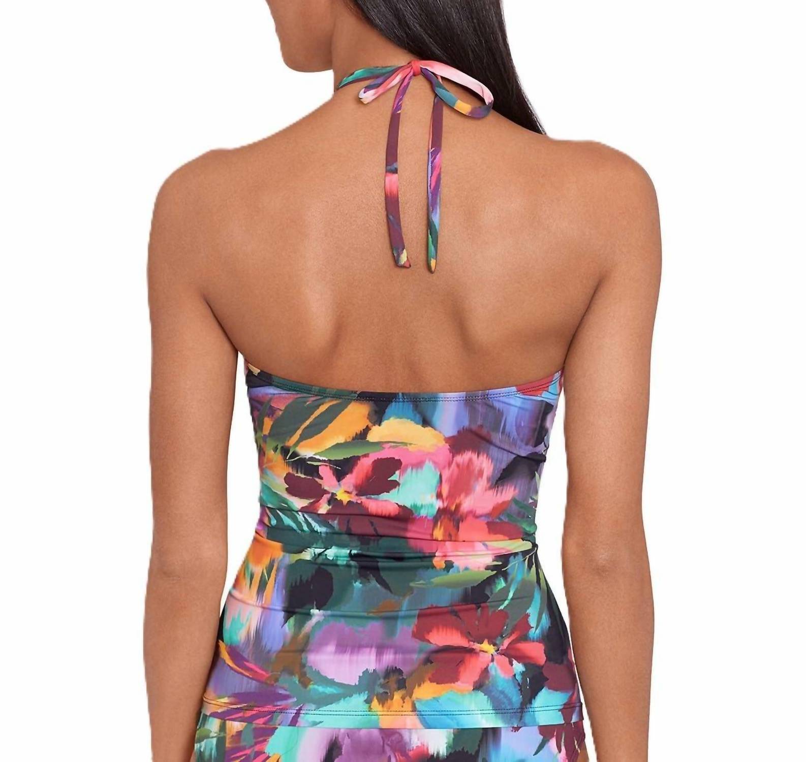 This cute and flattering swimsuit is perfect for making a splash at the pool, lounging on sun-kissed beaches, and staying stylish throughout the upcoming summer season. Dive into summer with the Printed Halter Tankini Swim Top by Ralph Lauren, perfect for a stylish beach day. This women's swim top showcases a floral pattern in black and multi-color, embodying the boho chic trend. With its tankini style and cheeky coverage, it's designed for both comfort and flair. Care instructions are not available.