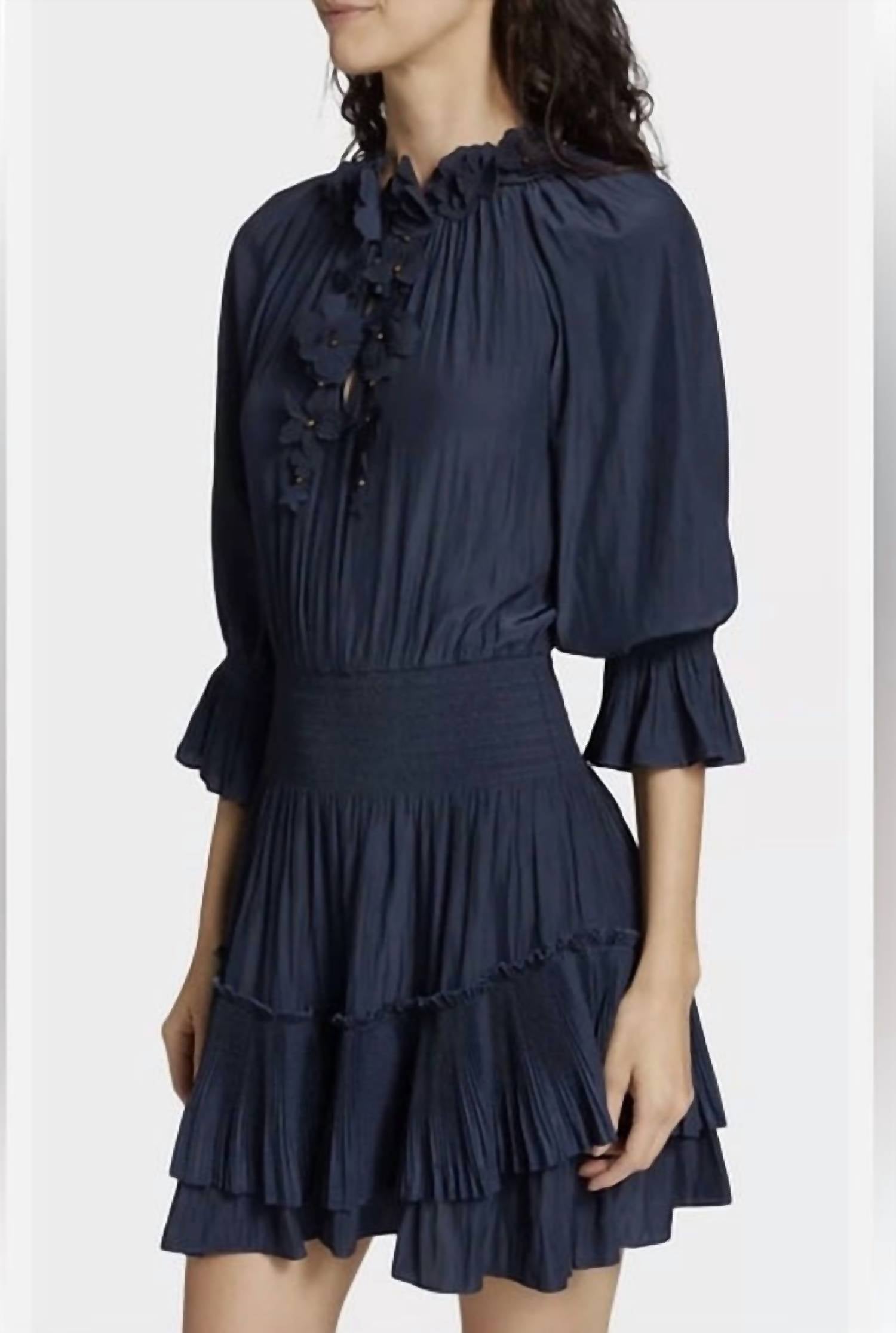 The kind of easy and flattering dress you'll be reaching for all season long. This playful mini dress is perfect for special occasions, featuring a radiant finish with delicate floral embroidery and appliqués that add charm and texture. Soft pleats flow throughout the design, complemented by a high neckline, three-quarter flared sleeves, a smocked waist, and a tiered hem for a flattering, whimsical silhouette. It is finished with a button-front closure and crafted from 100% polyester. Hand wash.