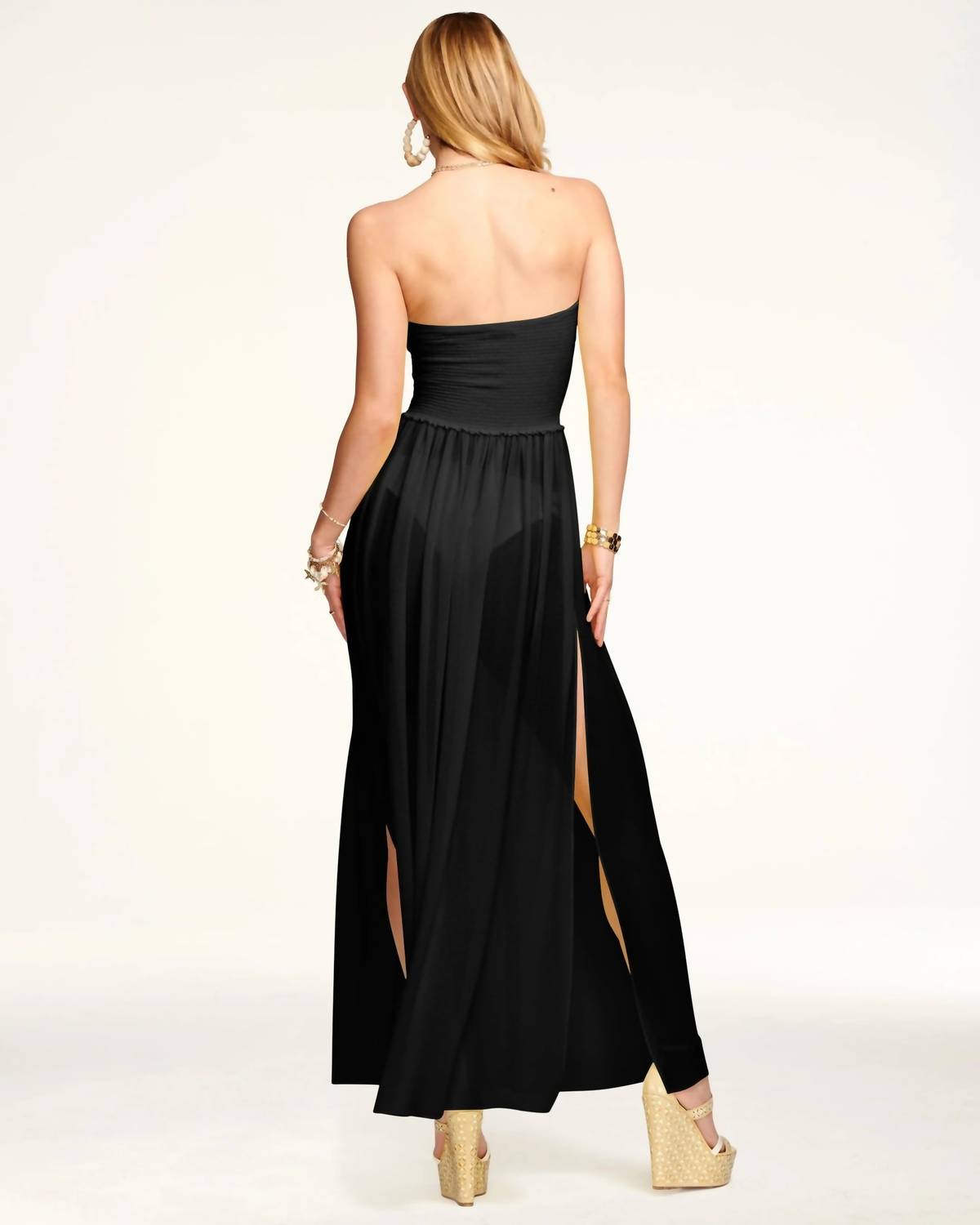 Style this maxi with your favorite statement necklace and sandals for the perfect look. The Calista Maxi Dress by Ramy Brook is an elegant piece perfect for a beach or poolside day. Designed in classic black, this strapless dress is crafted from 100% polyester, featuring a fit and flare silhouette with side slits for added movement. It's a pull-on style, making it easy to slip into after a swim. For care, simply hand wash and line dry to maintain its stunning appearance.